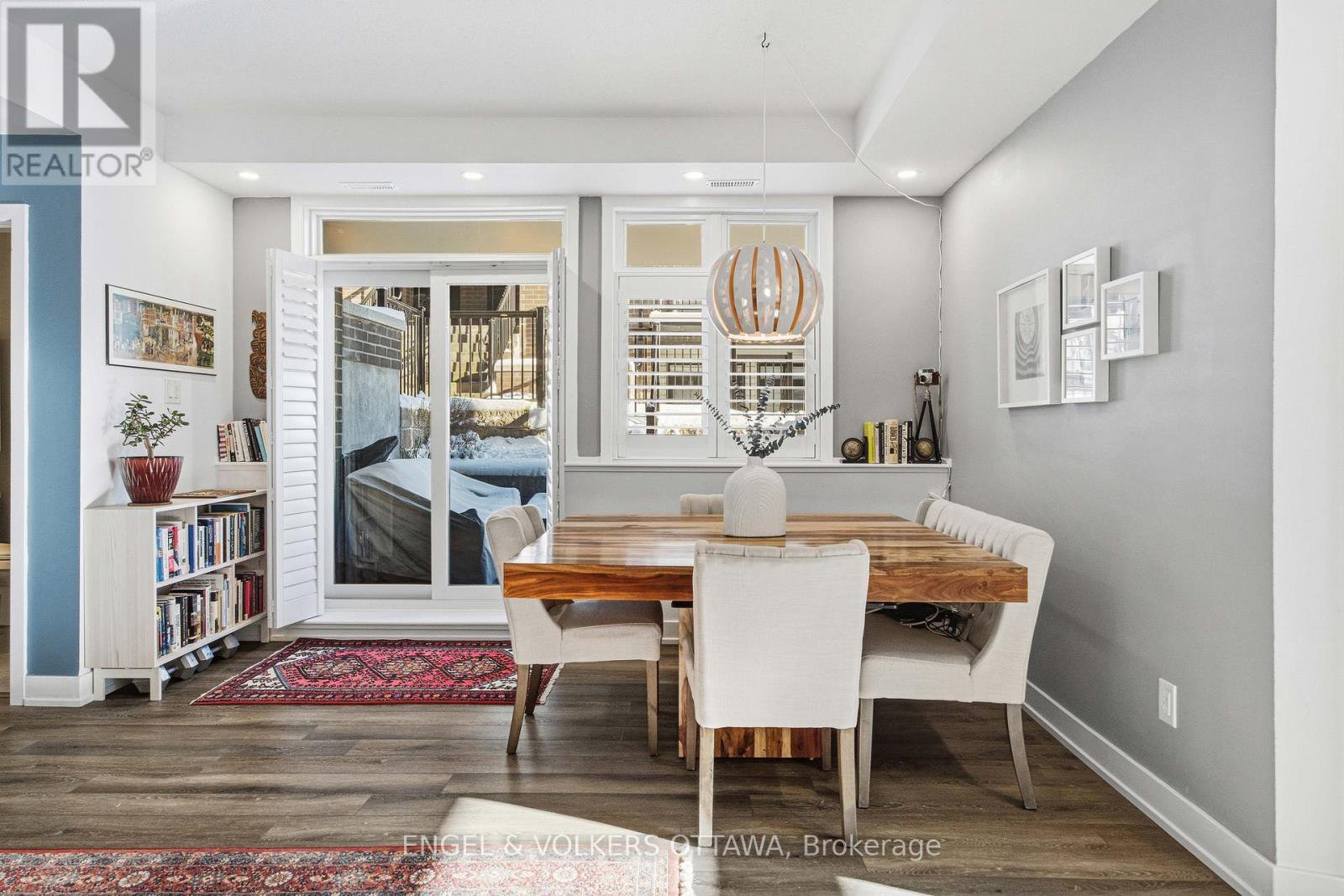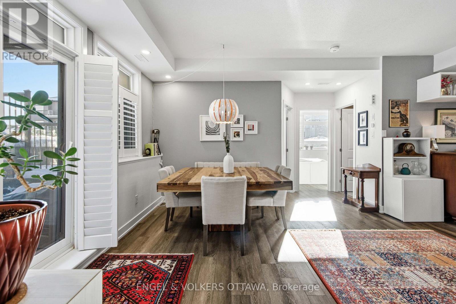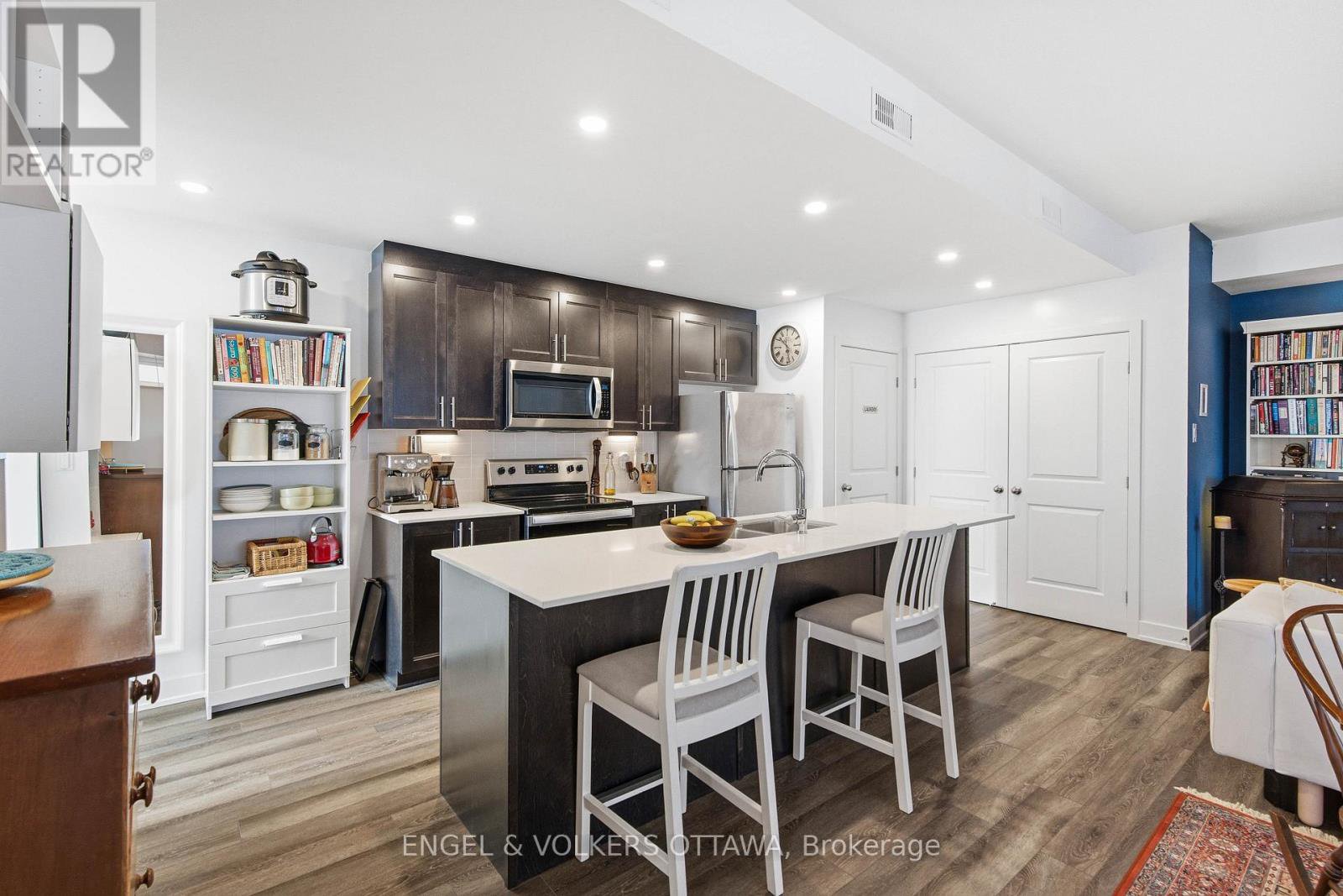 Welcome home to Zen Urban Flats, a modern and thoughtfully designed condo community in the heart of Kanata, offering low condo fees of $258.57 per month. This smart and functional unit features 2 bedrooms, 1.5 bathrooms, and a private terrace ideal for outdoor living. The open concept layout is perfect for both everyday living and entertaining, highlighted by quartz countertops, stainless steel appliances including a brand new Bosch dishwasher, pot lights, and custom California shutters throughout. Upon entry, you are welcomed by high ceilings and a convenient front hall closet. The kitchen features an oversized island that seamlessly overlooks the living and dining areas, creating a bright and inviting space.Step through the sliding doors to your private exterior terrace, perfect for relaxing with an evening glass of wine or hosting guests. Parking is included, along with visitor parking for added convenience. First occupied in 2024, the home includes approximately five years remaining on the Tarion warranty. Ideally located close to public transit, trails, parks, shopping, and excellent schools, this home offers an exceptional balance of comfort, style, and lifestyle.