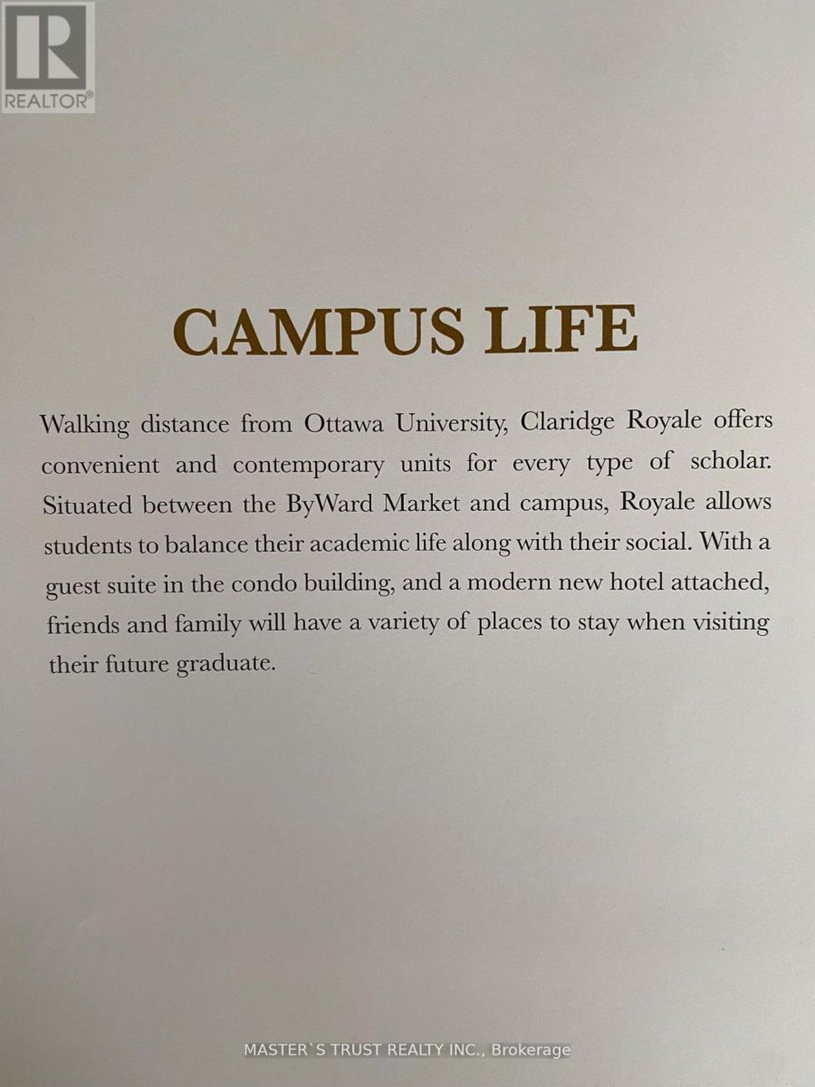 A new Building only one year old, This Studio perfectly blending modern luxury & the lively ByWard Market! This remarkable condos more than just a home; it's a way of life. Enjoy the convenience of a Metro grocery store w/direct indoor access, making your dailyerrands a breeze. The open-concept layout features large windows, in-unit laundry, upgraded hardwood & a sleek modern design. The kitchen is equipped with high-end quartz countertops, stainless steel appliances, & premium cabinetry. With expansive floor-to-ceilingwindows, this unit is bright & filled w/natural light. Enjoy amenities such as an indoor swimming pool, fitness center, sauna, lounge, astylish lobby, high-speed elevators, & visitor parking. Conveniently located near the University of Ottawa, Byward Market, Rideau Centre Al