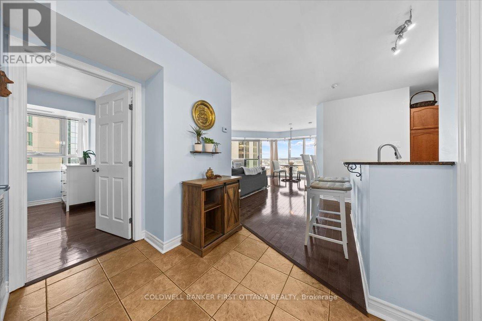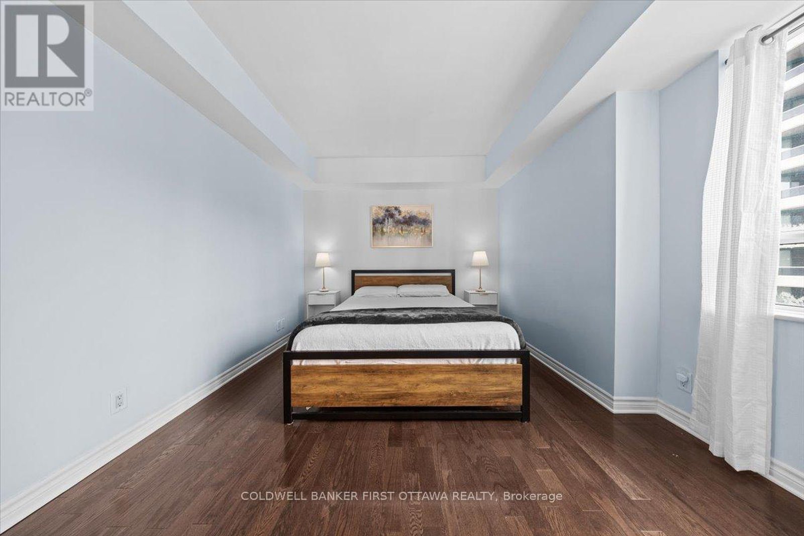 Welcome to this beautifully designed, open-concept condominium. Conveniently located two blocks from Lyon LRT Station, homeowners are minutes away from premier grocery shopping, Parliament Hill, Byward Market, vibrant restaurants and entertainment venues, as well as the future Ottawa Public Library and Ottawa's financial core. Floor-to-ceiling windows flood the living and dining areas with natural light, highlighting the sleek hardwood floors and open living design. The warm kitchen boasts a breakfast bar, granite countertops, and abundant cabinetry-perfect for culinary creativity and entertaining. Retreat to the spacious master bedroom featuring a walk-in closet and a luxurious 4-piece ensuite. A second generous bedroom with double closet offers flexibility for guests or a home office. Enjoy the convenience ofin-suite laundry, a 4-piece main bath with ceramic flooring, underground parking (P1 #7), and a private storage locker (level 2 #86). Building amenities also include bike storage, as well as a common/party room complete with kitchen, bathroom, and ample seating.