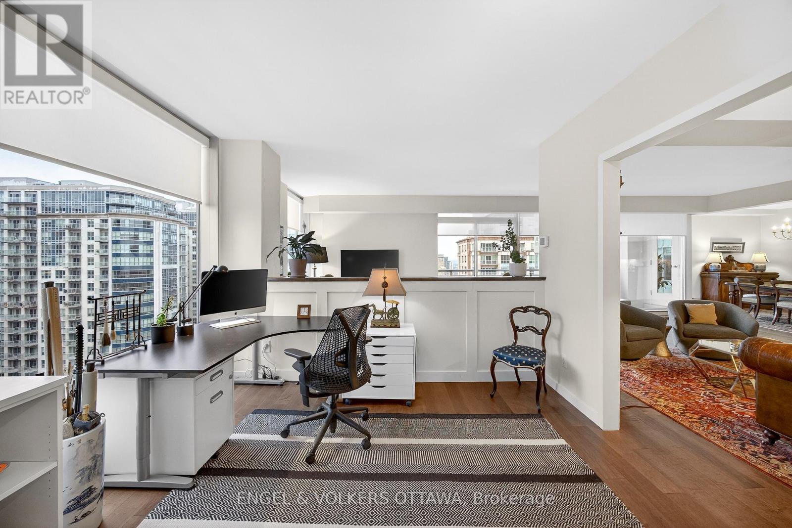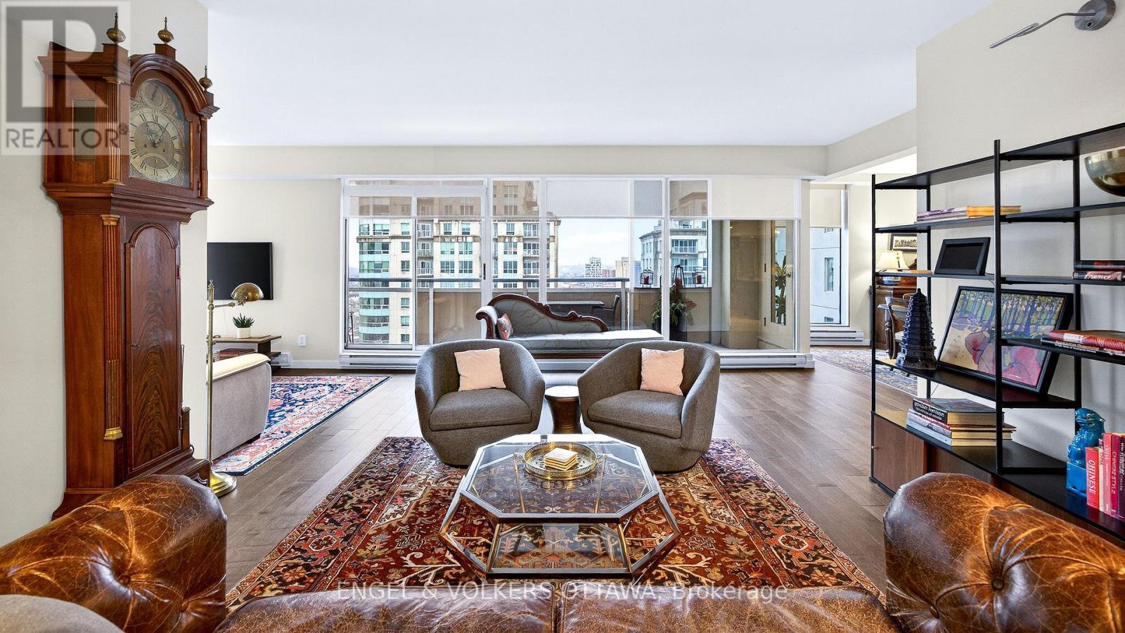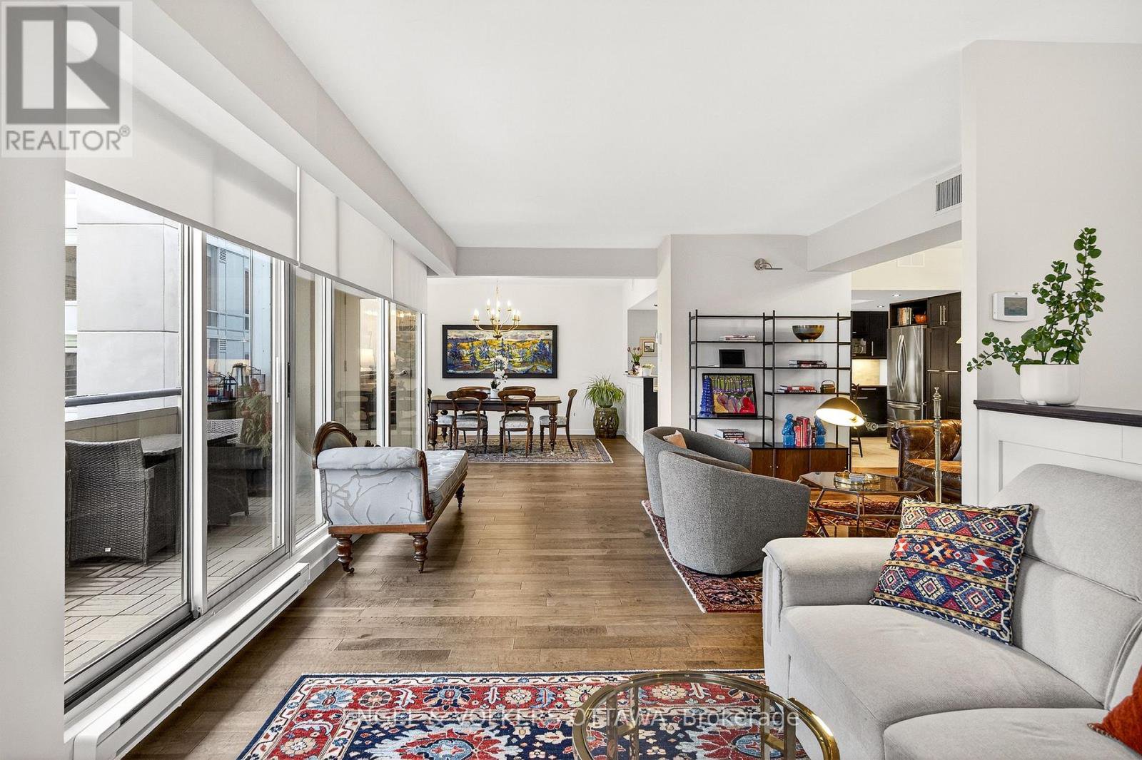 This beautifully appointed immaculate penthouse suite is a sophisticated expression of luxury located in the heart of the ByWard Market.Offering an elevated urban lifestyle defined by expansive spaces, light, and effortless walkability. With a notably open and airy floor plan, 2 balconies and refined contemporary finishes throughout, this residence is ideal for those who appreciate both vibrant city living and private, well-considered design. Sweeping vistas of the cityscape from every room, boasting approximately 2140 square feet. The spacious foyer sets the tone, welcoming you with natural light and elegance. The main living areas unfold seamlessly, combining formal, dining, kitchen, and family room spaces into one expansive, cohesive environment. Rich hardwood flooring grounds the interior, while oversized windows and balcony access enhance the sense of volume and flow-perfect for entertaining. The gourmet kitchen is both stylish and functional, featuring stone counters, abundant cabinetry, and a dining island. Thoughtfully integrated into the open-concept layout, it allows the cook to remain connected to guests and conversation, perfect for hosting. The primary suite is generous in scale and quietly positioned for privacy. It accommodates a bedroom area, sitting space, balcony, ensuite bathroom and a walk-in closet plus a walk thru closet. Currently arranged to provide a den, office, or library space, the room can easily be converted back to a 2nd bedroom. A thoughtfully designed space with custom built-ins ensure versatility without compromising style, making the space equally well-suited for guests, remote work, or creative pursuits (murphy bed could be added). A full secondary bathroom and in-suite laundry complete the functional side of the plan. The building delivers a refined, hotel-like experience with an impressive collection of amenities. One of Ottawa's most iconic destinations, Parliament Hill, restaurants, cafés, galleries, shopping, all steps away.