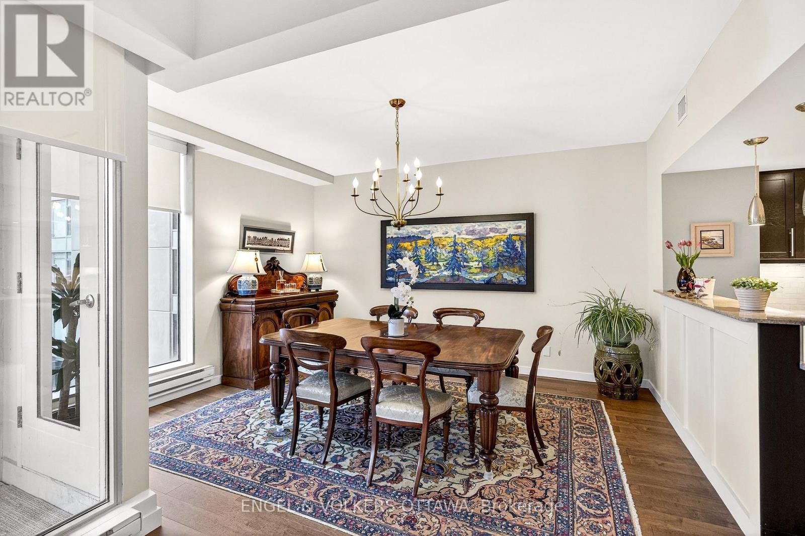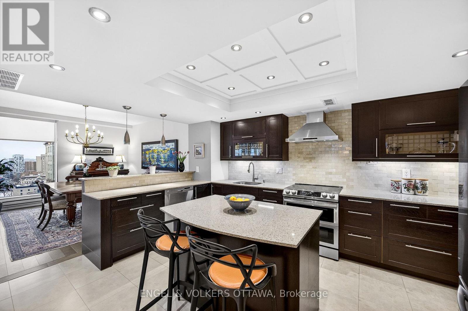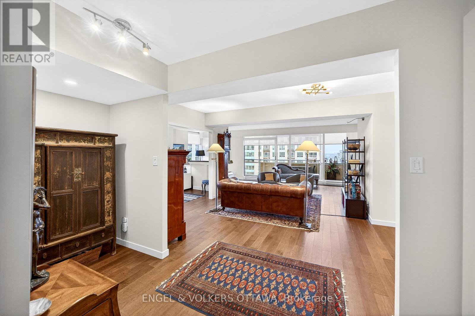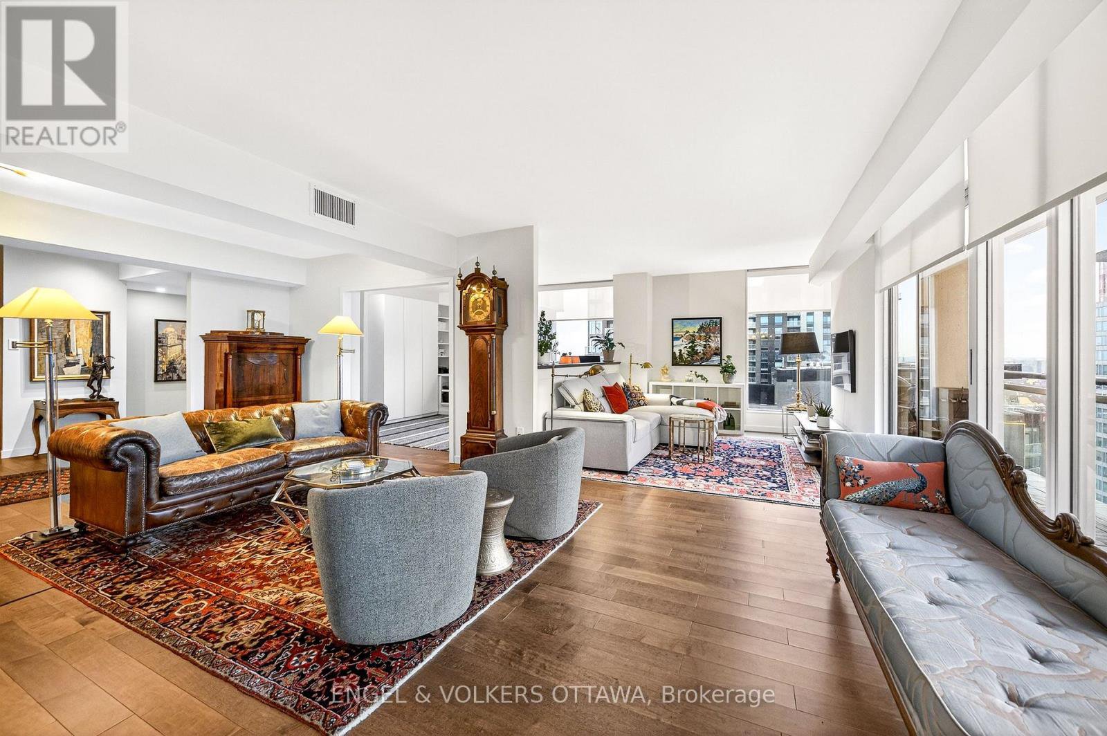 This beautifully appointed immaculate penthouse suite is a sophisticated expression of luxury located in the heart of the ByWard Market.Offering an elevated urban lifestyle defined by expansive spaces, light, and effortless walkability. With a notably open and airy floor plan, 2 balconies and refined contemporary finishes throughout, this residence is ideal for those who appreciate both vibrant city living and private, well-considered design. Sweeping vistas of the cityscape from every room, boasting approximately 2140 square feet. The spacious foyer sets the tone, welcoming you with natural light and elegance. The main living areas unfold seamlessly, combining formal, dining, kitchen, and family room spaces into one expansive, cohesive environment. Rich hardwood flooring grounds the interior, while oversized windows and balcony access enhance the sense of volume and flow-perfect for entertaining. The gourmet kitchen is both stylish and functional, featuring stone counters, abundant cabinetry, and a dining island. Thoughtfully integrated into the open-concept layout, it allows the cook to remain connected to guests and conversation, perfect for hosting. The primary suite is generous in scale and quietly positioned for privacy. It accommodates a bedroom area, sitting space, balcony, ensuite bathroom and a walk-in closet plus a walk thru closet. Currently arranged to provide a den, office, or library space, the room can easily be converted back to a 2nd bedroom. A thoughtfully designed space with custom built-ins ensure versatility without compromising style, making the space equally well-suited for guests, remote work, or creative pursuits (murphy bed could be added). A full secondary bathroom and in-suite laundry complete the functional side of the plan. The building delivers a refined, hotel-like experience with an impressive collection of amenities. One of Ottawa's most iconic destinations, Parliament Hill, restaurants, cafés, galleries, shopping, all steps away.