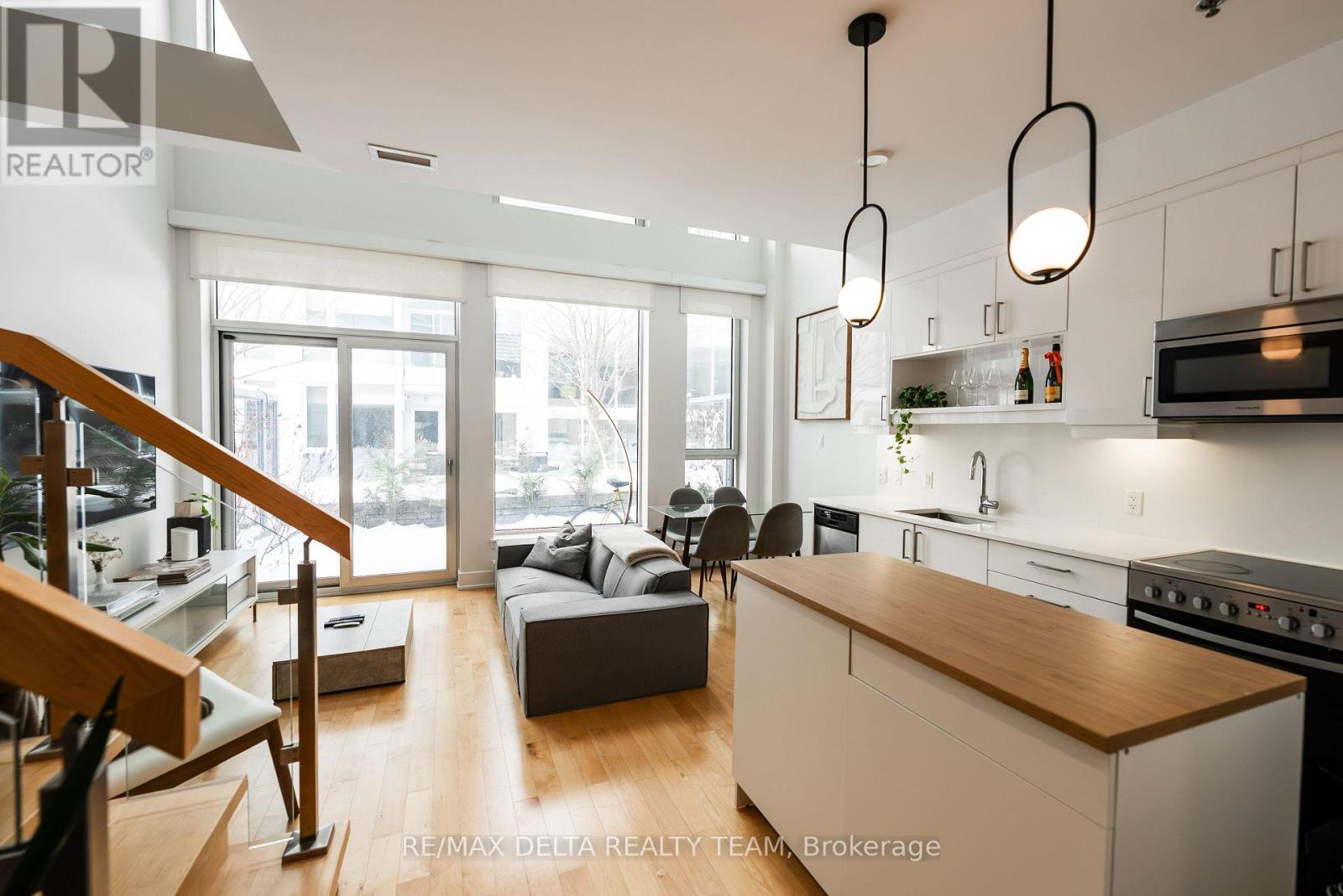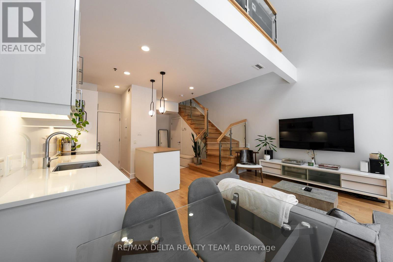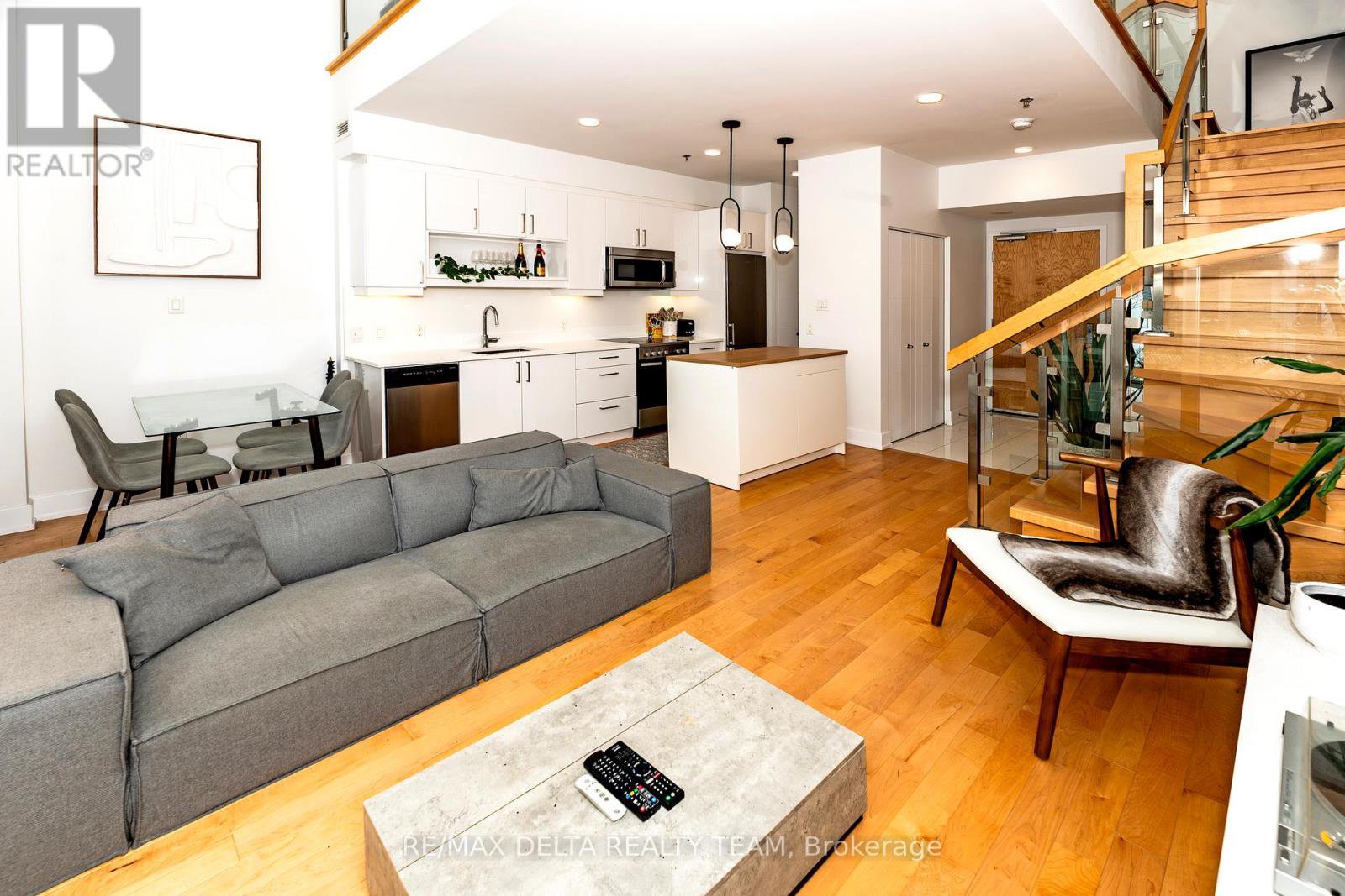 A rare offering in one of downtown Ottawa's most prestigious addresses. This exceptional residence at Tribeca Lofts by Claridge Homes showcases dramatic two-storey floor-to-ceiling windows, delivering a sophisticated loft aesthetic while bathing the interior in natural light and framing tranquil treed courtyard views. Designed for discerning urban living, this refined home offers a seamless blend of privacy and vibrancy in the heart of Canada's Capital. Ideally positioned moments from Parliament Hill, the Rideau Canal, ByWard Market, and Rideau Centre, the location is surrounded by Ottawa's finest restaurants, cafés, galleries, and cultural landmarks-all while enjoying the convenience of Farm Boy at your doorstep. A private walkout terrace opens directly to a lush, landscaped courtyard-an elegant extension of your living space and a serene retreat for outdoor entertaining. This unique ground-level access eliminates reliance on elevators and provides immediate access to the building's resort-style amenities, including an indoor pool, sauna, fully equipped fitness centre, resident lounge, boardroom, and courtyard BBQs.Additional luxury conveniences include guest suites for visitors, secure underground parking, a storage locker, and dedicated bicycle storage. Thoughtfully designed and impeccably located, this residence offers a rare opportunity to enjoy sophisticated city living with the tranquillity of a private enclave. An exceptional home for those who value luxury, lifestyle, and location.
