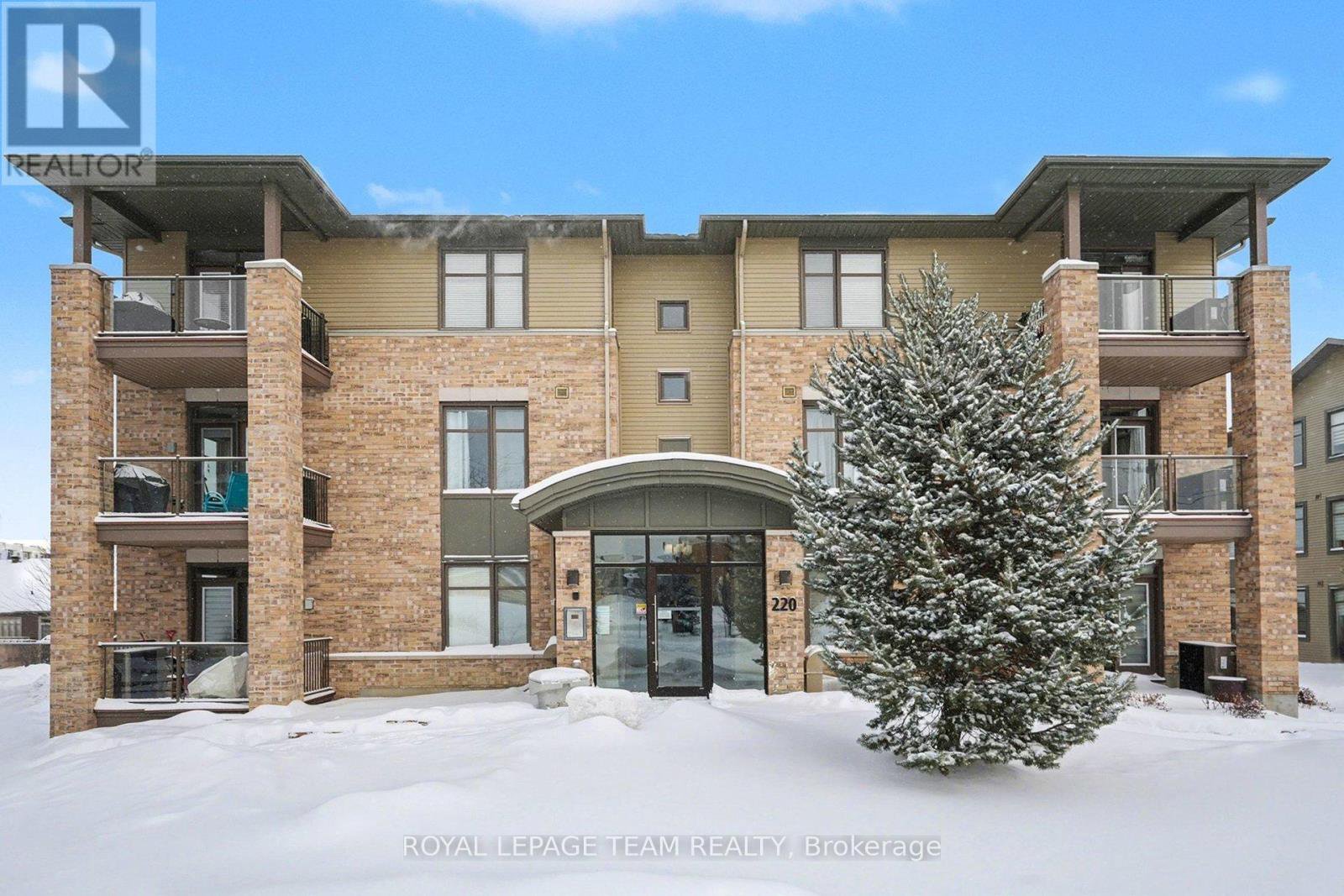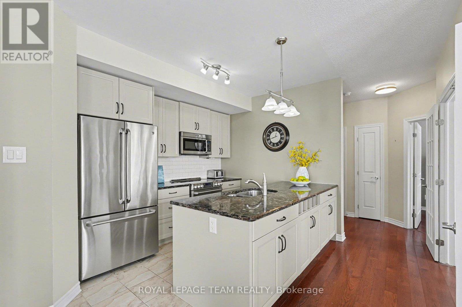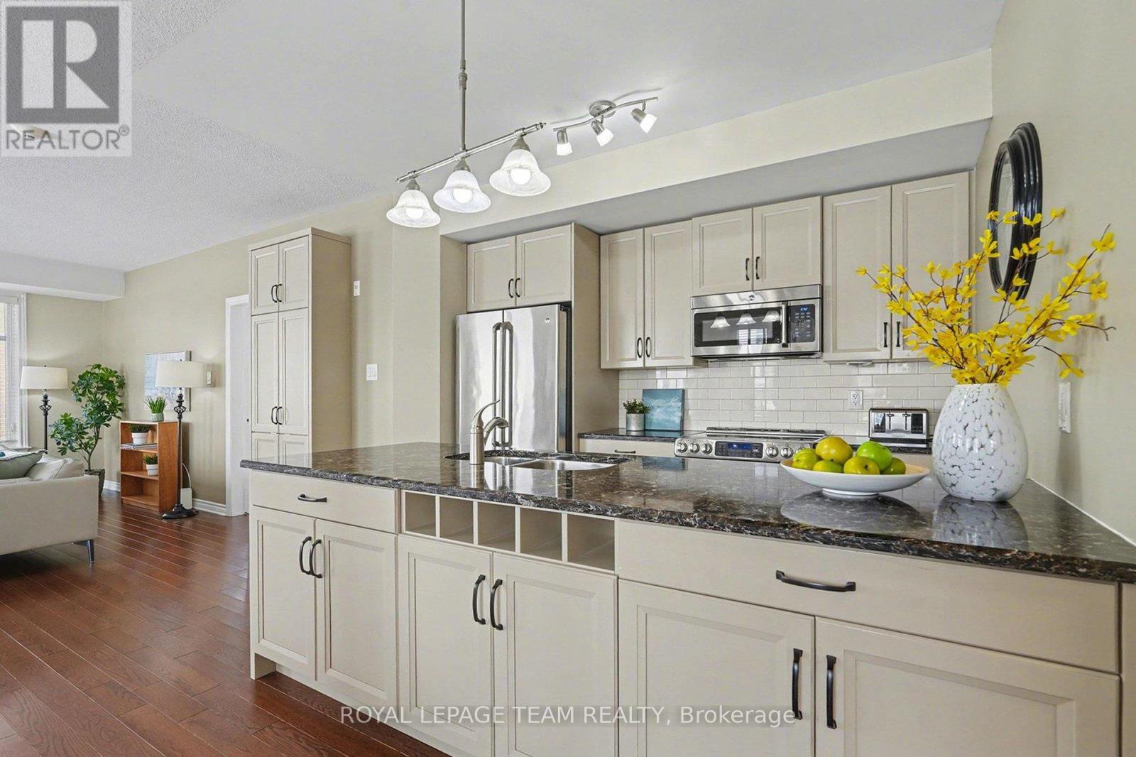 This bright and spacious 2-bedroom + den, 2-bathroom end-unit condo offers 1,335 sq. ft. of elegant living space in the heart of Stittsville. The open-concept kitchen is a chef's delight, featuring stainless steel appliances, pull-out pot & pan drawers, stone countertops, a large peninsula with prep area, and an additional pantry. Natural light floods the living and dining areas, which feature hardwood floors throughout for seamless transitions. Located off the kitchen, the den features French doors and offers flexible space perfect for a home office, hobby room, or cozy reading nook. Enjoy outdoor living with East-facing balcony equipped with a natural gas BBQ hookup-a rare find in condo living. The primary bedroom includes custom built-ins for added storage, a walk-in closet, and a 4-piece ensuite. The second bedroom is conveniently located adjacent to the main bathroom, providing an ideal layout for guests. This low-rise building includes an elevator, 1 heated underground parking space(P1), generously sized storage locker(L1) and one exterior parking space (#12). Ideally situated close to walking trails, parks, shopping, and public transit, this home is an excellent choice for professionals or downsizers seeking comfort and convenience.