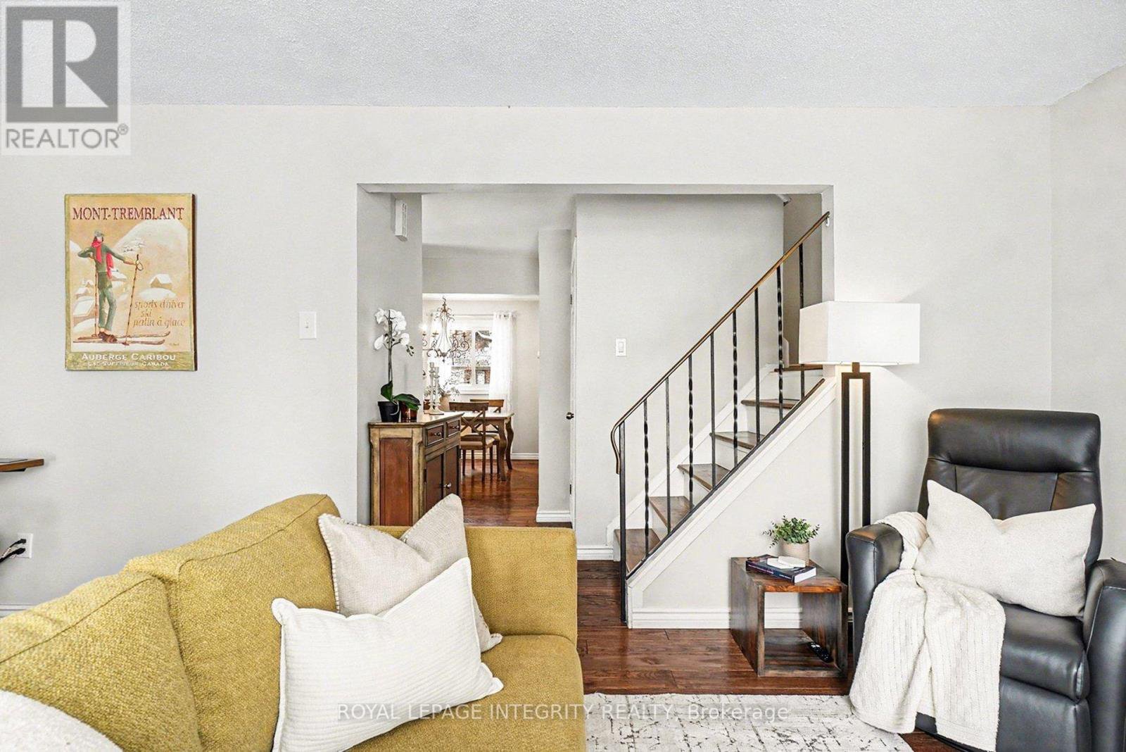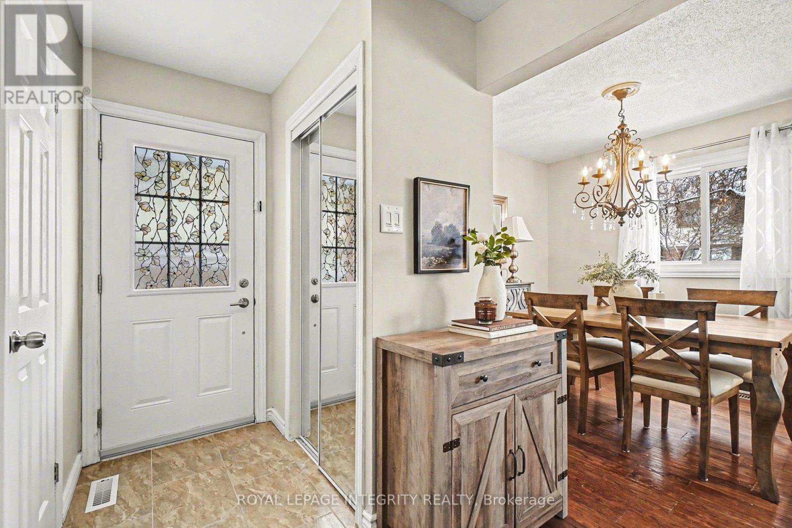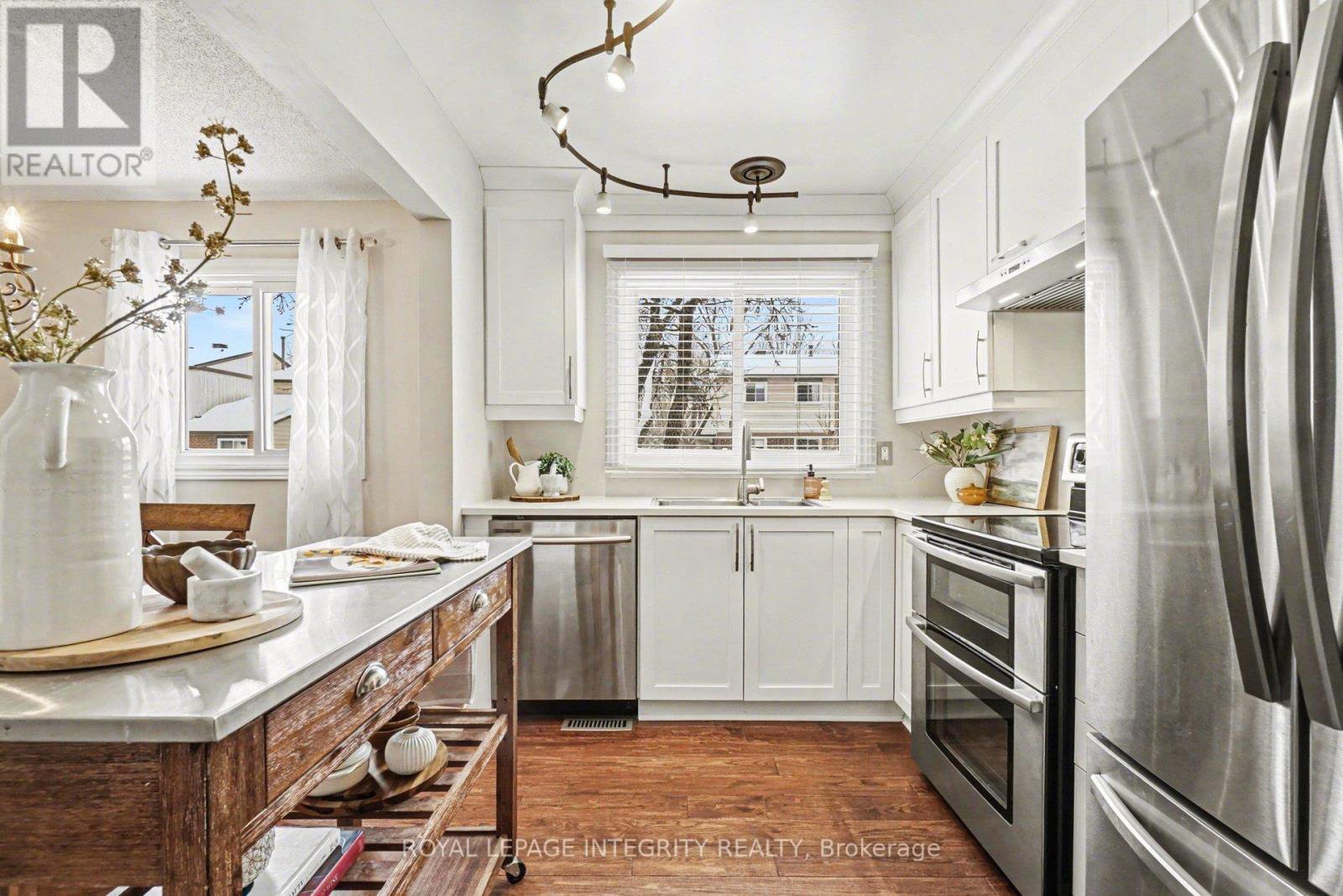This stunning, very well-maintained end unit offers three bedrooms and three fully updated bathrooms in a desirable Blackburn Hamlet location. The main floor features updated dark hardwood and a chic, polished white kitchen with deep cabinets extended to the ceiling and crown molding. Ceramic tile in the foyer and powder room adds a modern touch. The spacious master bedroom has a functional walk-in closet and a convenient two-piece ensuite. The large family room with its oversized windows overlooking the private backyard. The outdoor space itself offers tons of privacy, especially when the leaves are in. A generous shed provides additional storage. Enjoy the rare privilege of two adjacent parking spots right outside your door. Blackburn Hamlet is a vibrant, family-friendly community where neighbors come together. Walk to grocery stores, libraries, schools, parks, skating rinks, pools and specialty shops. Summer fun awaits at the Blackburn Fun Fair, and green thumbs can take advantage of community garden plots. Unpack and enjoy this low maintenance and easy living property. Privacy, style and family-friendly living - this is Blackburn at its best.