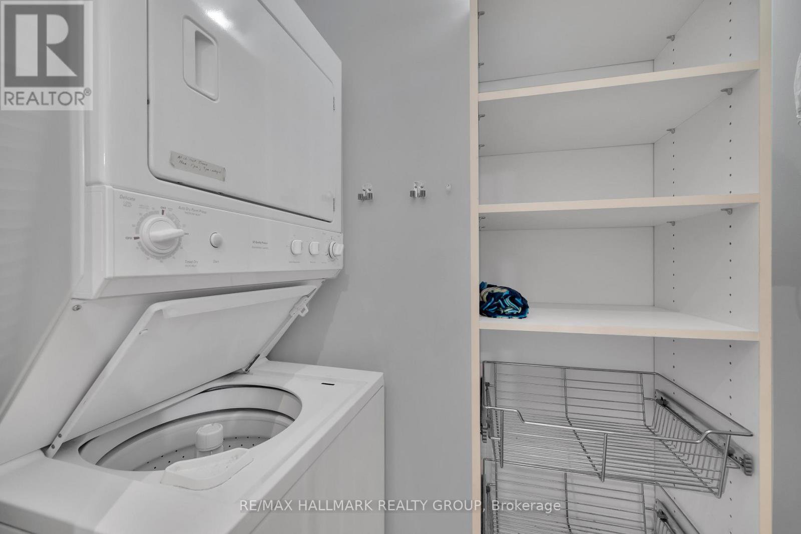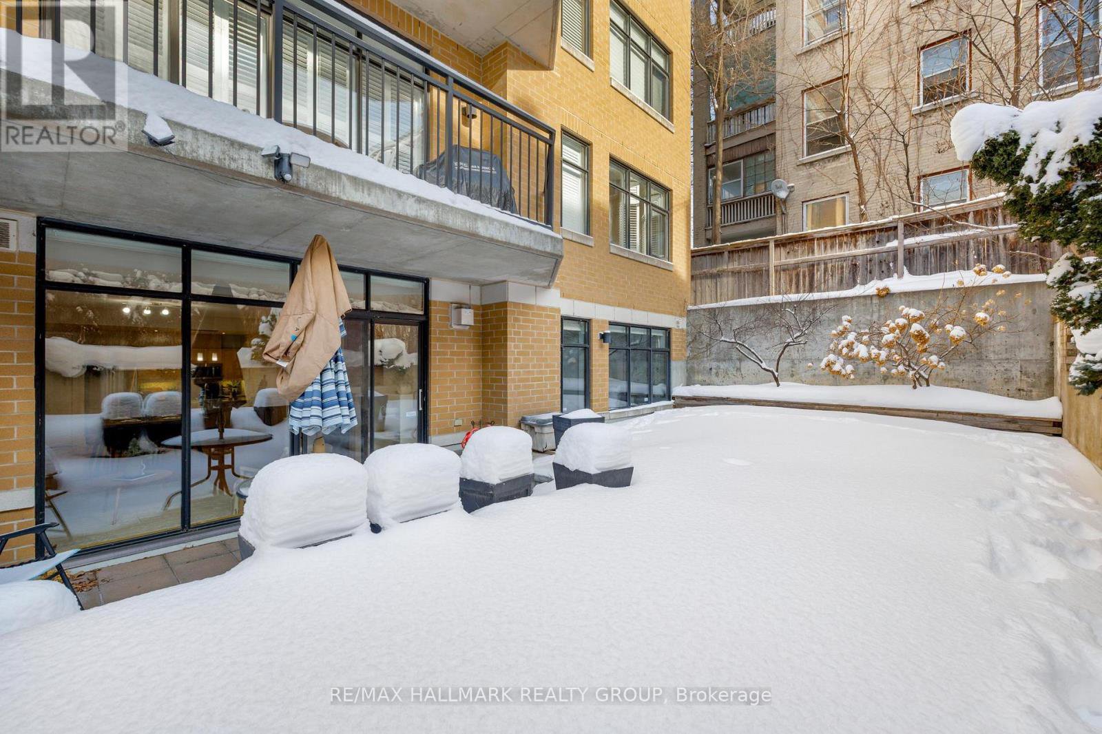 Fabulous 2-bedroom condominium located within "The Lanesborough" - a prestigious Domicile-built residence located steps to Parliament Hill, the Rideau Centre, ByWard Market and the Rideau Canal, with an incredible selection of vibrant restaurants and trendy cafés right outside your door! This beautifully designed unit offers 1,090 sq ft of well-planned living space with soaring 10 ft ceilings and a spacious, open-concept layout. A true standout feature is the exceptional ~36' x 19' private patio - a rare offering perfect for entertaining or relaxing in the city! The stylish kitchen is equipped with stainless steel appliances, granite countertops, a centre island with breakfast bar, and a storage pantry. The open living and dining room features a cozy gas fireplace, custom built-in shelving and a wall of windows that flood the space with natural light. The primary bedroom boasts a generous walk-in closet with custom organizers, while the spacious second bedroom is ideal as a guest room or home office. A beautifully appointed 3-piece main bathroom features a granite vanity and glass shower. Additional highlights include in-suite laundry, underground parking and a storage locker. A rare opportunity that perfectly blends style, outdoor space, walkability and an exceptional urban lifestyle! 24 hour irrevocable.