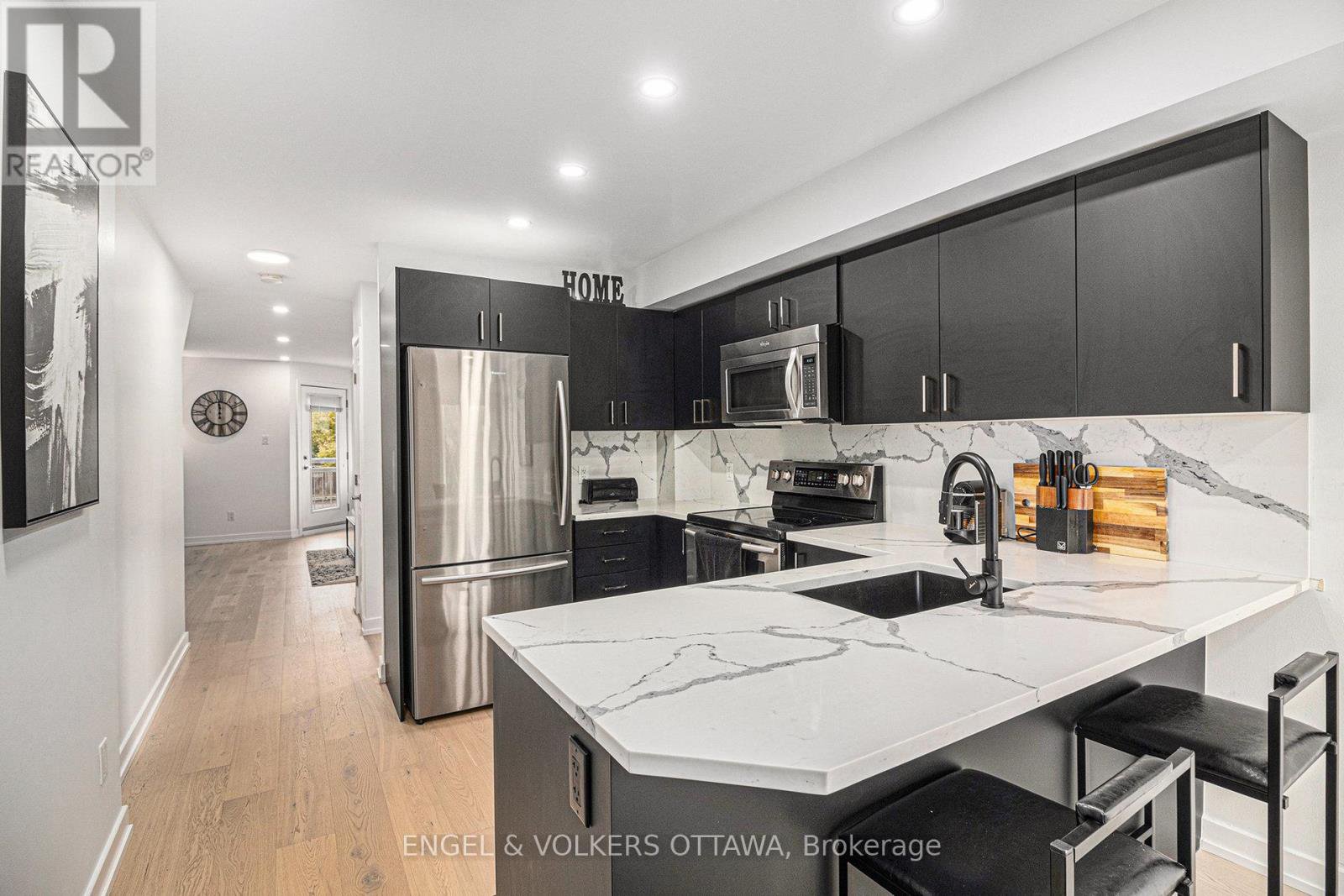 NEW PRICE! Bright end-unit stacked condo (2 levels) with 2 bedrooms + 1.5 baths and extra natural light. Renovated kitchen with quartz countertop + matching quartz backsplash, refreshed cabinetry/hardware, and modern sink. Fresh paint, engineered hardwood on the main level, and pot lights throughout. Dedicated parking + in-unit storage. Minutes to shopping, transit, restaurants, and parks along Innes Rd. Move-in ready and ideal for first-time buyers, downsizers, or investors.