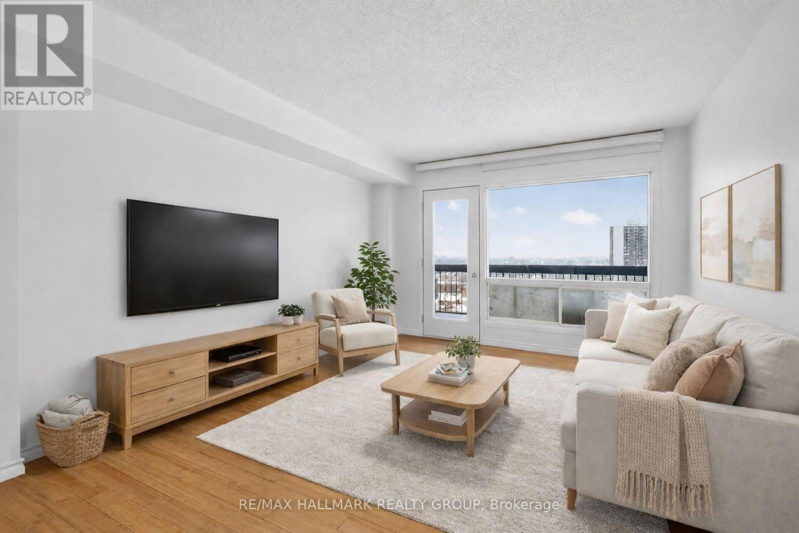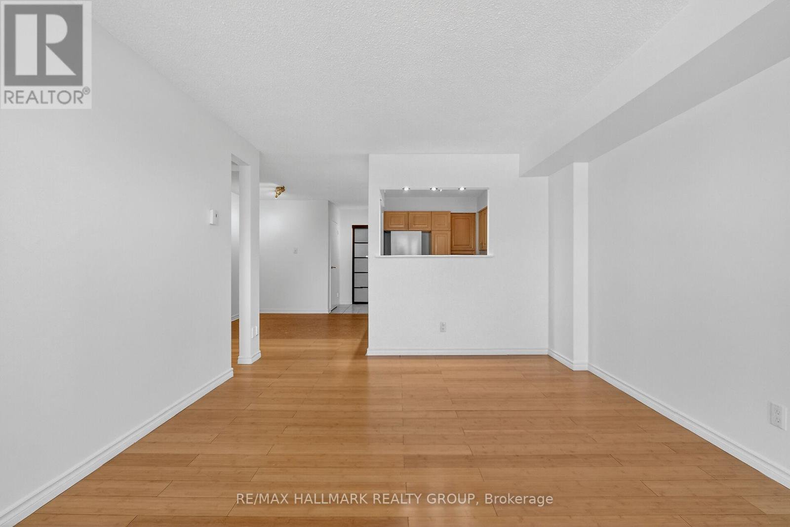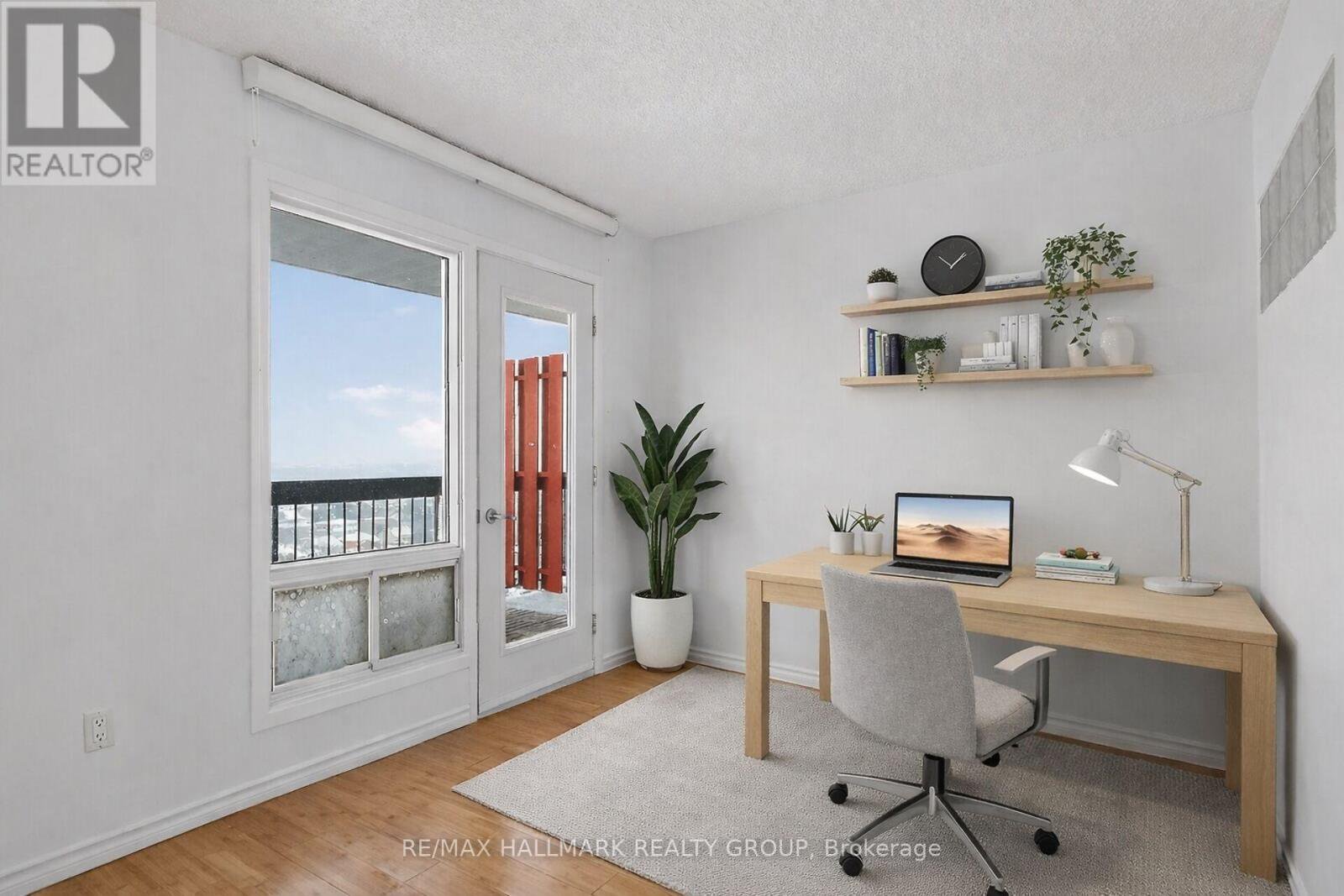 Perched on the 14th floor, this exceptional corner condo offers peaceful panoramic views with sun-filled south and east exposures. Featuring the largest floor plan in the building at just over 1,000 sq. ft., this residence stands out for both size and versatility. Enjoy two separate balconies, perfect for morning coffee or unwinding at sunset. Originally designed as a 2-bedroom plus den, the current owner removed a wall to create an expansive, studio-style primary retreat with den, ideal for those craving an oversized bedroom. Prefer a dedicated workspace or guest room? Easily reinstall the wall to restore a private den or third bedroom with direct balcony access. The suite features updated flooring throughout (carpet-free), an updated, modern bathroom with a walk-in shower, and a generous ensuite storage/pantry. Underground parking is included. The building offers outstanding amenities, including an indoor pool, full fitness centre, and even a convenience store on site, perfect for days you don't want to step outside. An unbeatable, super walkable location puts public transit just one minute away, a modern Loblaws across the street, four nearby parks, schools, and Montfort Hospital all within easy reach.