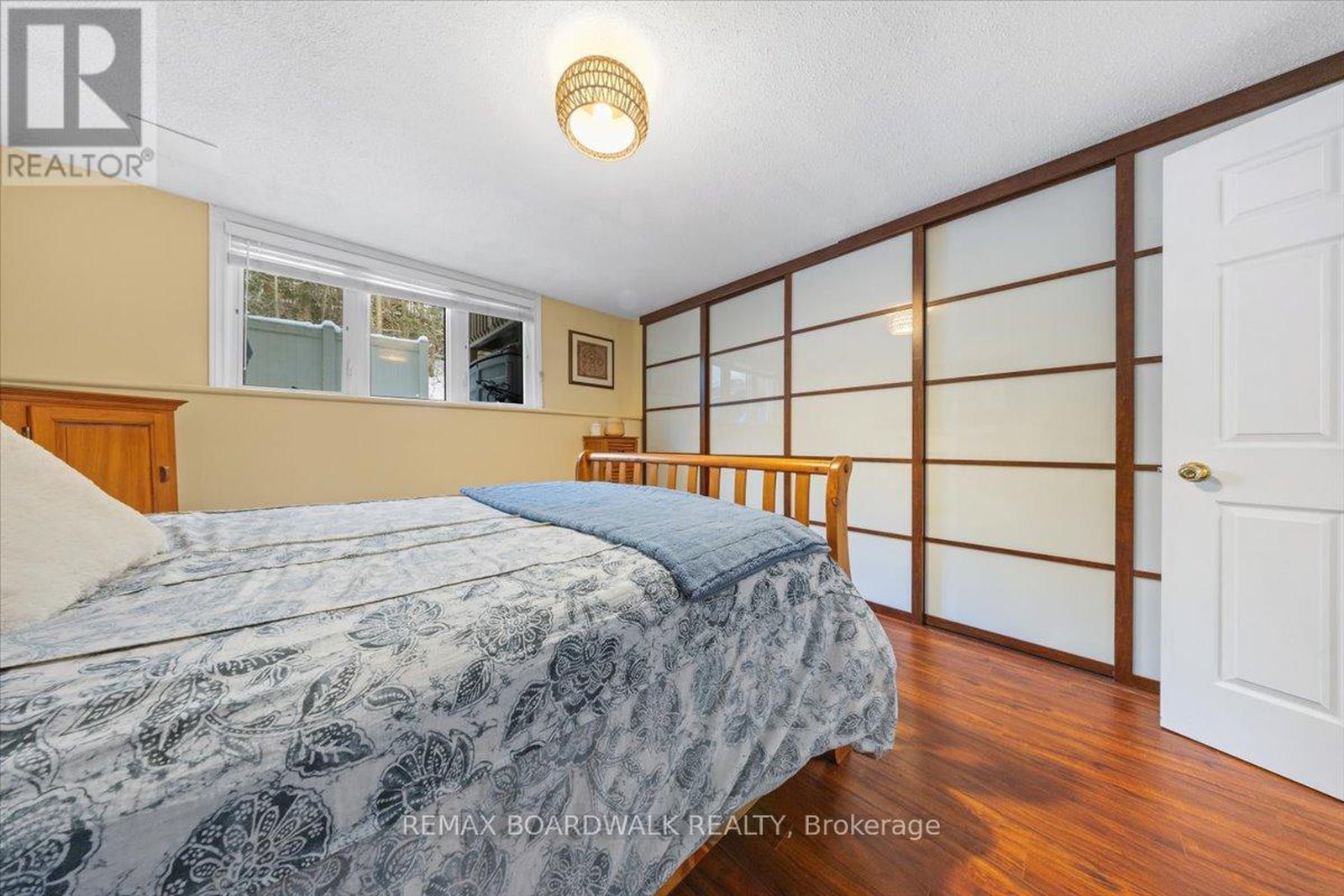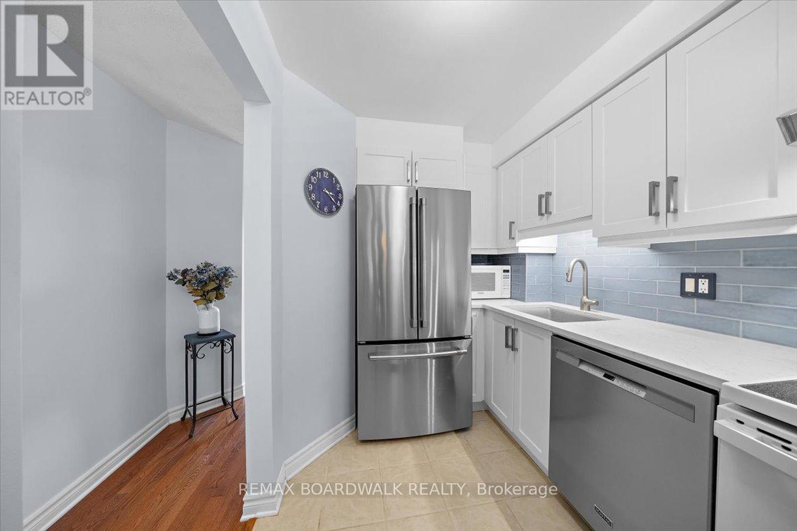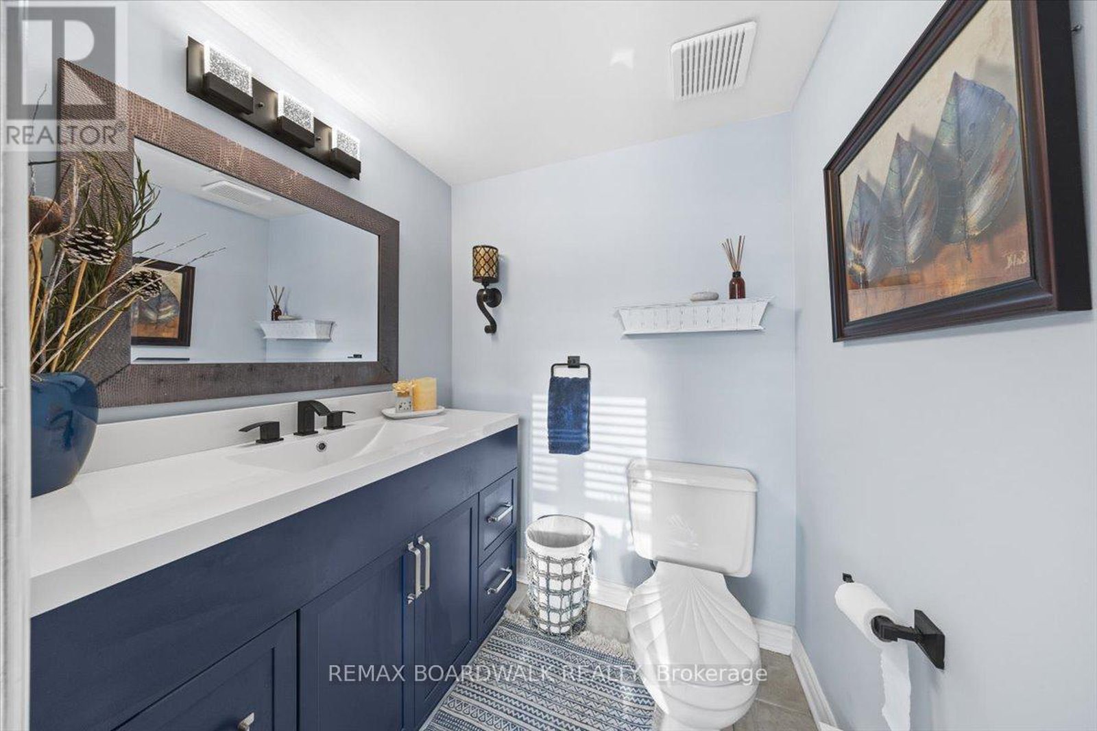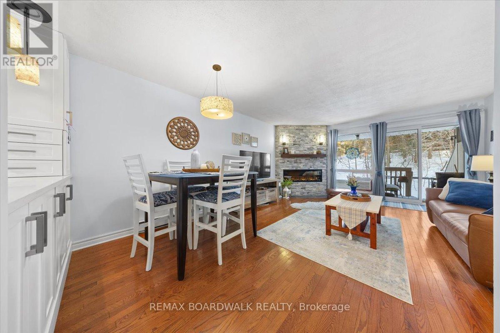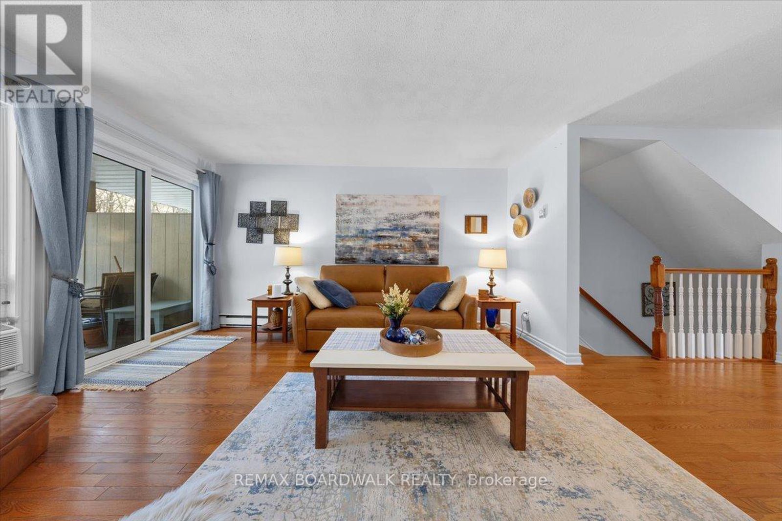 Low-maintenance living in the desirable community of Convent Glen North. A covered front entrance welcomes you into a tiled foyer with ample closet space and a convenient powder room (2019). Hardwood flooring runs throughout the main level, complemented by large windows and sliding patio doors that fill the space with natural light.The updated kitchen (2024) is designed for both function and appeal, featuring white shaker soft-close cabinetry, a calming horizontal blue backsplash, deep quartz countertops, and an extended breakfast bar. The living area offers a cozy focal point with a stone electric fireplace (2025) and peaceful views of the rear green space with no direct rear neighbours.PVC fencing and mature trees create a private, tranquil outdoor setting. Down the two-tone staircase, the lower level remains bright with large egress windows at both the front and back. The primary bedroom features a full-width, wall-to-wall closet, while the updated 4-piece main bathroom (2019) includes a large vanity and tiled tub surround with soaker tub.Laundry is conveniently located on the lower level, along with additional storage. Ideally situated close to walking paths, schools, OC Transpo, grocery stores, and everyday amenities. Pride of ownership throughout in a family-friendly neighbourhood.