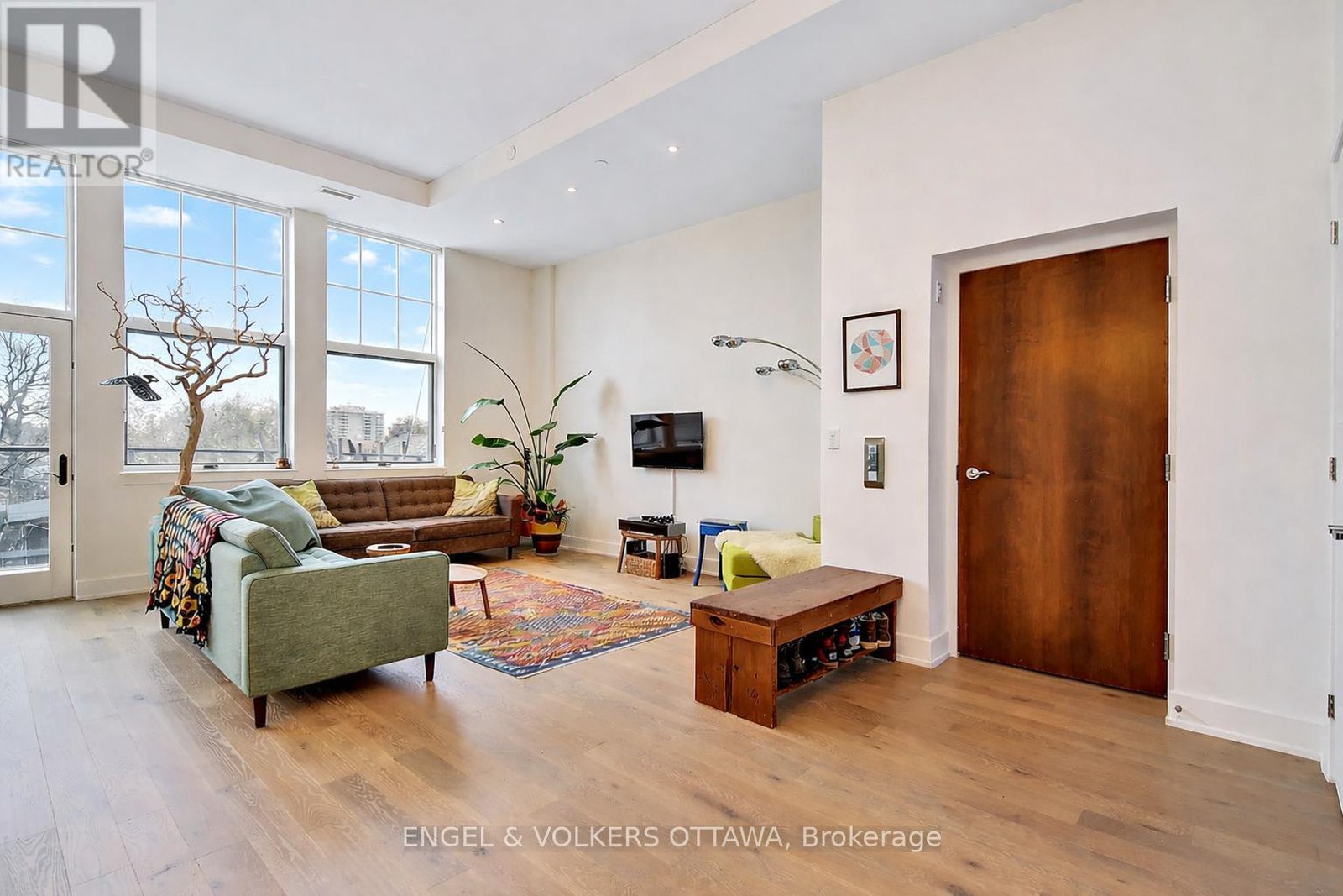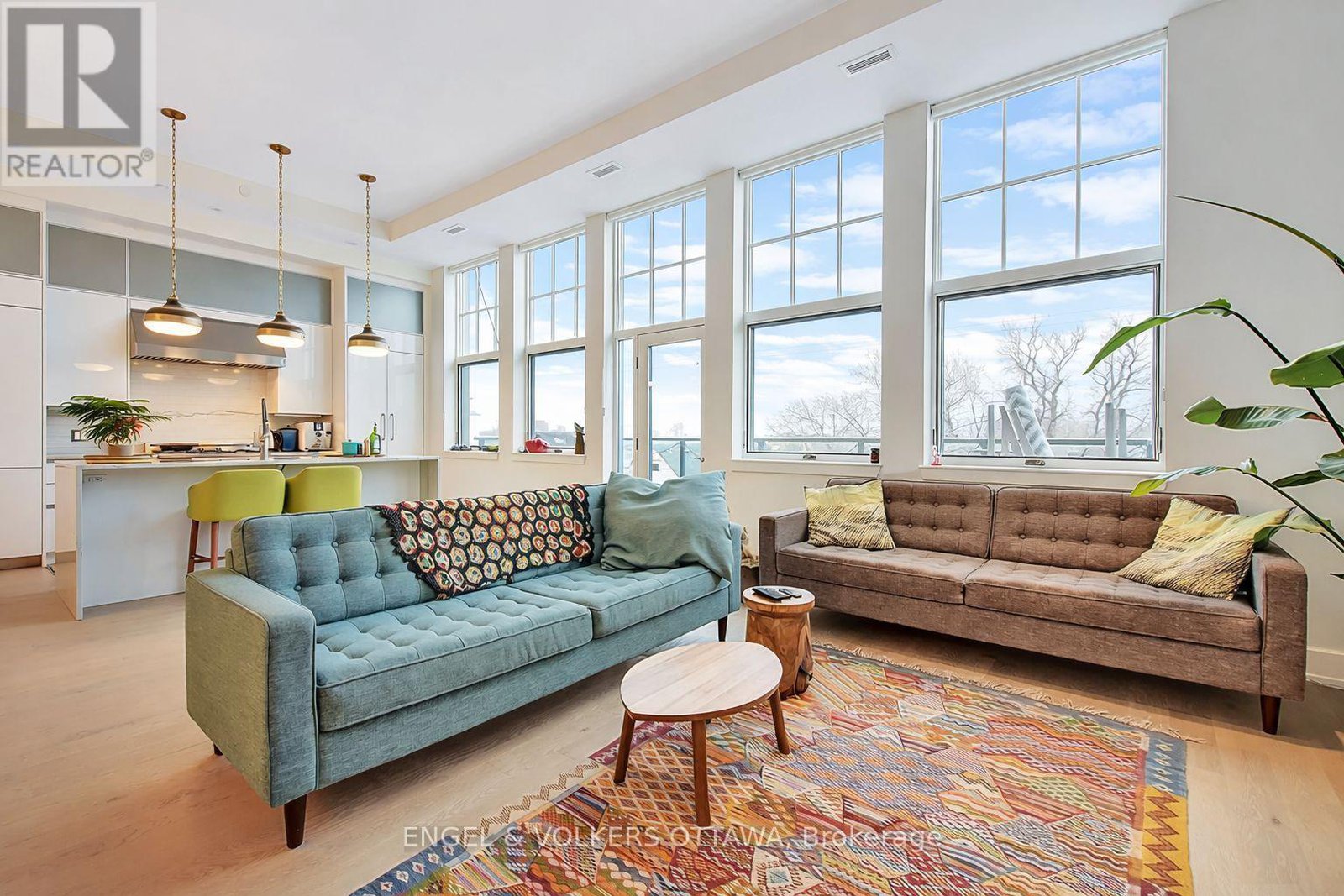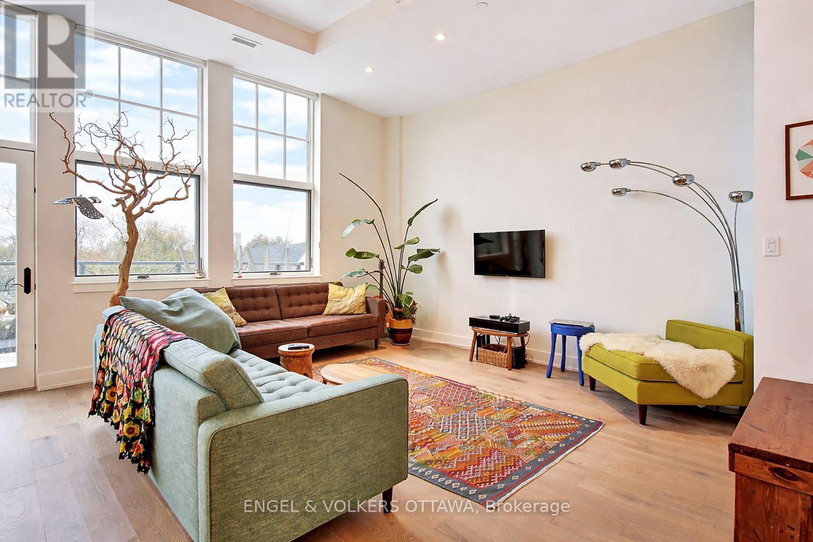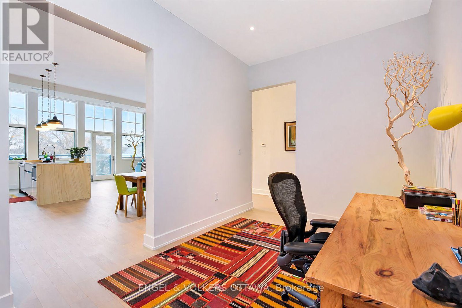 Welcome home to this exceptional luxury residence in the heart of Hintonburg. Set within Yard & Station, a meticulously restored 1933 heritage schoolhouse, this boutique building was designed by renowned Ottawa architect Barry Hobin and masterfully constructed by Morley Hoppner in 2016. Spanning approximately 1,800 square feet, this refined residence is accessed by a private elevator that delivers you directly into the suite. Soaring ceilings, expansive windows, and an open-concept living, dining, and kitchen area create a bright and sophisticated atmosphere, enhanced by custom Hunter Douglas blinds throughout, including electric blackout blinds in both bedrooms. The chef's kitchen is beautifully appointed with high-end appliances, including a Bertazzoni 6-burner gas range and an integrated Thermador refrigerator, along with a marble slab backsplash and an oversized waterfall island with seating-ideal for both entertaining and everyday living. Adjacent to the dining area, a generous den offers flexible use as a home office, library, or additional lounge space. The serene primary suite features a walk-in closet and a spa-inspired ensuite with marble floors, a double vanity, and a glass-enclosed shower. A spacious second bedroom includes a large closet and convenient cheater access to the second full bathroom. Additional highlights include an in-suite laundry room with storage, an east-facing balcony with natural gas BBQ hookup, two underground parking spaces equipped with EV charging, a storage locker, and access to a shared outdoor rooftop terrace-perfect for relaxing or entertaining. Perfectly positioned in one of Ottawa's most walkable and trendy neighbourhoods, this home is steps to both Tunney's Pasture and Bayview LRT stations, close to Wellington West and Parkdale Market, and minutes to downtown Ottawa-offering refined urban living with exceptional convenience.