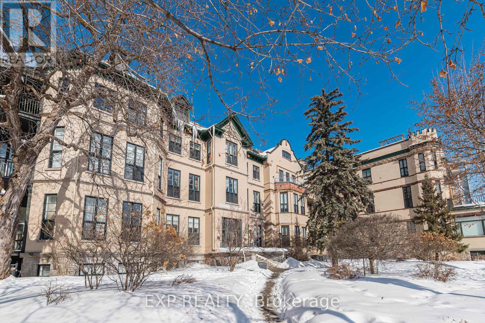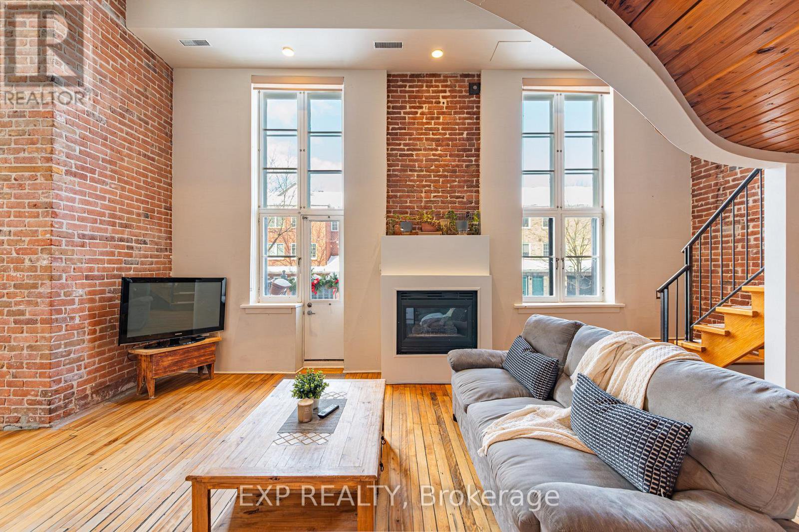 Own a distinctive piece of Ottawa's architectural history at the iconic Wallis House. This bright and beautifully maintained 1-bedroom + loft, 2-bathroom residence delivers authentic character paired with modern-day upgrades in a truly unique two-level layout.Soaring ceilings and dramatic exposed brick create immediate impact, while oversized windows flood the main level with natural light. The open-concept living and dining space is anchored by a cozy gas fireplace and offers direct access to a private balcony - the perfect spot for morning coffee or evening wind-downs.The kitchen is smartly positioned beneath the mezzanine and features stainless steel appliances, crisp white cabinetry, and warm wood accents that complement the building's historic charm. A discreet office/den nook and a convenient powder room complete the main floor, adding both flexibility and function.Upstairs, the lofted primary retreat overlooks the living area below and includes generous closet space along with a full 4-piece ensuite. The airy design and multi-level layout make this home ideal for professionals, creatives, or buyers seeking something far more inspiring than a typical condo.Set in one of Ottawa's most storied addresses, you're just minutes from downtown, the ByWard Market, Rideau River pathways, restaurants, cafés, and everyday amenities - offering the perfect balance of urban convenience and timeless character.Recent updates include: Owned hot water tank (2019), new windows (2019), updated kitchen cupboards and countertops (2024), and balcony improvements (2024).A rare opportunity to live in a landmark building with personality, history, and style.