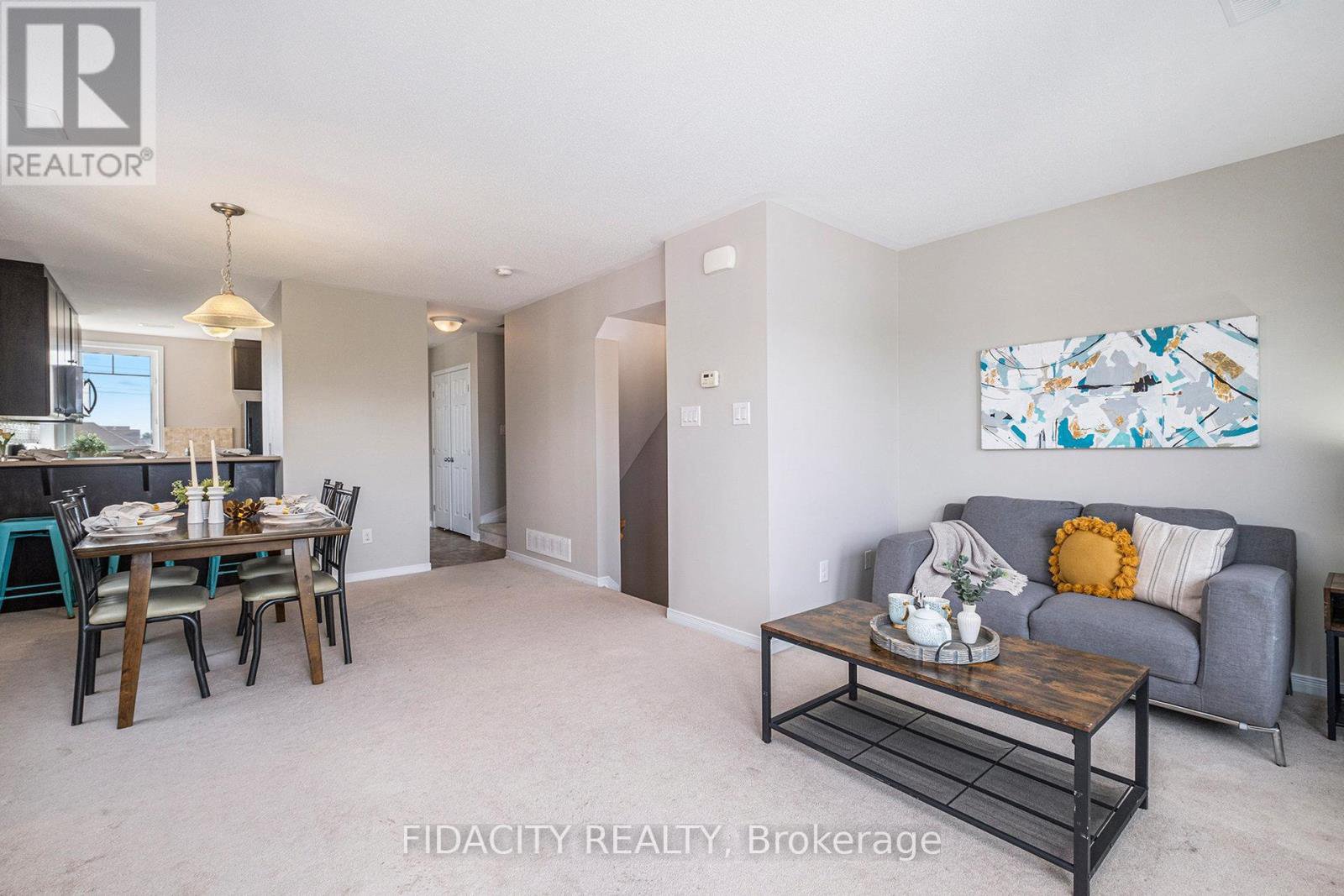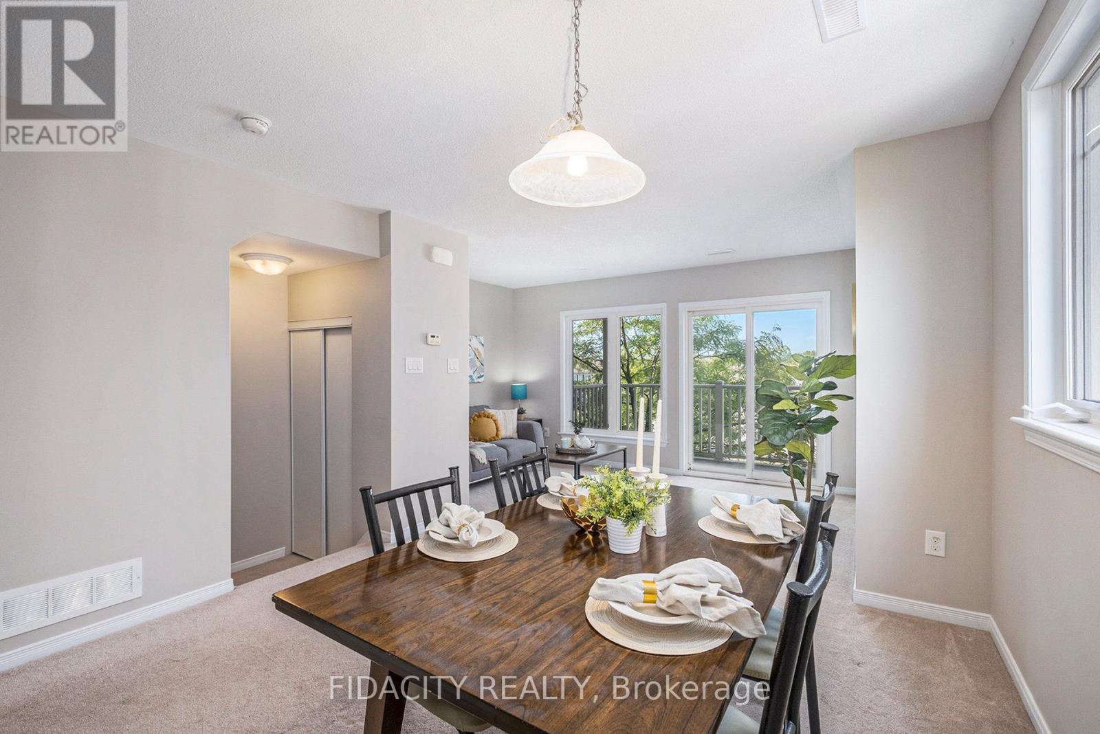 Bright upper corner unit with 2 parking spots & 3 bathrooms- A VERY RARE FIND! (1139 sq ft) Welcome to 3391 Cambrian Road, a sun-filled, freshly repainted two-story, two-bedroom townhome condo just across from the Stonebridge Golf Course. The main level offers a warm, inviting living and dining space bathed in natural light, with direct access to a private balcony. The kitchen features plenty of cabinets, a convenient breakfast bar overlooking the dining area, plus a window framing views of the greens. A powder room, coat closet, and in-suite laundry complete this floor. Upstairs, you will find 2 generous bedrooms. The primary suite boasts its own balcony, a wall of closets, and a stylish ensuite with glass shower. The second bedroom is equally spacious, enjoys a view of the course, and sits beside a full bathroom.With double parking, abundant sunlight, and a prime location close to shopping, restaurants, trails, golf and all main bus & transit routes, this home is move-in ready an excellent choice for investors, downsizers, or first-time buyers alike.(condo allows pets including dogs)