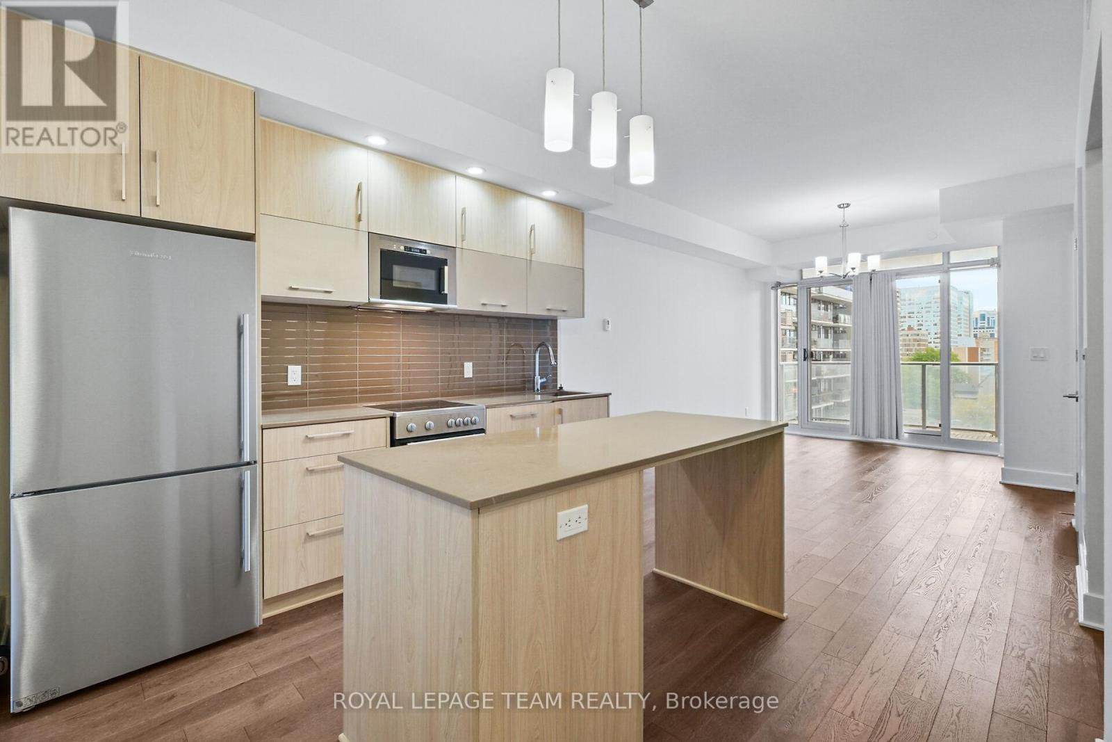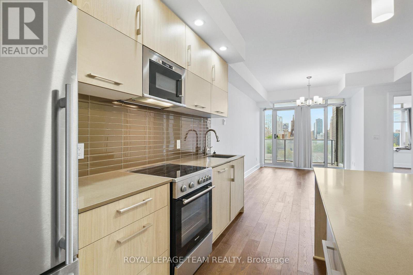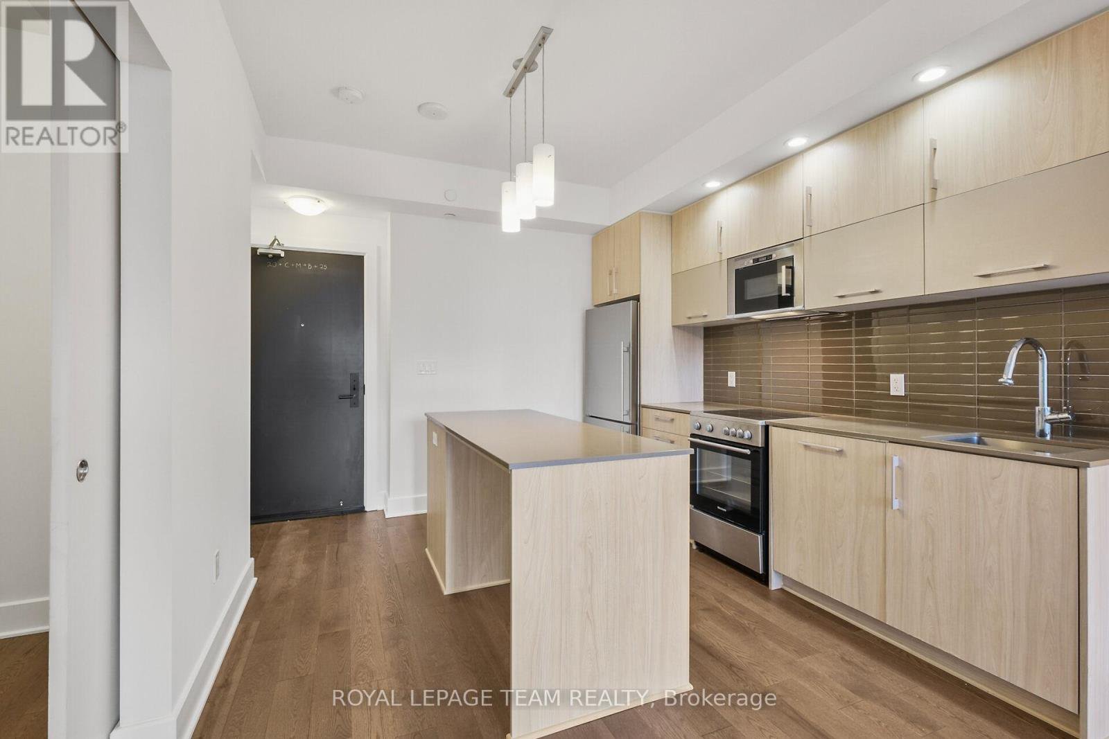 Welcome to this freshly painted, bright & modern, 9th floor, 686 sq ft condo (according to builder floorplans) featuring 1 Bedroom, 1 full Bath, and a versatile flex room. This open-concept layout features a large patio window that fills the space with abundant natural light, complemented by elegant hardwood flooring.The sleek designer Kitchen is equipped with stainless steel appliances, quartz countertops, ample cabinet space and an island with seating; perfect for casual dining or meal prep. A spacious east-facing balcony offers expansive views, ideal for both relaxing and entertaining. The Primary Bedroom is well-proportioned & bright, and features a built-in closet. In the spacious Den/Flex Rm, a sliding pocket door transforms the space into a home office, guestroom or convenient second Bedroom able to accommodate a queen size bed, complete with a closet/built-in storage. Additional highlights include convenient in-unit laundry, personal storage locker and access to top-tier building amenities: indoor pool, outdoor terrace and BBQ, state-of-the-art gym, sauna, party room, meeting spaces and guest suites. Monthly condo fees of $424.34 cover water/sewer, gas, reserve fund contributions, building insurance, management fees. Hydro averages approximately $80/month. Living here has you steps from the O-Train Lyon station, Parliament Hill and so much more!