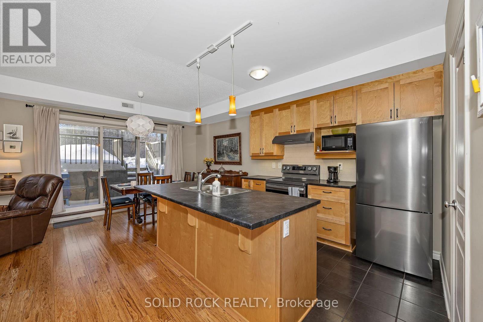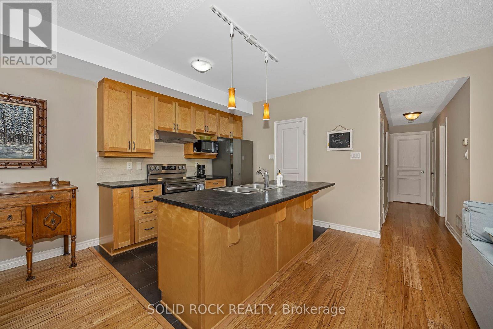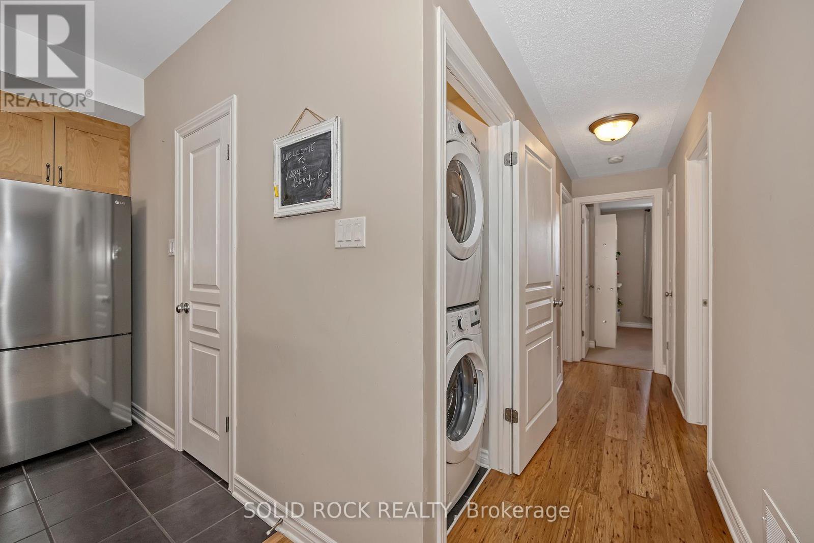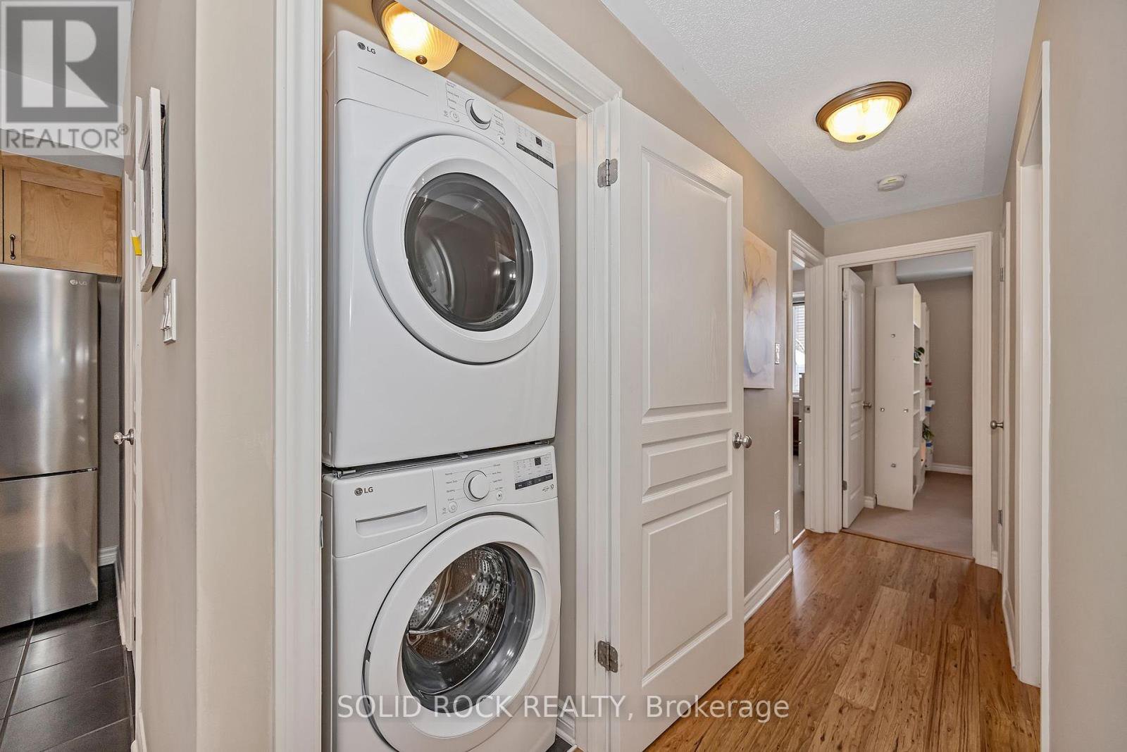 Beautifully updated 2-bedroom condo in the heart of Riverside South, backing onto a quiet and private treed area with no through traffic. This bright ground unit offers modern open-concept living with engineered hardwood flooring on the main level and 9-ft ceilings. The kitchen features solid wood cabinets, stainless-steel appliances (2024), pantry, backsplash, and under-cabinet lighting. Spacious living and dining areas make for easy entertaining. Both bedrooms offer comfortable layout with carpeted flooring; the primary includes a 3-piece ensuite and walk-in closet. A second full 4-piece bath, in-unit laundry (2025), and a large utility/storage room complete the space. Enjoy a very private walkout patio overlooking the wooded area. Parking spot included. Well-managed condo with low fees that include water. Non-smoking building with convenient garbage room and attached bicycle storage. Steps to parks, schools, shopping, walking paths, and LRT. Ideal for first-time buyers, downsizers, or investors.