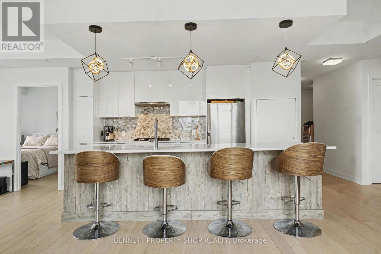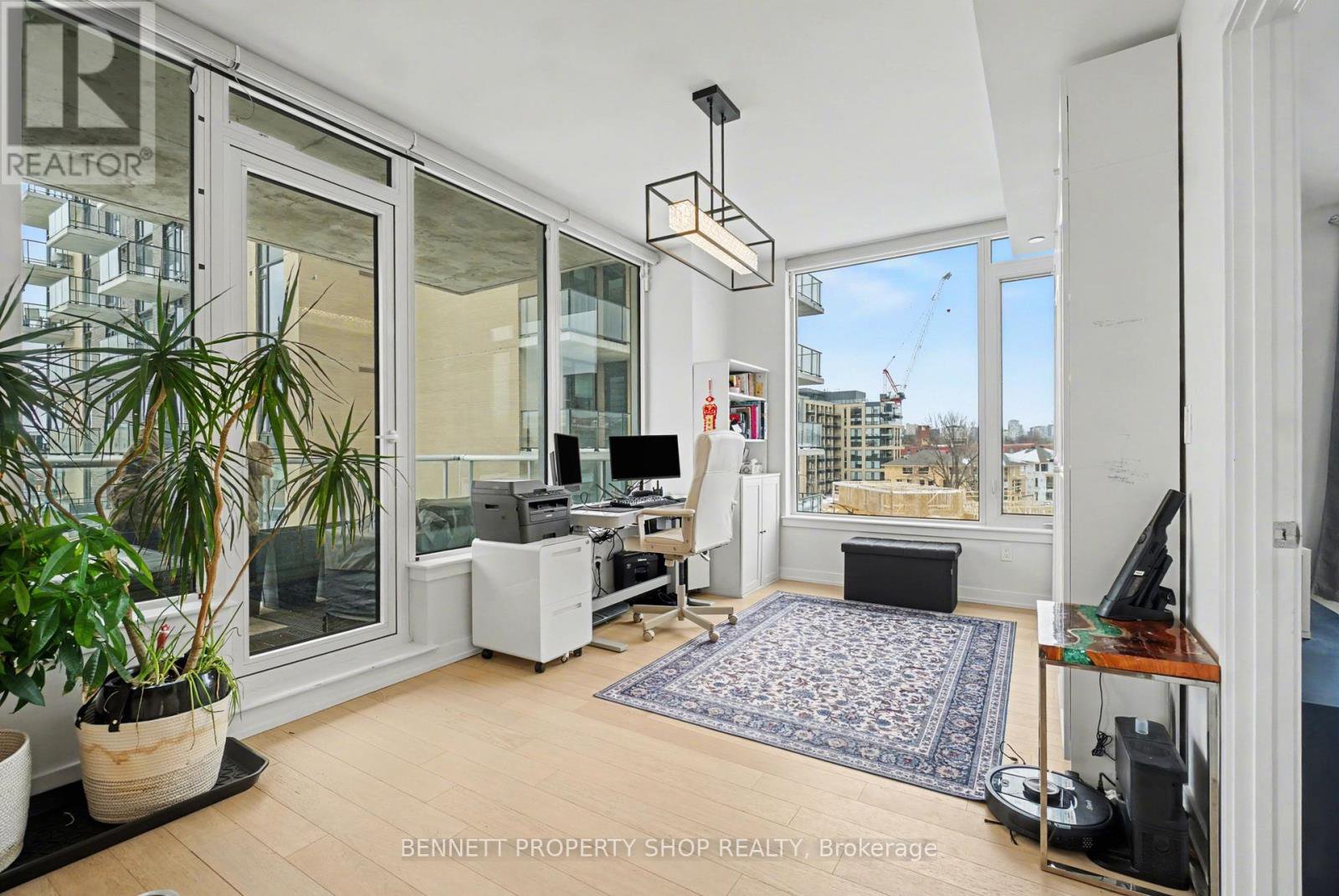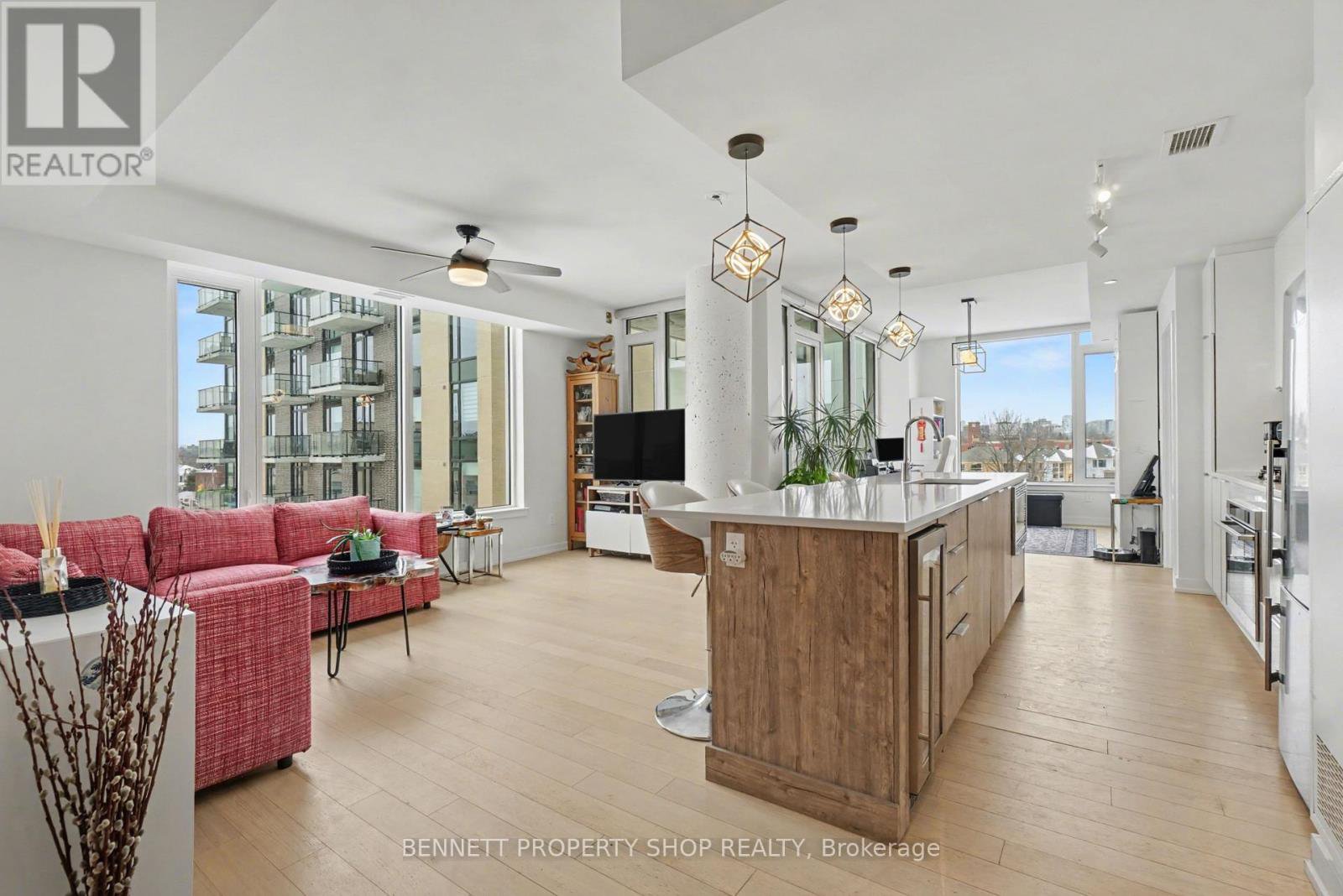 Welcome to The Terraces II by EQ Homes in Greystone Village, Old Ottawa East, one of Ottawa's most desirable riverfront communities. Offering over 1,200 sqft, this is the largest suite currently available in the building, providing a rare combination of space, layout and upgrades that sets it apart from smaller 2-bedroom options.This upgraded corner suite features 2 bedrooms + den, 2 bathrooms and underground parking with EV charger. West-facing exposure fills the open-concept layout with natural light. Engineered hardwood flooring flows throughout the main living space, anchored by a chef-inspired kitchen with oversized quartz island, built-in wine fridge, sleek flat-panel cabinetry, stainless steel appliances, gas cooktop and built-in oven.The spacious living and dining areas open to a covered terrace with gas BBQ hookup. With over 1,200 sqft of interior living space, the scale of this layout is immediately noticeable and rarely available here.The primary retreat offers dual closets and a modern ensuite with walk-in glass shower. A generous second bedroom and versatile den provide flexibility for guests, work-from-home or hobby space.Additional features include motorized blinds, quartz bathroom counters, two bike racks and a storage locker. The parking space is directly across from the elevator doors, offering exceptional everyday convenience.Residents enjoy a fitness centre, party room, guest suite, library, bike and kayak storage, pet wash station and car/bike wash area. Ideally located between the Rideau River and Rideau Canal, steps to pathways, parks, Main Street shops and cafés, the Flora Footbridge, Lansdowne and downtown Ottawa. Luxury living in one of the city's most walkable & desirable neighbourhoods. 48 Hours Irrevocable March 1 - March 16th 2026, 24 Hours irrevocable after March 16th as per Form 244. Minimum 12 Hours notice for all showings.