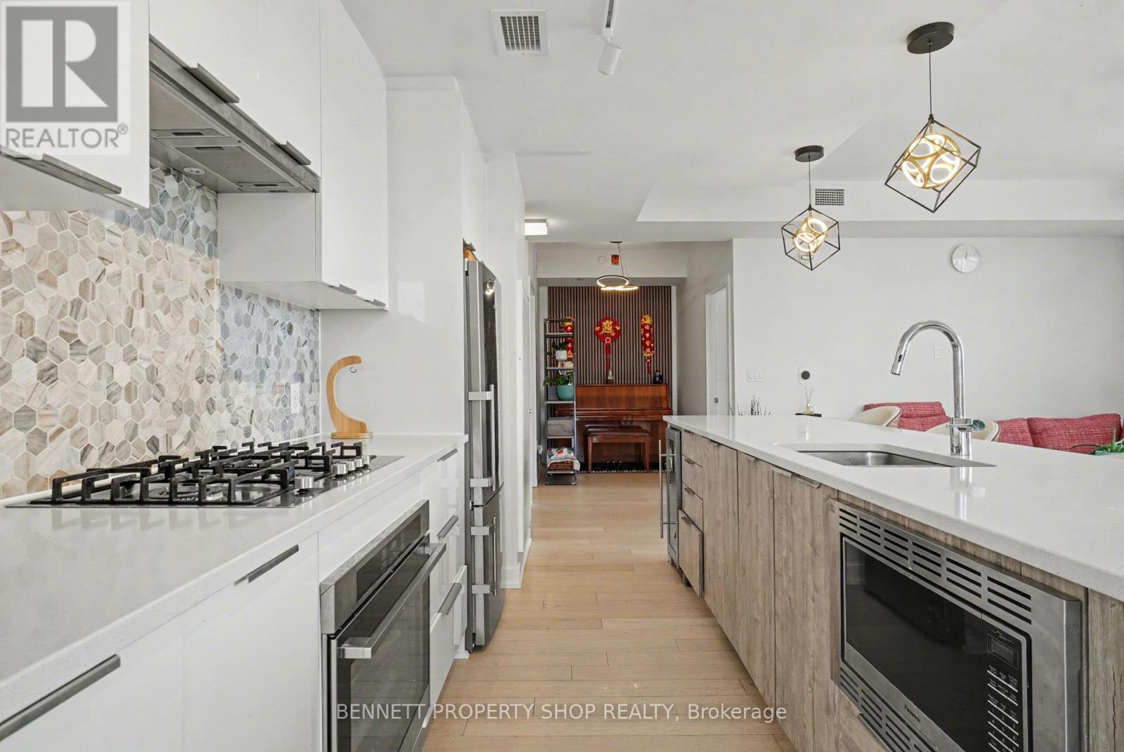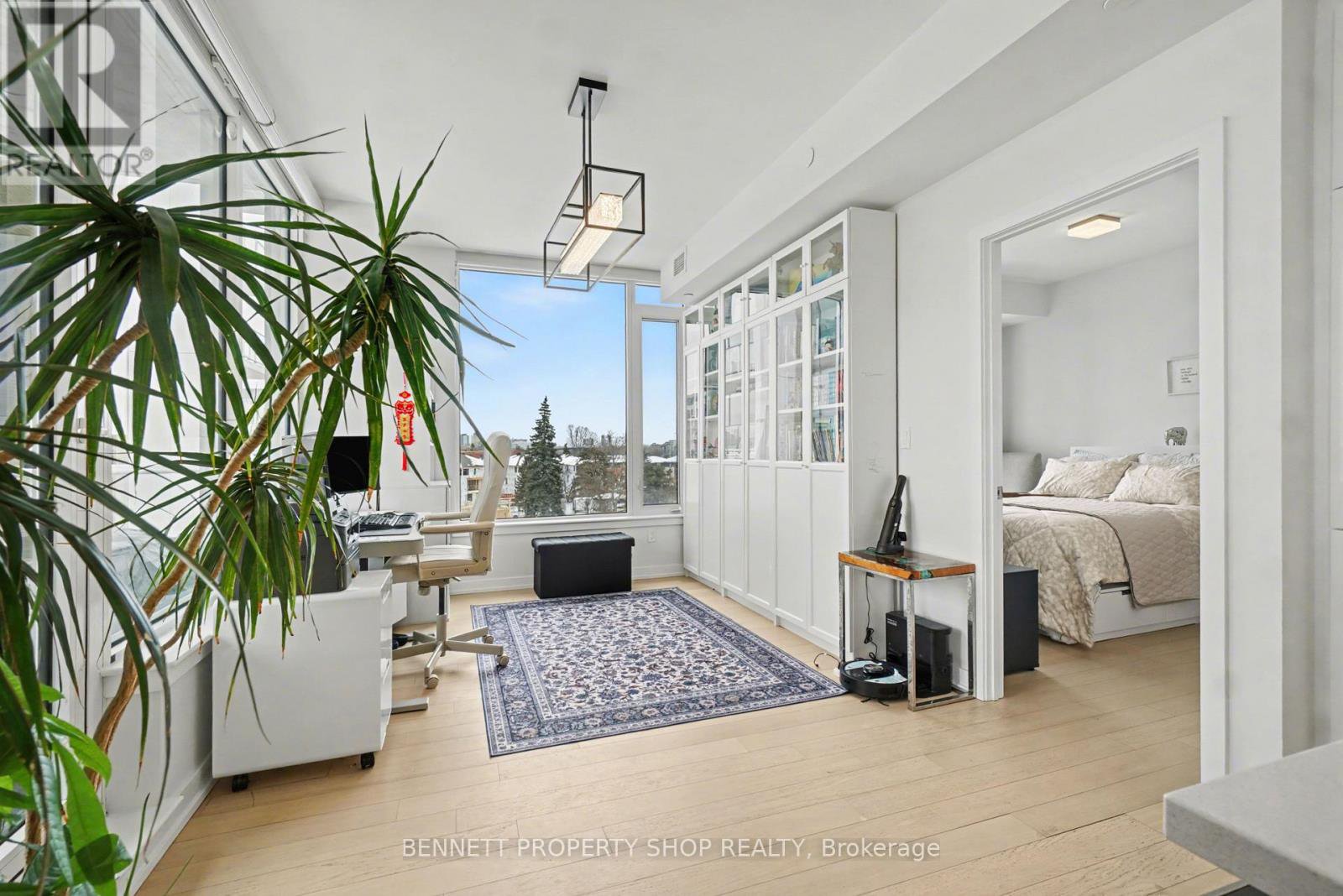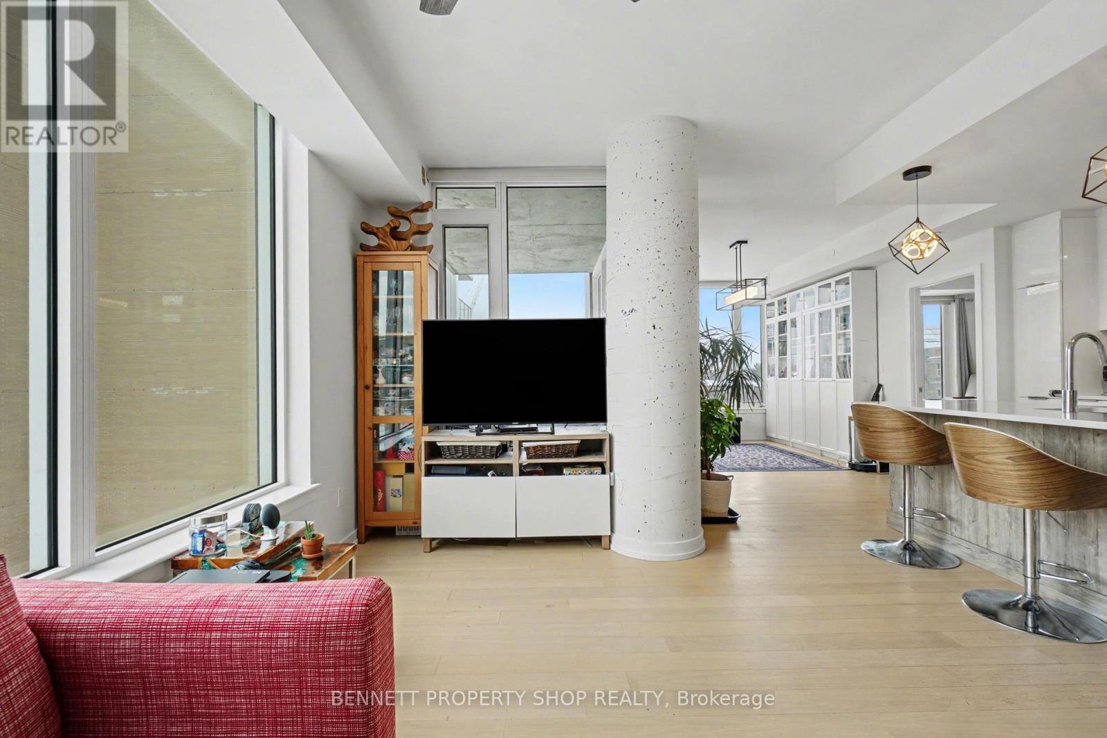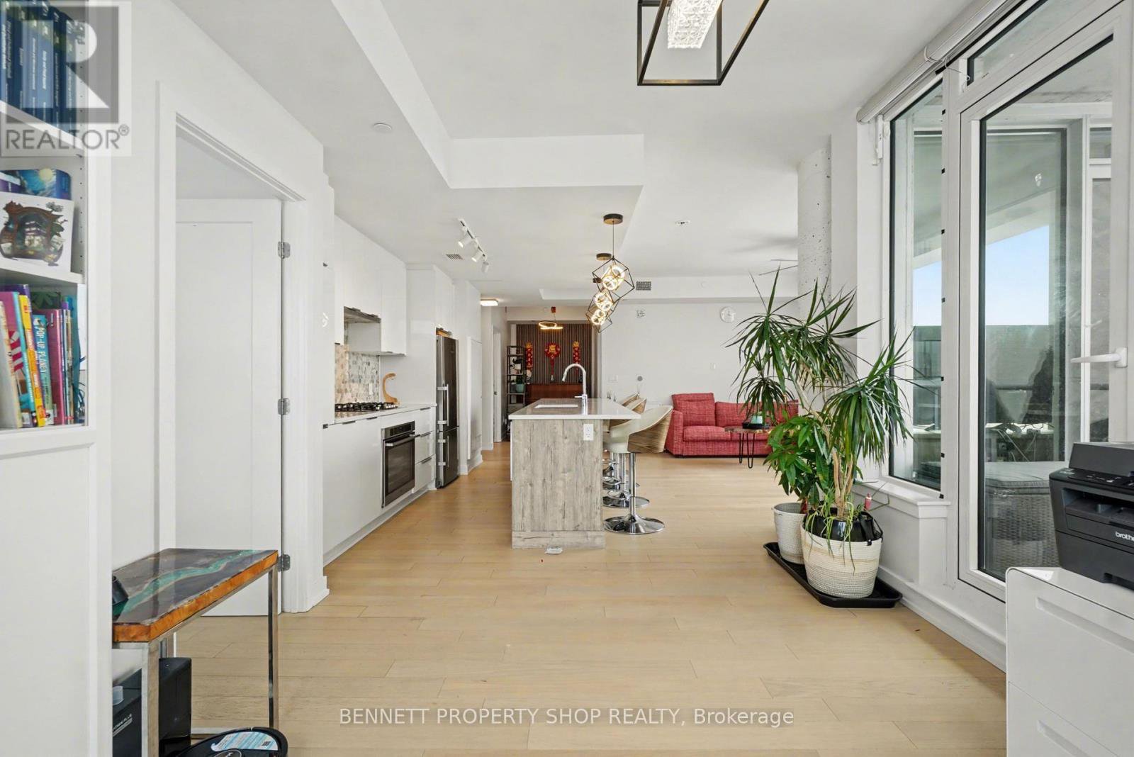 Welcome to The Terraces II by EQ Homes in Greystone Village, Old Ottawa East, one of Ottawa's most desirable riverfront communities. Offering over 1,200 sqft, this is the largest suite currently available in the building, providing a rare combination of space, layout and upgrades that sets it apart from smaller 2-bedroom options.This upgraded corner suite features 2 bedrooms + den, 2 bathrooms and underground parking with EV charger. West-facing exposure fills the open-concept layout with natural light. Engineered hardwood flooring flows throughout the main living space, anchored by a chef-inspired kitchen with oversized quartz island, built-in wine fridge, sleek flat-panel cabinetry, stainless steel appliances, gas cooktop and built-in oven.The spacious living and dining areas open to a covered terrace with gas BBQ hookup. With over 1,200 sqft of interior living space, the scale of this layout is immediately noticeable and rarely available here.The primary retreat offers dual closets and a modern ensuite with walk-in glass shower. A generous second bedroom and versatile den provide flexibility for guests, work-from-home or hobby space.Additional features include motorized blinds, quartz bathroom counters, two bike racks and a storage locker. The parking space is directly across from the elevator doors, offering exceptional everyday convenience.Residents enjoy a fitness centre, party room, guest suite, library, bike and kayak storage, pet wash station and car/bike wash area. Ideally located between the Rideau River and Rideau Canal, steps to pathways, parks, Main Street shops and cafés, the Flora Footbridge, Lansdowne and downtown Ottawa. Luxury living in one of the city's most walkable & desirable neighbourhoods. 48 Hours Irrevocable March 1 - March 16th 2026, 24 Hours irrevocable after March 16th as per Form 244. Minimum 12 Hours notice for all showings.