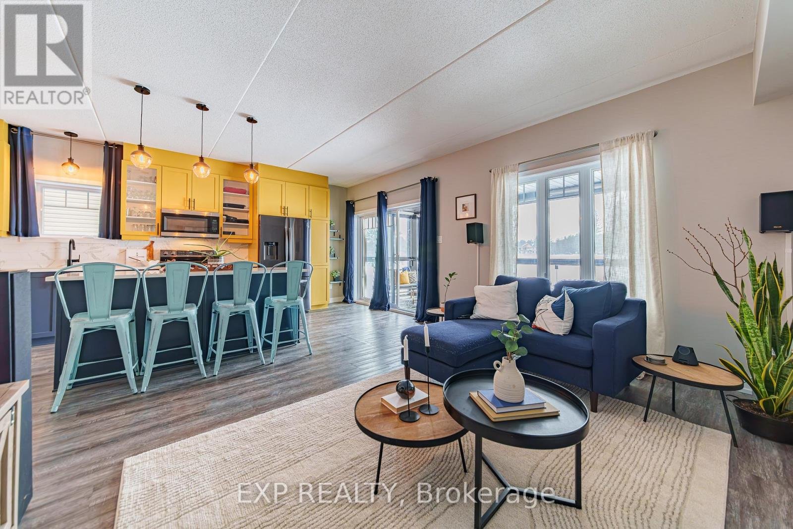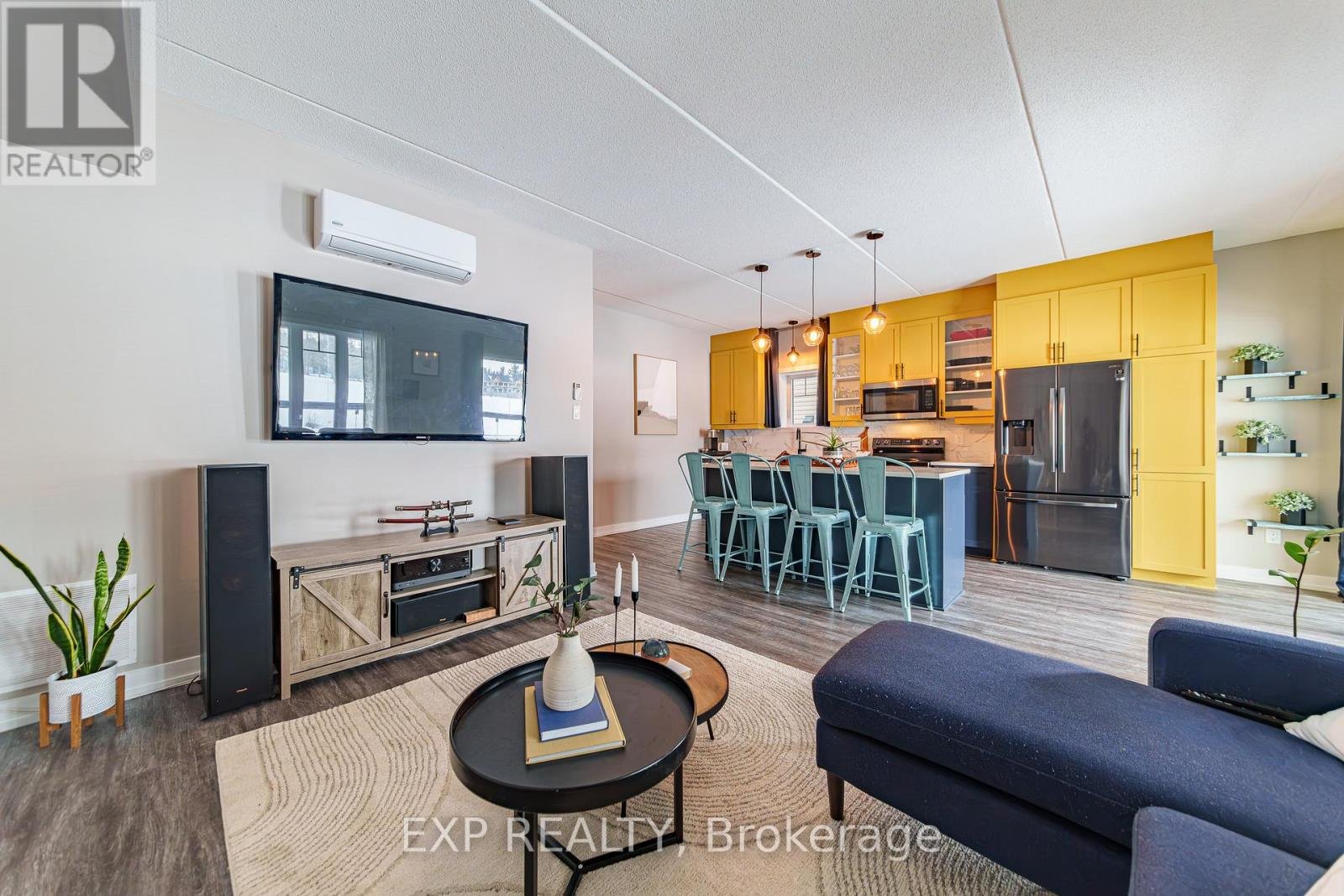 This 2021 built condo offers the perfect balance of comfort, style, and peaceful surroundings, located about 40 minutes from downtown Ottawa and just minutes from Rockland. This 9 foot ceiling unit features 2 bedrooms and 1.5 bathrooms, radiant floor heating, with one bedroom easily convertible into a home office for those working remotely. Large windows fill the space with natural light, highlighting the beautiful modern finishes throughout, including quartz countertops, soft close drawers, and sleek black titanium steel appliances. The living room is equipped with a heat pump that provides both air conditioning and heat, along with an integrated sound system for added comfort and entertainment. One of the standout features is the impressive 200 sq ft glass enclosed sunroom overlooking the golf course, complete with an electric fireplace and a pull down projector that creates the perfect space for relaxing or enjoying a cozy movie night. The balcony also includes additional storage for convenience. If you are looking to escape the busyness of downtown and enjoy a lifestyle that feels like a vacation every day, this condo is a must see.