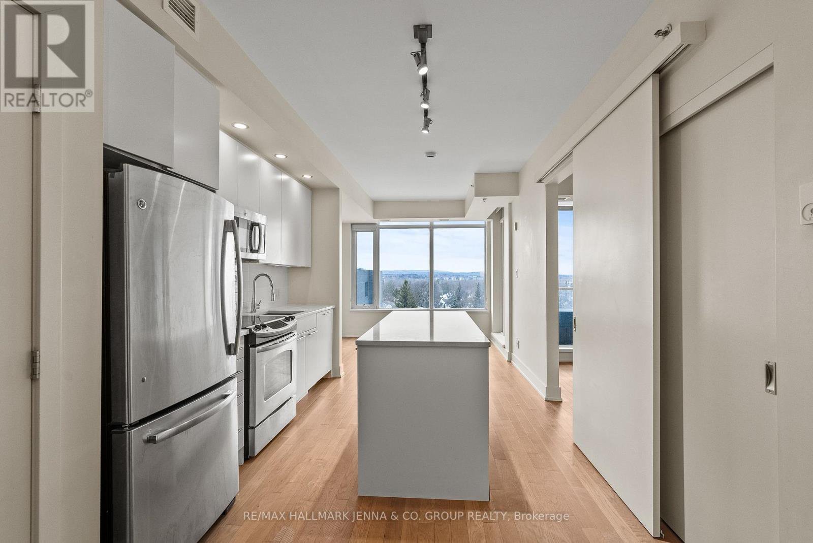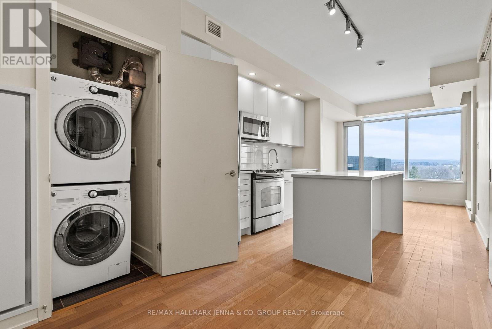 Live in style in this chic 1-bedroom, 1-bathroom condo in vibrant Westboro. This bright and modern unit features a sleek white kitchen complete with stainless steel appliances, a generous island, and ample cabinet storage. Hardwood flooring and contemporary pot lighting add to the stylish, modern feel throughout the open-concept living space. The living room boasts oversized windows that fill the unit with natural light and lead to a private balcony offering beautiful views of the Gatineau Hills landscape. The bedroom overlooks the balcony and includes a generous closet for excellent storage. A modern full bathroom and a discreet in-unit laundry closet complete the space. The unit also includes one indoor parking space and a storage locker for added convenience. Residents of Q-West enjoy outstanding amenities, including a rooftop terrace with multiple BBQs, fitness centre, theatre room, party room, pet wash station, bike storage, and more. Located in one of Ottawa's most desirable communities, you'll be steps from Westboro's cafés, restaurants, boutiques, yoga studios, and the scenic Ottawa River pathways.