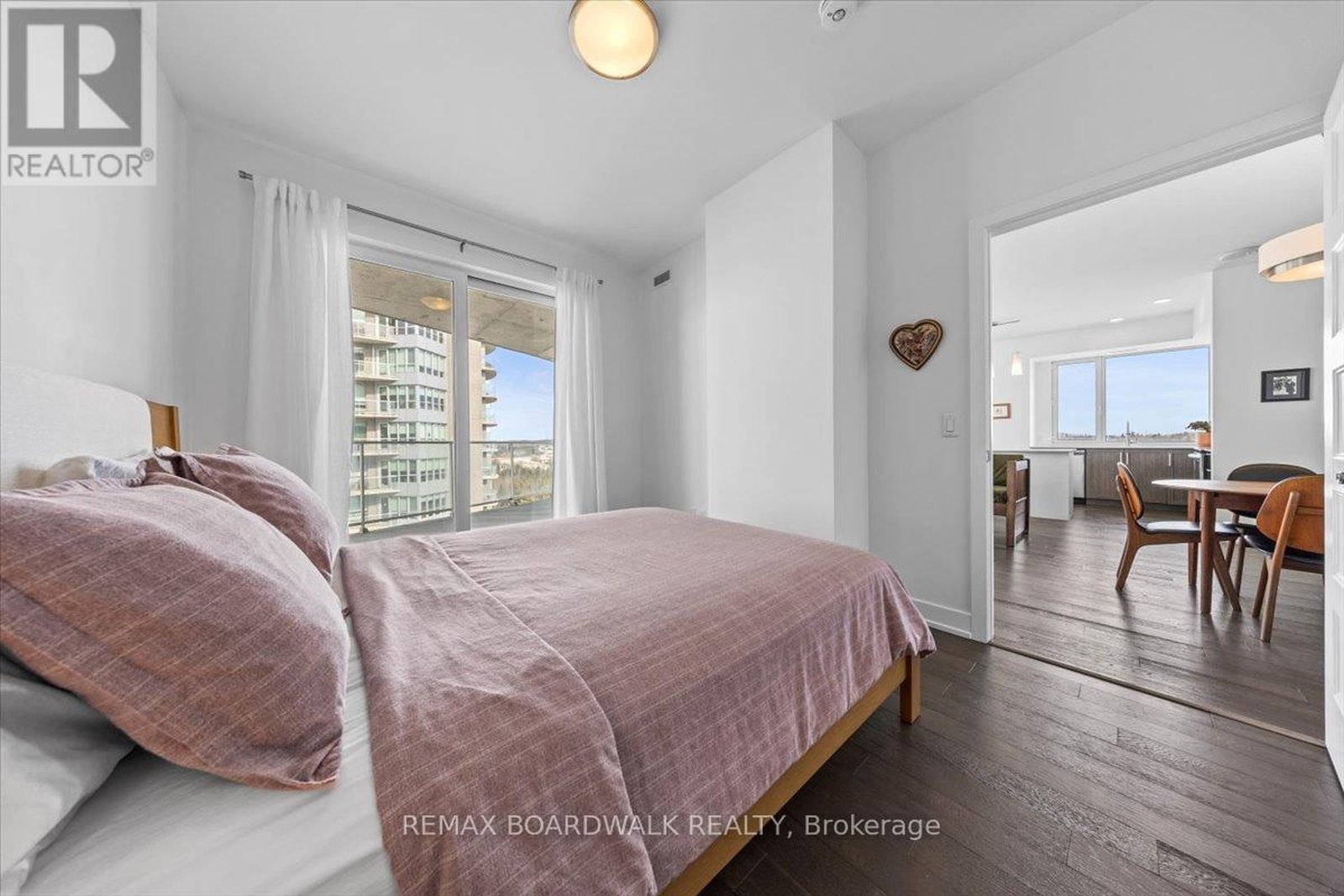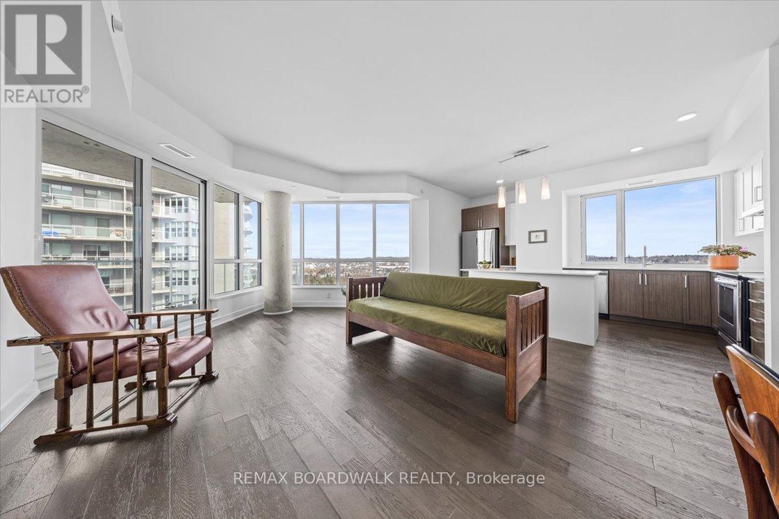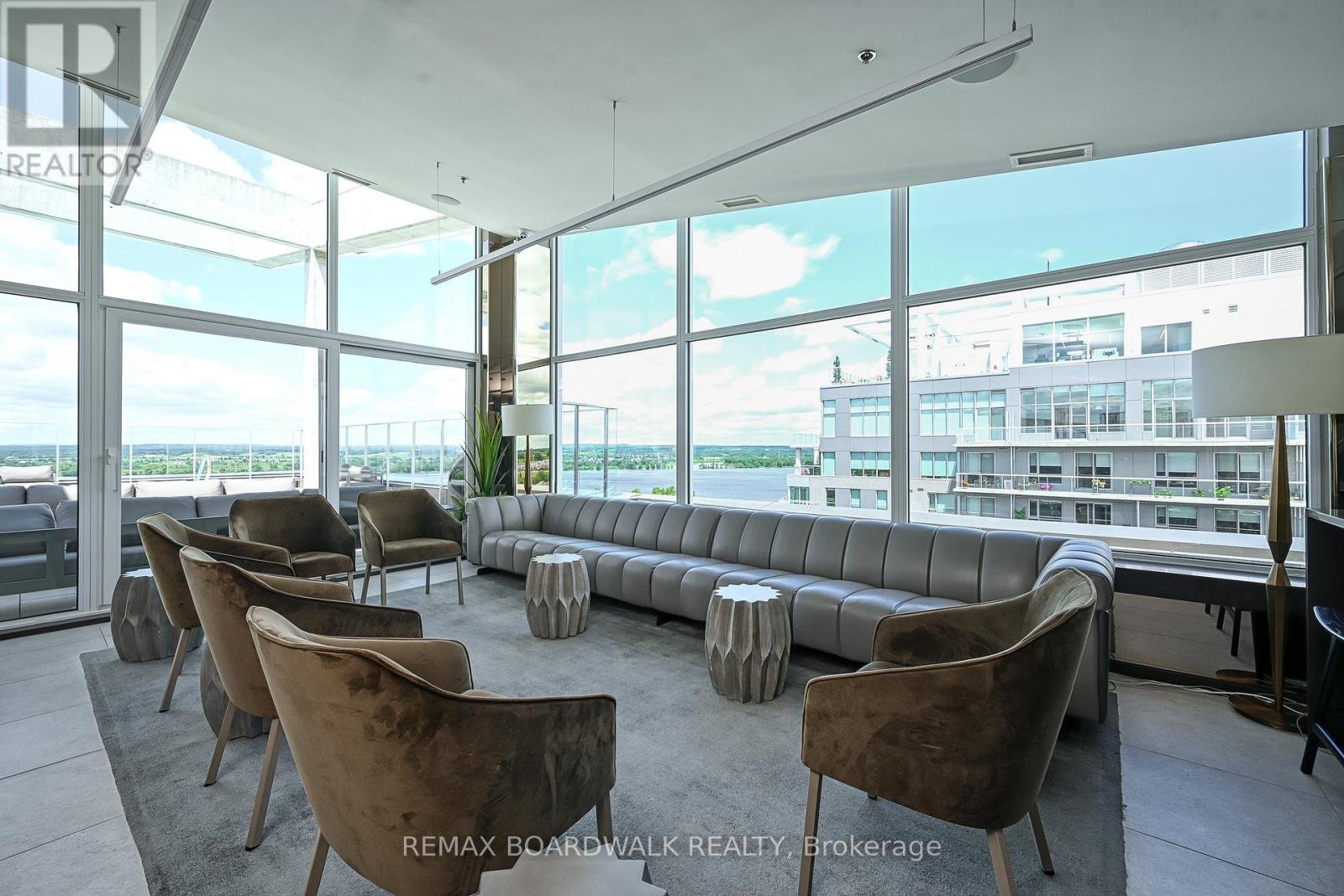 Architecturally composed corner residence w/dual covered balconies, southern exposure, & elevated Ottawa River views. This two-bedroom suite is thoughtfully designed for both form & function, offering refined materials & intentional spatial flow, 37.5" wide entry door introduces a welcoming foyer w/closet storage, setting a tone of accessibility & understated sophistication. Wide-plank engineered hardwood & oversized ceramic tile run throughout, complemented by flat ceilings, boxed baseboards, recessed pot lighting, & modern five-panel interior doors, centre-island kitchen anchors the living space w/quartz surfaces, breakfast bar seating, pot drawers, & two-tone shaker cabinetry w/integrated garage feature. A recessed double sink positioned beneath an oversized window captures natural light & river vistas. The living room's corner glazing frames panoramic water views & morning sun, while the dining area integrates a walk-in pantry for seamless entertaining, primary suite is designed as a private retreat w/its own patio door, walk-through double-sided closet, & a five-piece ensuite featuring twin vanities & a glass-enclosed shower w/rain head & European wand. The second bedroom offers a private balcony, walk-in closet, & pocket-door access to a three-piece cheater ensuite w/double-wide shower, allowing flexibility for guests or workspace, full-size laundry, a separate storage locker, & the rare inclusion of two underground parking spaces enhance livability & long-term value. Residents enjoy curated amenities including a fitness studio w/sunset views, an elegant lounge, rooftop pool, hot tub, & outdoor terrace w/BBQ area. All positioned to embrace the natural landscape of the Ottawa River. A residence defined by light, proportion, & elevated riverside living. 24 hour irrevocable on all offers.