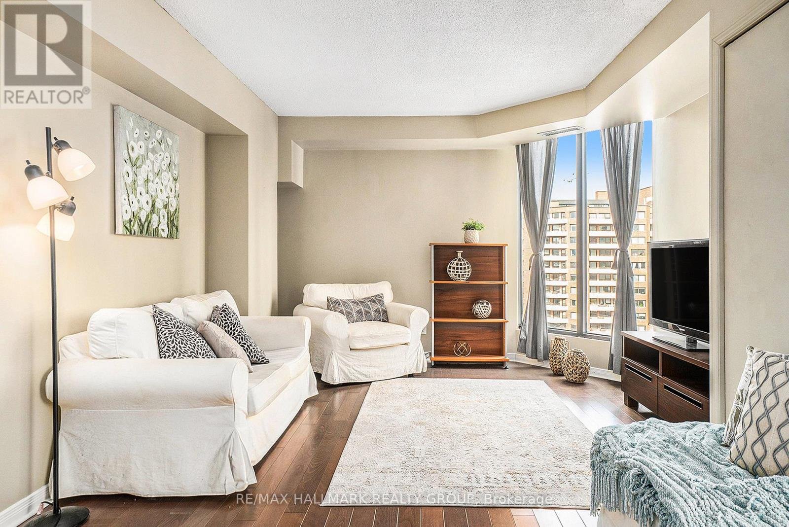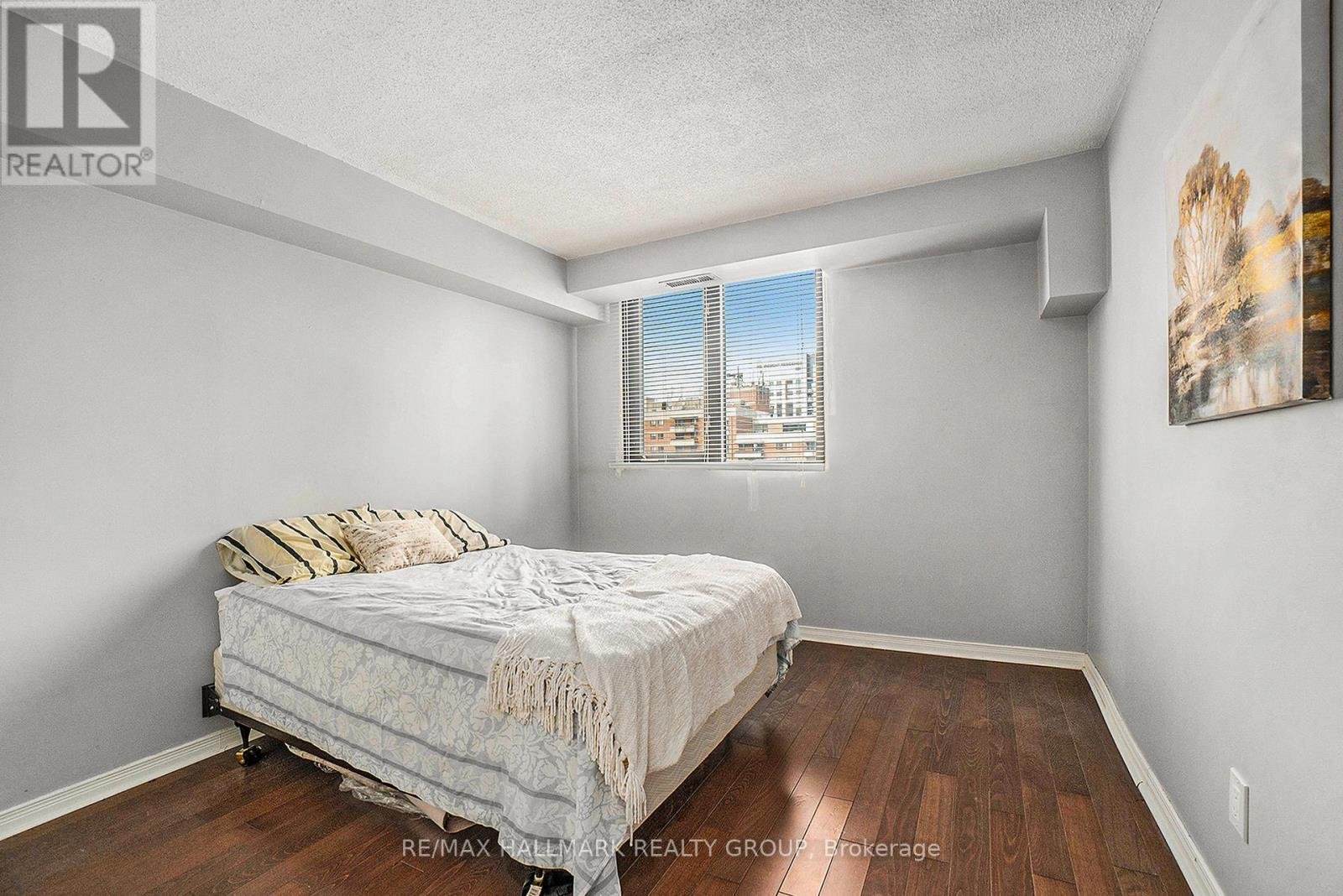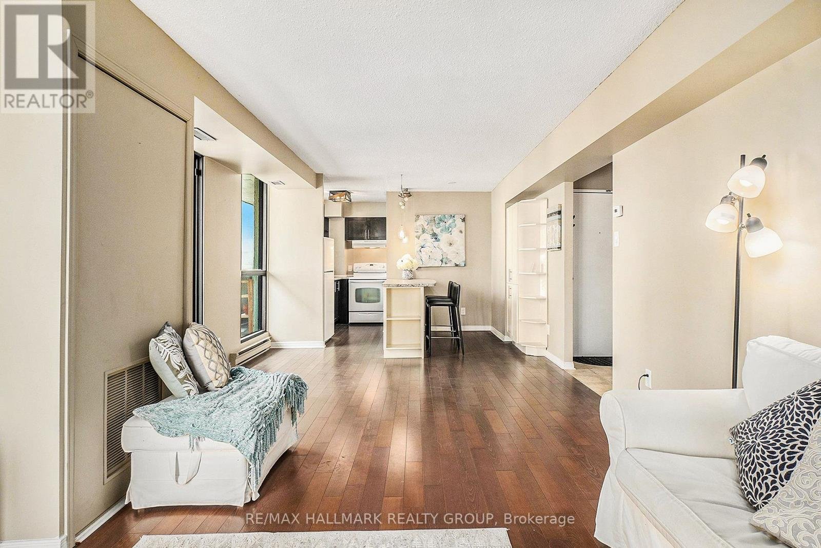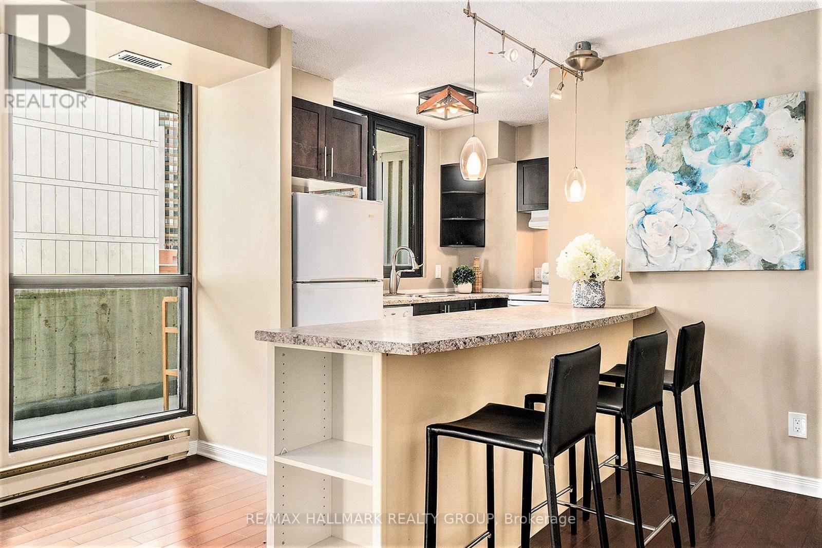 Welcome to downtown living with wonderful walkability to everything! This large, bright one bedroom and one bath home is moments from the LRT and walkable to Parliament Hill and now minutes away from a Food Basics just around the corner on Queen St. Updated kitchen features a large island for breakfast or as a work station. Extra built ins hold the essentials and much more. The open concept living and dining room space provide plenty of room for entertaining guests. With oversized windows and patio doors leading to a large balcony with great views of the downtown core - Ensuite laundry. Plus modern updated bath. Underground parking included. Pets are allowed with some restrictions. Windows (2016), new furnace/AC (2023), Hot Water Tank (2024) owned. Call today!