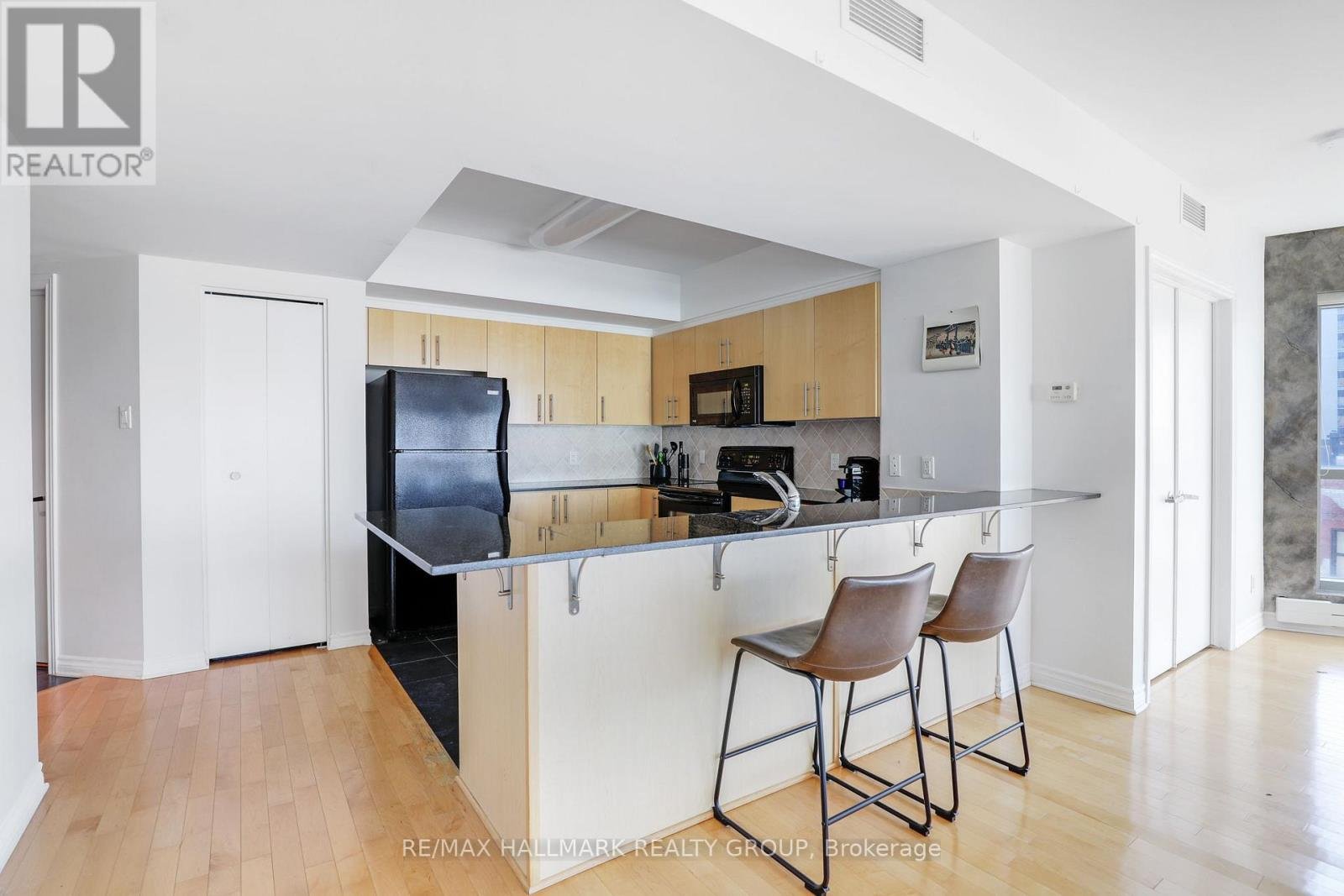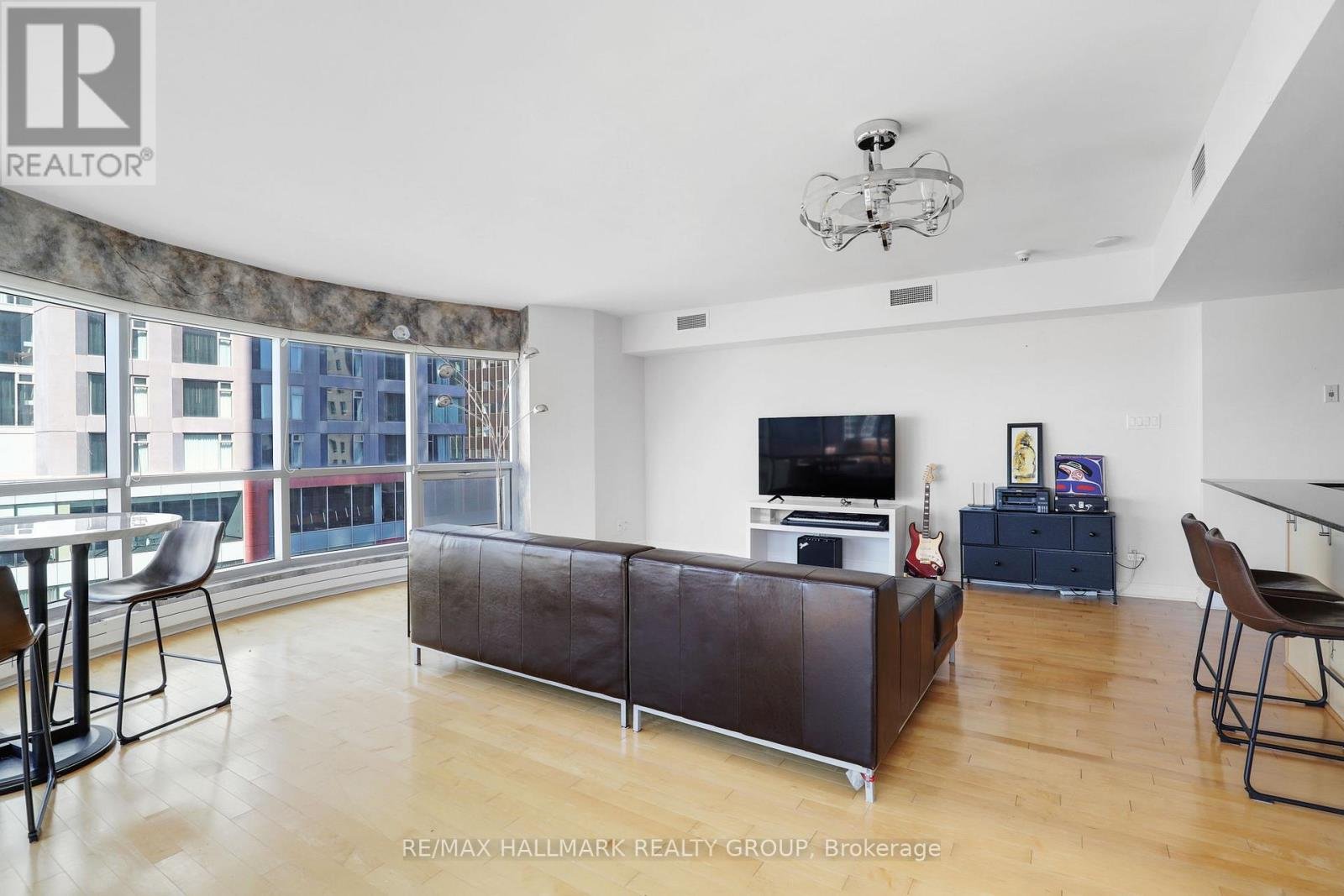 Rarely offered the Madison Model is one of the largest suites in the building with 1,238 sq. ft. of modern executive living. A dramatic curved wall of floor-to-ceiling windows with custom blinds showcases sweeping views of Parliament Hill, the ByWard Market, and the Gatineau Hills. The spacious primary bedroom includes a walk-in closet, full ensuite, and private balcony, while the bright second bedroom offers flexibility for guests or a home office. The open kitchen features granite counters, ample cabinetry, and an eat-in bar, flowing into the light-filled living and dining space. In-suite laundry, hardwood floors, and a separate storage locker add everyday convenience. Enjoy year-round amenities including an indoor pool, fitness centre, theatre room, lounge, rooftop terrace with BBQs, and 24-hour concierge. The underground garage provides secure parking, a car wash bay, and welcome relief from Ottawas winter weather.Unbeatable location -walk to restaurants, shopping, the Rideau Centre, ByWard Market, and transit including the LRT. Whether relaxing on the rooftop patio in summer or enjoying maintenance-free comfort through snowy months, this home delivers the best of four-season downtown living.Only a handful of this round-corner Madison Model are ever available, don't miss this exceptional opportunity.