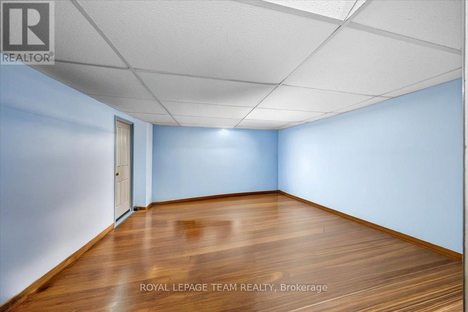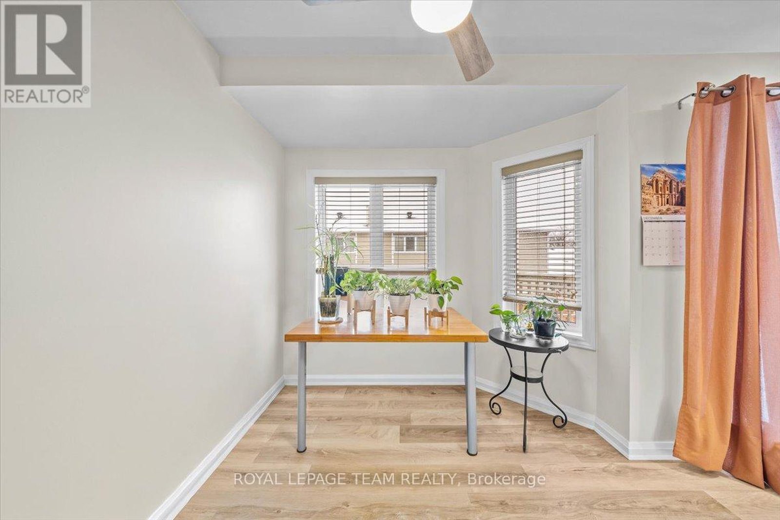 Welcome to a bright, updated, carpet-free 3-bedroom, 2-bathroom condo townhome located in a desirable neighbourhood featuring two covered parking spaces. The lower level features a convenient 3-piece bathroom, laundry room, and a versatile den/office/storage. The main level showcases a renovated kitchen with eating area, modern cabinetry, and pot lights, with direct access to a large balcony-perfect for relaxing or enjoying summer BBQs. A generously sized dining room with built-in shelves and cabinetry flows into a spacious living room highlighted by a wood-burning fireplace, all set on luxury vinyl flooring. This level also leads to a fenced, landscaped yard. Upstairs, you'll find a well-sized primary bedroom with built-in closet cabinetry, along with two additional bedrooms. All three bedrooms feature ceiling fans and laminate flooring. Ideally situated close to public transit, schools, parks, playgrounds, the O-Train, shopping, Costco, restaurants, and more, with easy access to Highway 417.