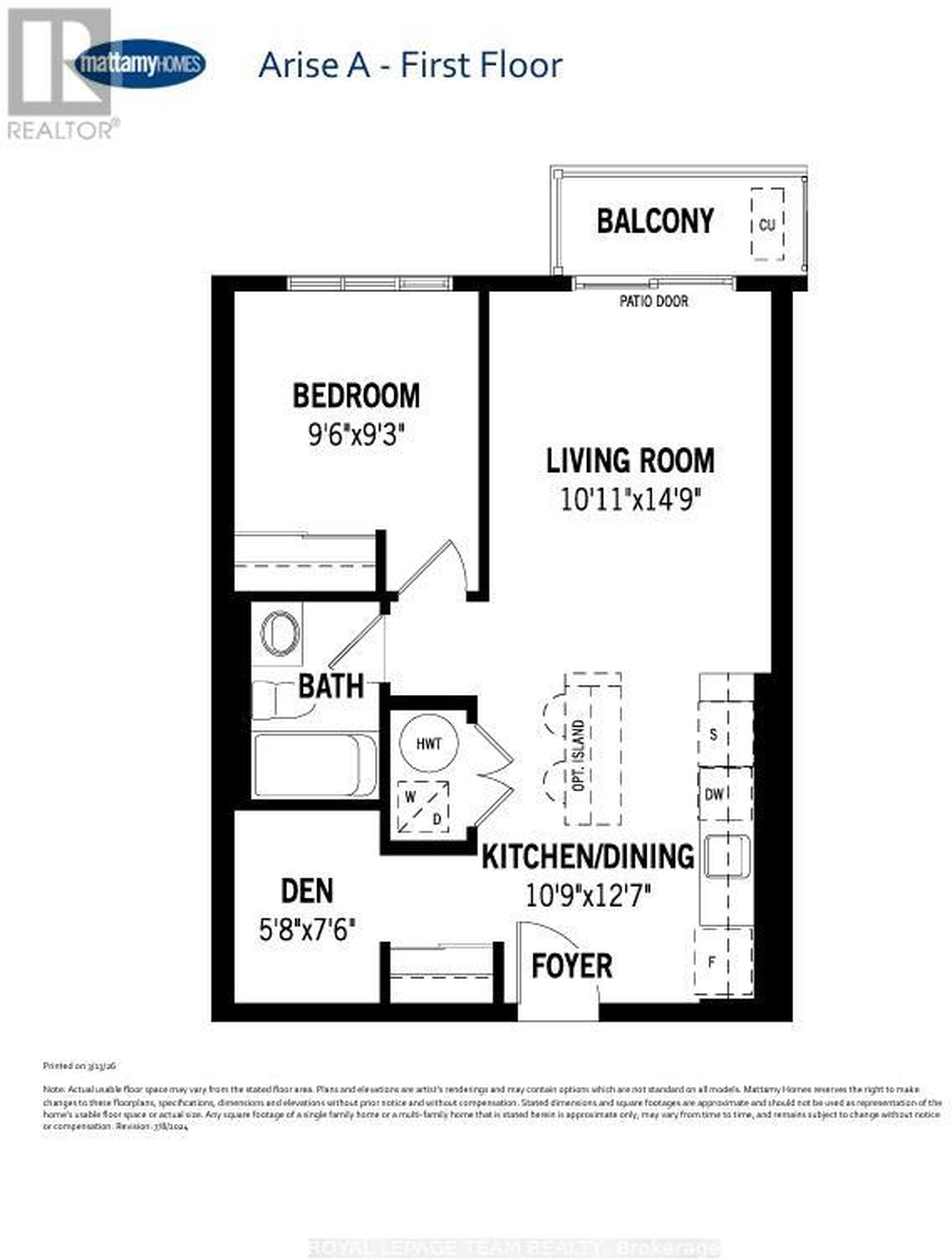 Welcome to the Arise A model by Mattamy Homes, located in the sought-after Avalon community of Orléans. This brand-new 624 sq. ft. condo features a welcoming foyer with a closet, and a stylish chef-inspired kitchen with quartz countertops and a modern backsplash, all opening to a bright dining and living area with access to a private balcony. Offering one bedroom plus a den, one full bathroom, and a dedicated laundry room, this home is designed with convenience and modern finishes in mind. Enjoy 9-foot smooth ceilings, luxury vinyl plank flooring throughout (no carpet), and one parking space. Perfectly situated near parks, trails, recreation centres, shopping, dining, and transit, this condo combines style, comfort, and everyday convenience. 2 years no condo fees. Images provided are to showcase builder finishes only.