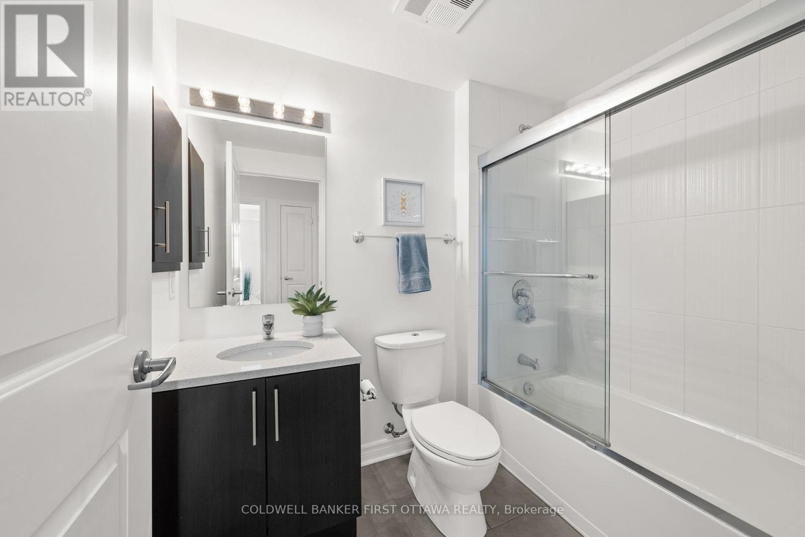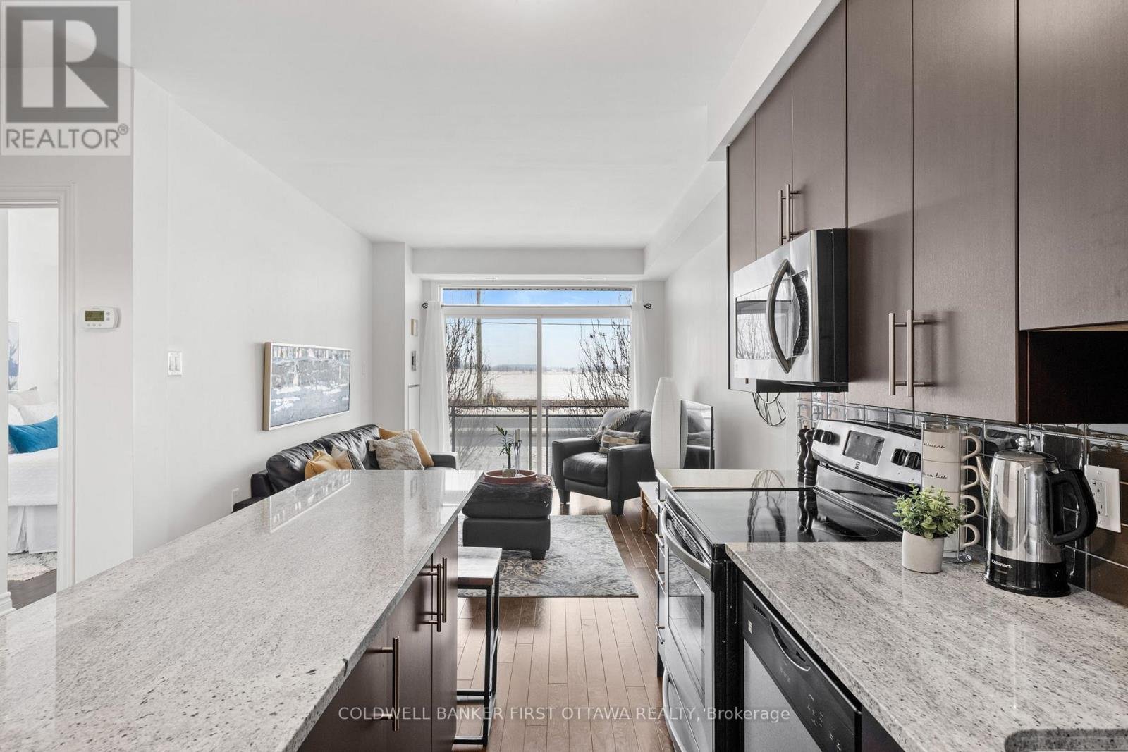 Condos with underground parking in Barrhaven DO exist!! This beautifully maintained 1 bed condo offers maintenance free living, UNDERGROUND parking, modern comforts, easy access to transit - and all with a view! This super bright unit features 9-foot ceilings, hardwood flooring, and a functional open-concept layout ideal for relaxing, working from home and entertaining. The kitchen showcases stainless steel appliances (with a new fridge!), tile backsplash, and an awesome centre island with a granite countertop - a great spot for a Zoom meeting, dinner or catching up over a coffee with a close friend. The generous cupboard and counter space work very well for your day to day storage and air fryer needs as well. The living room is a cozy spot for your next Netflix binge, or step out on the balcony and enjoy the view with no front neighbours. The spacious primary bedroom is complemented by in-unit stacked laundry and a stylish full bath with tiled shower and quartz vanity. Heated underground parking is included, and residents enjoy access to a well-equipped fitness room. With transit LITERALLY right outside the front door and proximity to all of Barrhaven's shops, restaurants, and scenic walking/cycling paths, this is an excellent opportunity for first time buyers, down sizers and investors!