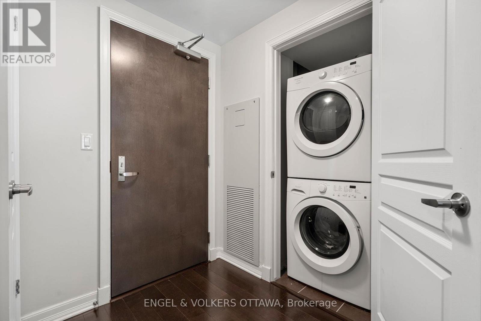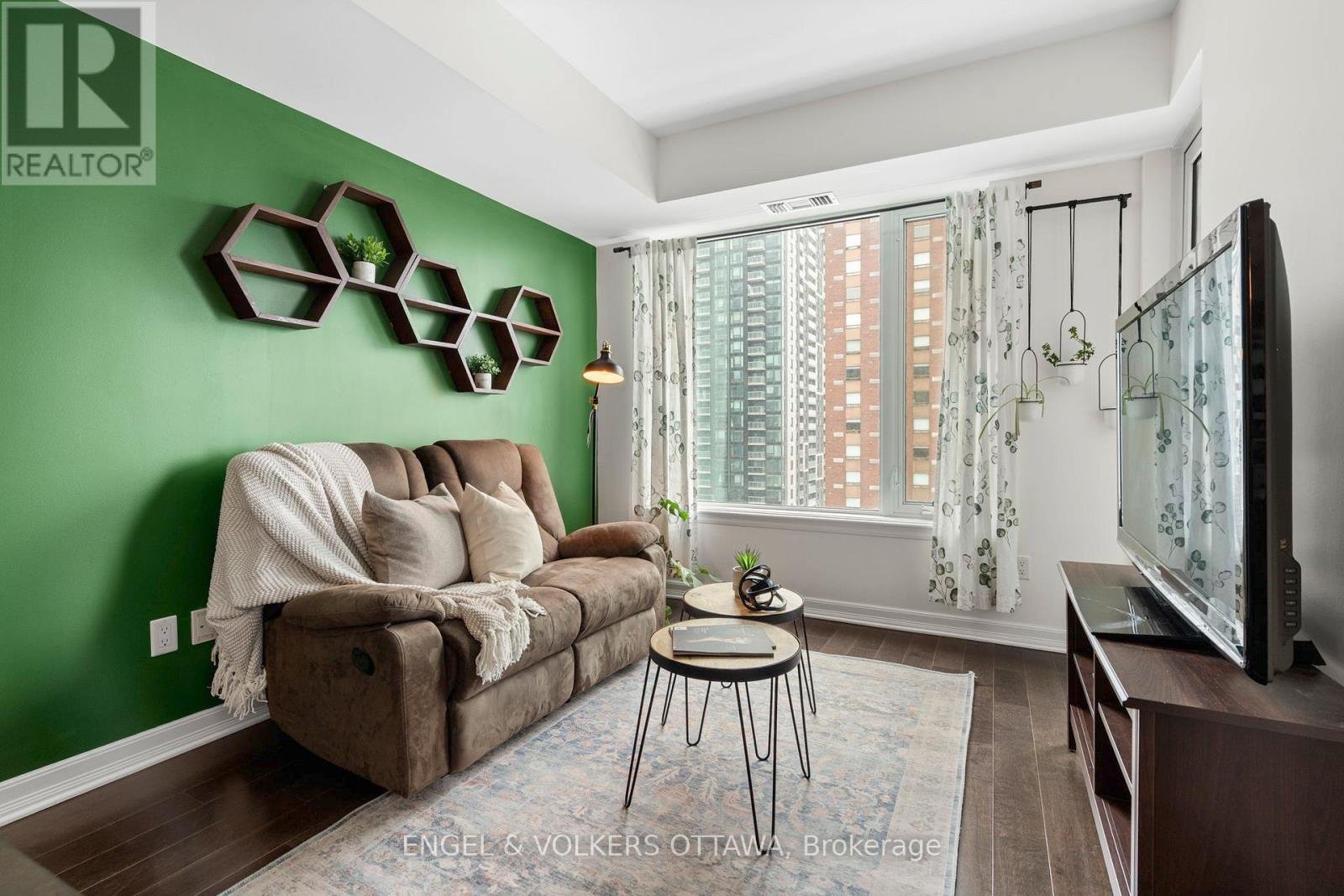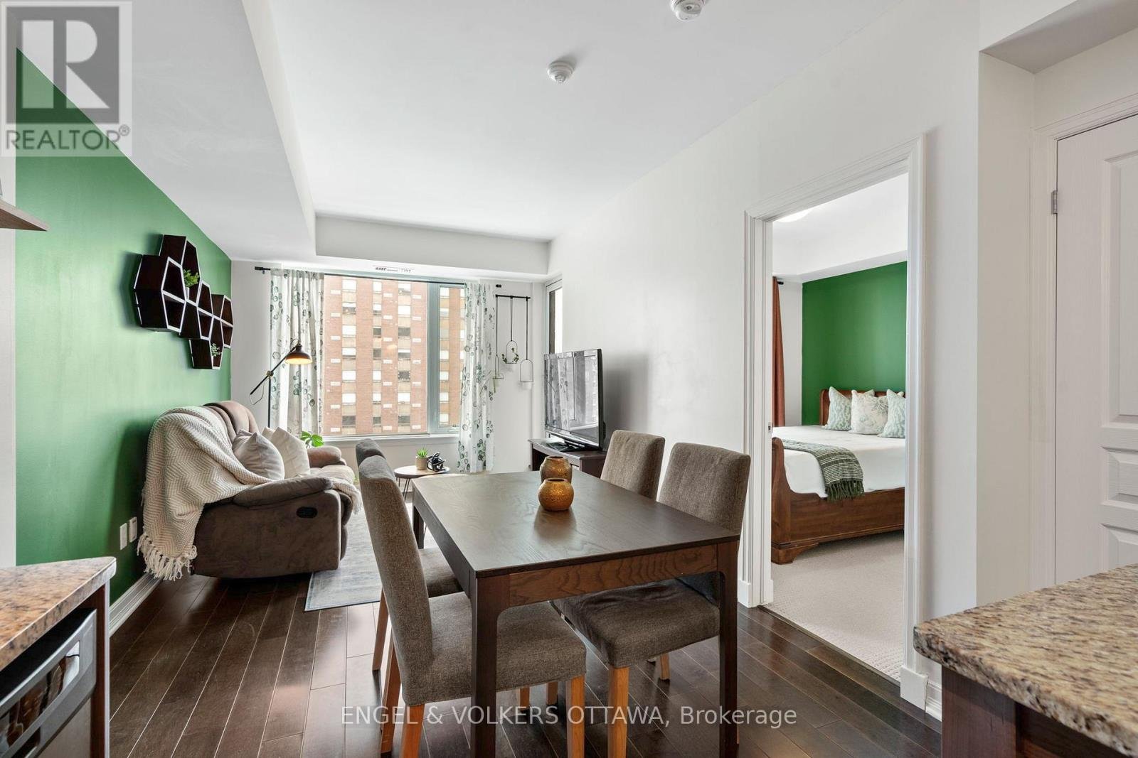 A bright and functional 1-bedroom + den condo in the heart of downtown, offering the perfect blend of location and convenience. Featuring hardwood flooring throughout the main living areas, this space feels warm, modern, and move-in ready. The open-concept kitchen is finished with rich cabinetry, granite countertops, stainless steel appliances, and a centre island-ideal for casual dining or entertaining. It flows seamlessly into the living and dining area, creating great sightlines and an inviting space to host or unwind. Large windows fill the home with natural light and lead to a private balcony, perfect for morning coffee or taking in the city views. The bedroom offers a comfortable space with an oversized window and a full-size closet, while the versatile den provides the ideal work-from-home setup, reading nook, or guest space-adding flexibility to suit your lifestyle. Additional features include in-unit laundry, a well-appointed bathroom, and efficient use of space throughout. Located in a prime downtown setting, just steps to Metro, restaurants, cafes, shops, transit, and the Ottawa Little Theatre. Whether you're a first-time buyer, investor, or looking for a low-maintenance urban lifestyle, this is a fantastic opportunity to own in one of the city's most connected locations.