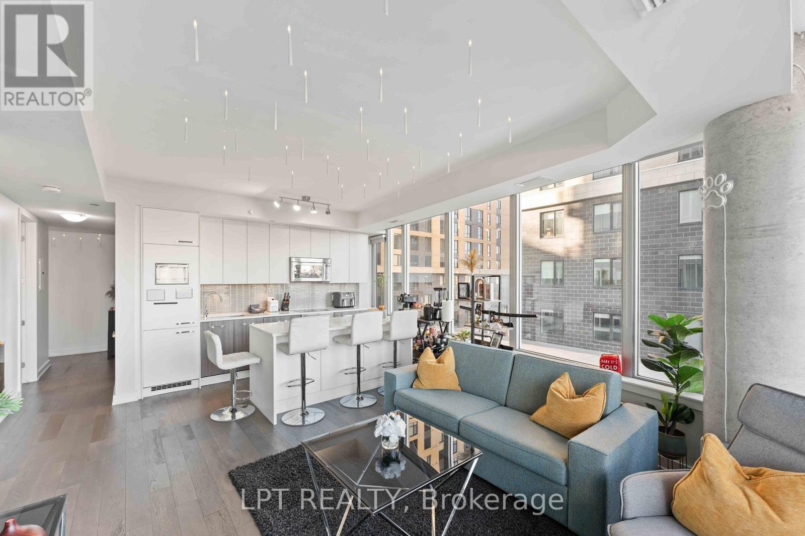Perfectly positioned for seamless indoor-outdoor living, this exceptional residence showcases breathtaking panoramic views of Dows Lake, Preston Street, and the Ottawa skyline. Located just steps away, literally one minute, from the Dows Lake LRT Station, this home offers unmatched convenience in the heart of the city, moments from the future Civic Hospital. Enjoy a true walkable lifestyle with everyday essentials and local favourites right outside your door, including a 24/7 convenience store, coffee shop, pharmacy, women's hair salon, and an upcoming dental clinic. You are also just a short stroll to Starbucks, scenic biking trails, and the vibrant Dows Lake waterfront and courts. Inside, the suite is meticulously maintained and thoughtfully upgraded. Expansive wall-to-wall windows flood the space with natural light, complemented by custom blinds and premium finishes throughout. The designer kitchen features quartz countertops, Euro-style appliances, and clean modern lines, flowing effortlessly into the living space where a sleek electric fireplace adds warmth and ambiance. The spacious primary bedroom offers direct access to a rare and stunning private terrace, creating a true indoor-outdoor retreat. It also includes a generous walk-in closet and a spa-inspired ensuite with an oversized glass shower. A second full bathroom, equally well-appointed with a walk-in shower, is ideal for guests or family. Additional highlights include upgraded flooring, pot lighting, and full in-suite laundry. Step outside your unit to enjoy convenient access to the building's BBQ terrace and hot tub, located just steps away on the same floor. Residents also enjoy access to premium building amenities, including a swimming pool, theatre room, and party room, all within a secure, concierge-serviced building with a full fitness centre. This suite also includes a parking space with EV charging, ideally situated near the secure entrance, completing a truly elevated urban living experience.