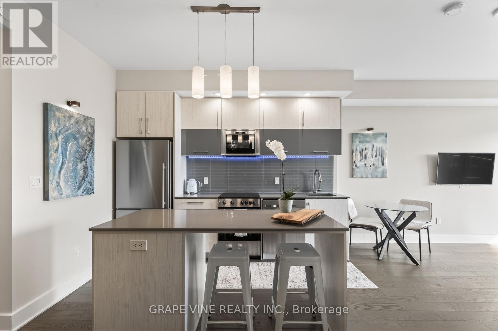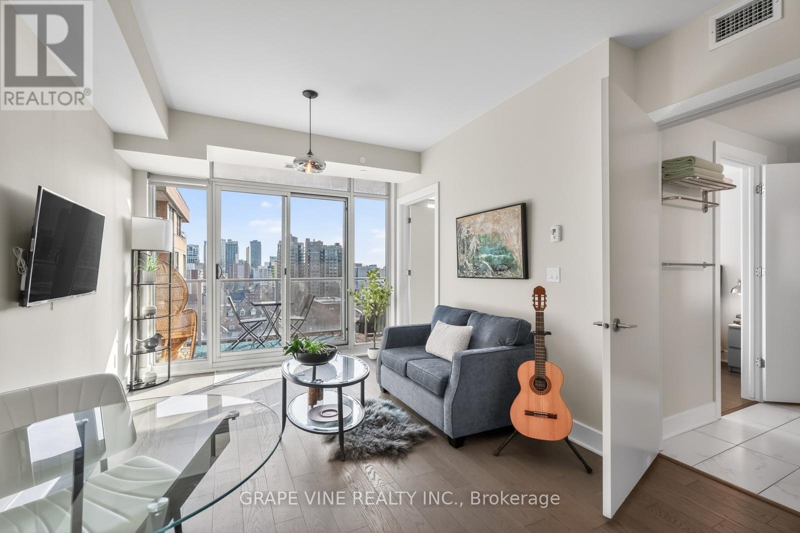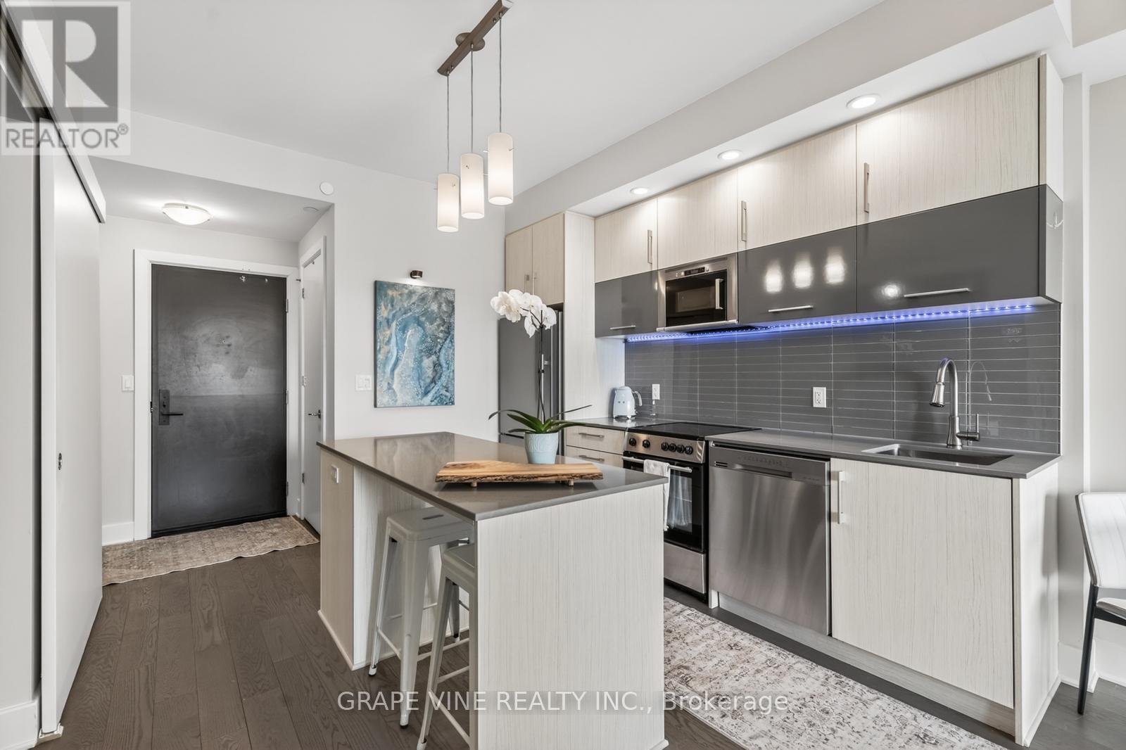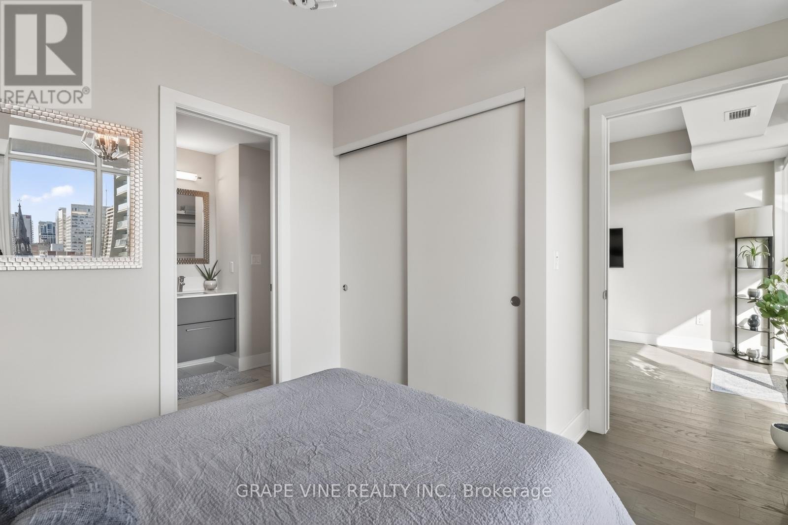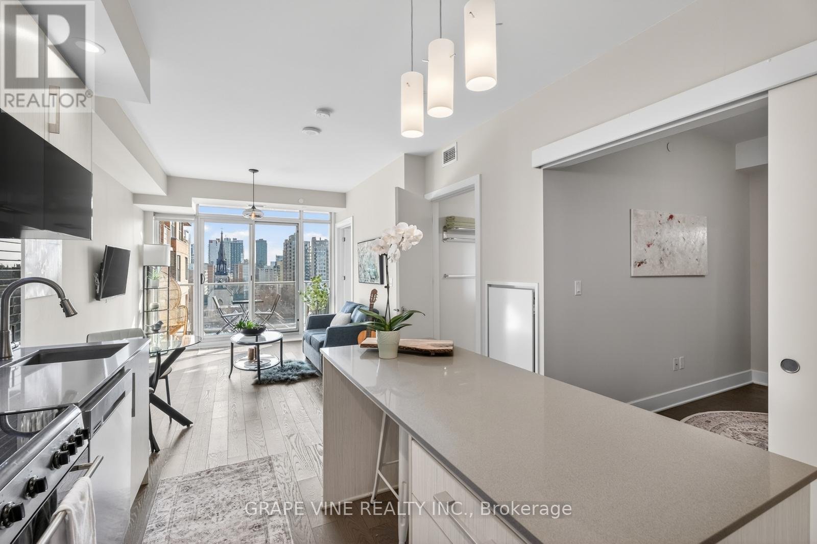 Bright 1-Bedroom + Large Den at 255 Bay Street - Oversized Balcony, Modern Kitchen, and Stunning Downtown Views. Welcome to this beautifully designed 1-bedroom plus large den condo at 255 Bay Street. This warm, spacious suite features an east-facing exposure that fills the home with soft morning light and offers unobstructed downtown views overlooking a historic church-creating a peaceful, open atmosphere in the heart of the city.Suite Highlights. Spacious primary bedroom with high-end finishes, floor-to-ceiling windows, direct bathroom access, and a full-size closet. Rare oversized 21' x 6' balcony-perfect for a dining table, outdoor sofa, and coffee table, creating a true outdoor living space with stunning views. Large den (approx. 8.5' x 11') with sliding barn door, full closet, and study nook-ideal as a guest room, office, or studio (fits a queen bed)In-suite laundry with new high-efficiency front-load machines. Air conditioning and efficient heating for year-round comfort. Modern kitchen with stainless steel appliances (including a brand-new range), large island with bar seating, pot lights, ample cabinetry, and space for a dining table-rare for a 1+den layout. Stylish bathroom with deep tub/shower combo, large medicine cabinet, and designer mirror. Excellent storage throughout, plus a secure basement locker. Building Amenities. Enjoy premium amenities including an indoor pool, fully equipped gym, outdoor terraces, BBQ area, sauna, large party room, guest suites, and outdoor lounge space. Neighborhood. Located in downtown Ottawa, steps to the O-Train, Parliament Hill, groceries, restaurants, bars, and everything Centretown has to offer.