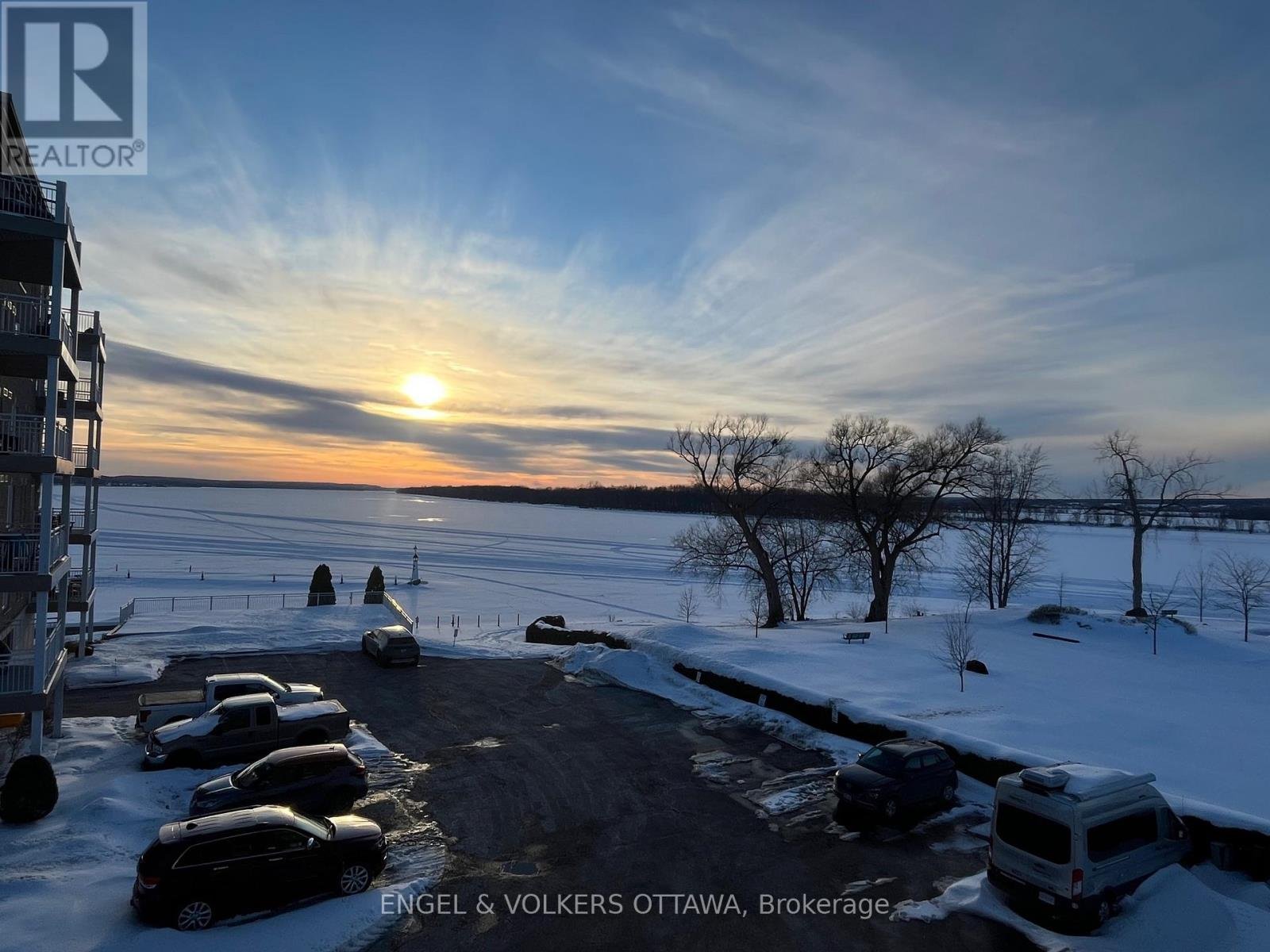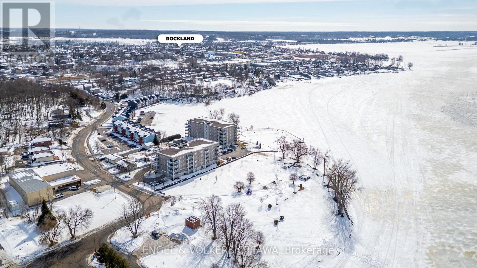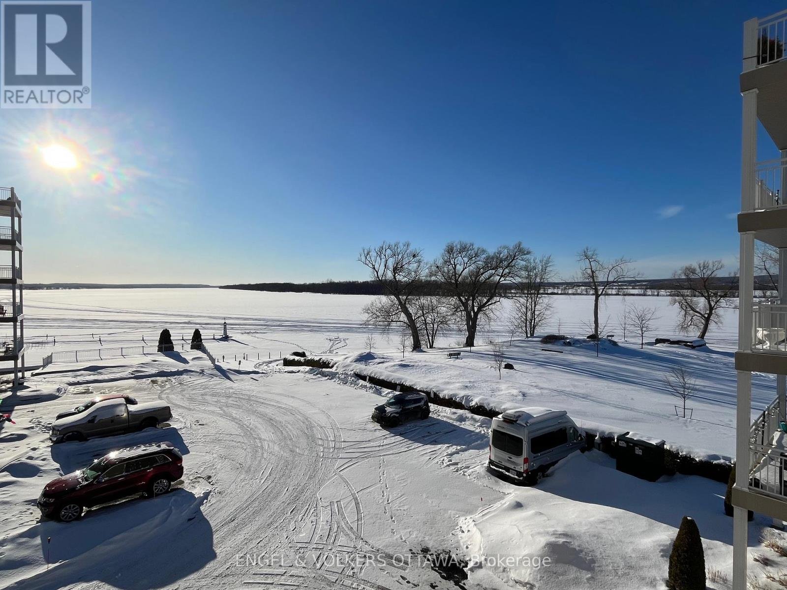 This bright and spacious corner unit with 1,165 sq ft of living space and a wrap-around balcony is positioned along the scenic banks of the Ottawa River. The apartment's position on the 2nd level of the building gives it direct waterfront views, incredible daylight, & beautiful sunsets over the water. Its living room is anchored by a gas fireplace, has access through two sliding glass doors to the river-facing balcony, & features hardwood flooring, which runs through the living areas, creating a warm, cohesive atmosphere. The well-appointed kitchen features white cabinetry, quartz countertops, stainless steel appliances, ample counter space & storage, & direct access to a corner pantry. A laundry room/powder room is found by the front entrance to the unit. The primary bedroom features a large walk-in closet, while the second bedroom includes a custom-built-in wall unit with a Murphy bed, shelving, & a dedicated desk area, making it ideal as both a guest room & a home office. The spacious main bathroom offers a luxurious soaking tub, a separate glass-enclosed shower, & additional cabinetry. This unit includes an underground parking space & a larger-than-average storage locker, also plenty of outdoor parking is available. The complex has a car wash in the garage, a workshop, a party room, an exercise room, & a scenic outdoor BBQ area with a dedicated kitchen & fridge, located just steps from the river. From the grounds, you can access the marina, Du Moulin Park, walking paths, & plenty of green space, making it ideal for those seeking a calm, quiet home. The town of Rockland has a small-town atmosphere while still being close to everyday amenities, restaurants, grocery stores, shops, & essential services along Laurier Street, as well as a library, YMCA, indoor pool, fitness facilities, & community programming. Quick access to Highway 17 makes commuting into Ottawa simple and efficient, all while living in a picturesque setting.