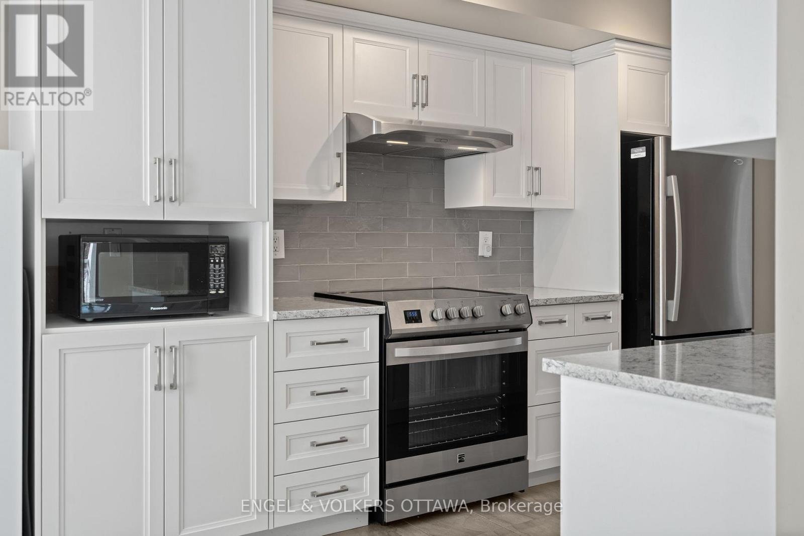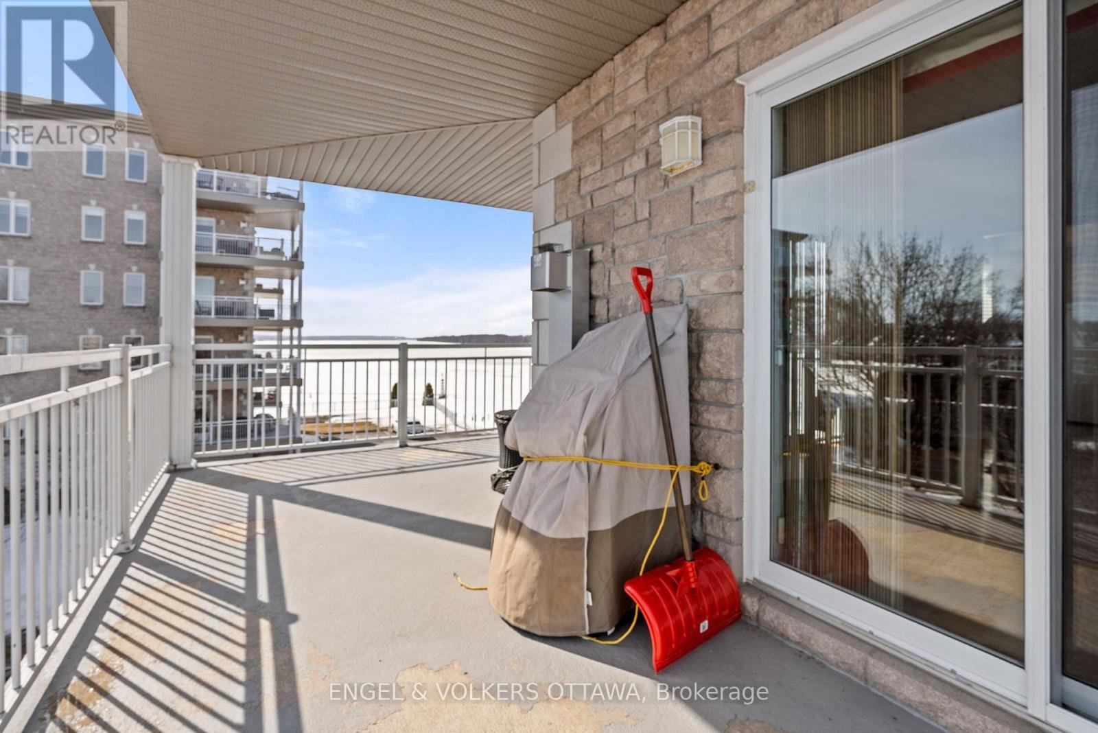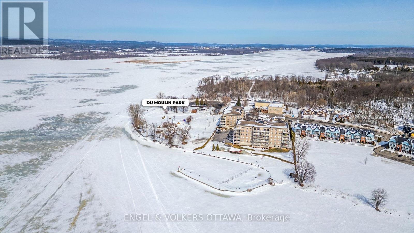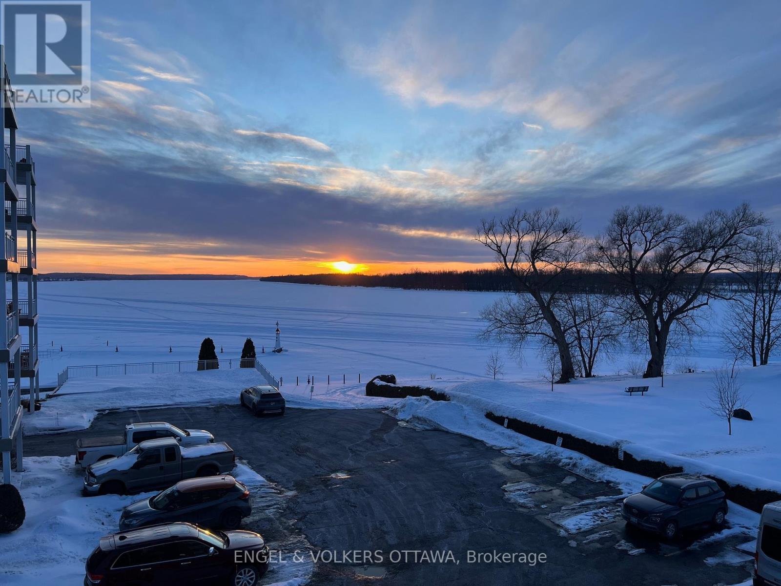 This bright and spacious corner unit with 1,165 sq ft of living space and a wrap-around balcony is positioned along the scenic banks of the Ottawa River. The apartment's position on the 2nd level of the building gives it direct waterfront views, incredible daylight, & beautiful sunsets over the water. Its living room is anchored by a gas fireplace, has access through two sliding glass doors to the river-facing balcony, & features hardwood flooring, which runs through the living areas, creating a warm, cohesive atmosphere. The well-appointed kitchen features white cabinetry, quartz countertops, stainless steel appliances, ample counter space & storage, & direct access to a corner pantry. A laundry room/powder room is found by the front entrance to the unit. The primary bedroom features a large walk-in closet, while the second bedroom includes a custom-built-in wall unit with a Murphy bed, shelving, & a dedicated desk area, making it ideal as both a guest room & a home office. The spacious main bathroom offers a luxurious soaking tub, a separate glass-enclosed shower, & additional cabinetry. This unit includes an underground parking space & a larger-than-average storage locker, also plenty of outdoor parking is available. The complex has a car wash in the garage, a workshop, a party room, an exercise room, & a scenic outdoor BBQ area with a dedicated kitchen & fridge, located just steps from the river. From the grounds, you can access the marina, Du Moulin Park, walking paths, & plenty of green space, making it ideal for those seeking a calm, quiet home. The town of Rockland has a small-town atmosphere while still being close to everyday amenities, restaurants, grocery stores, shops, & essential services along Laurier Street, as well as a library, YMCA, indoor pool, fitness facilities, & community programming. Quick access to Highway 17 makes commuting into Ottawa simple and efficient, all while living in a picturesque setting.