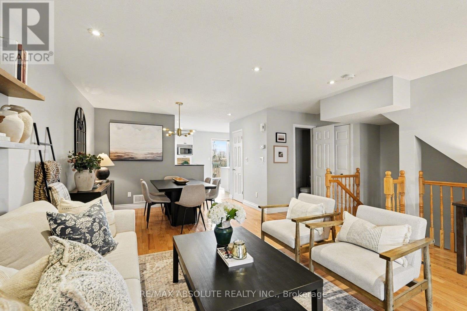 This move-in ready 2-bedroom, 2-bath stacked condo offers style, comfort, and convenience in a prime location just steps from transit, shopping, parks, and recreation. The home features dramatic two-storey windows that flood both the open-concept main floor and the lower-level family room with natural light. The main level showcases a spacious living and dining area with gleaming hardwood and pot lights throughout, creating a warm and inviting atmosphere. At the rear, the generous kitchen offers a functional layout with abundant cabinetry, an eat-in area, and direct access to a private deck with no rear neighbours-perfect for outdoor dining or relaxing. Updated tile flooring adds a fresh, contemporary touch, and a well-appointed powder room completes this level. The lower level is a true highlight, featuring upgraded laminate flooring throughout, soaring ceilings, and expansive windows in the impressive family room, ideal space for entertaining or unwinding. The primary bedroom includes a walk-in closet and direct access to a 4-piece ensuite. A second bedroom provides flexibility for guests, a home office, or additional living space. One surface parking spot conveniently located right outside the front door, along with ample visitor parking. Situated in a vibrant, welcoming community, it's a fantastic opportunity for first-time buyers or those looking to downsize. Book your viewing today!