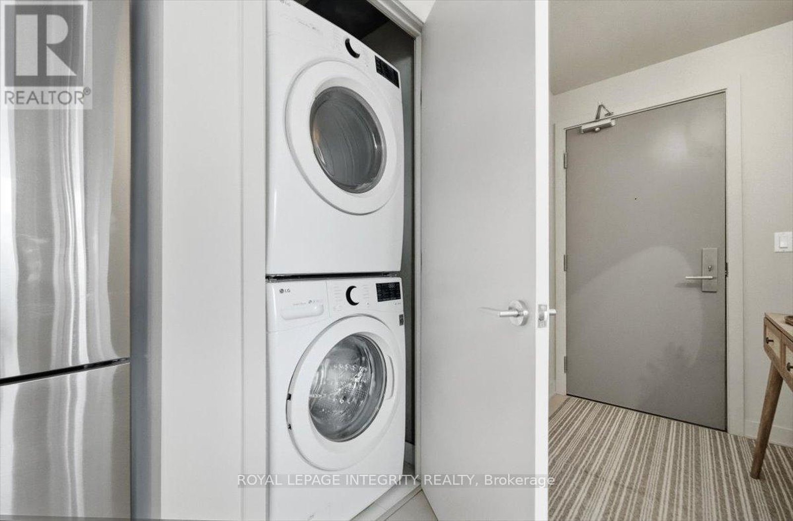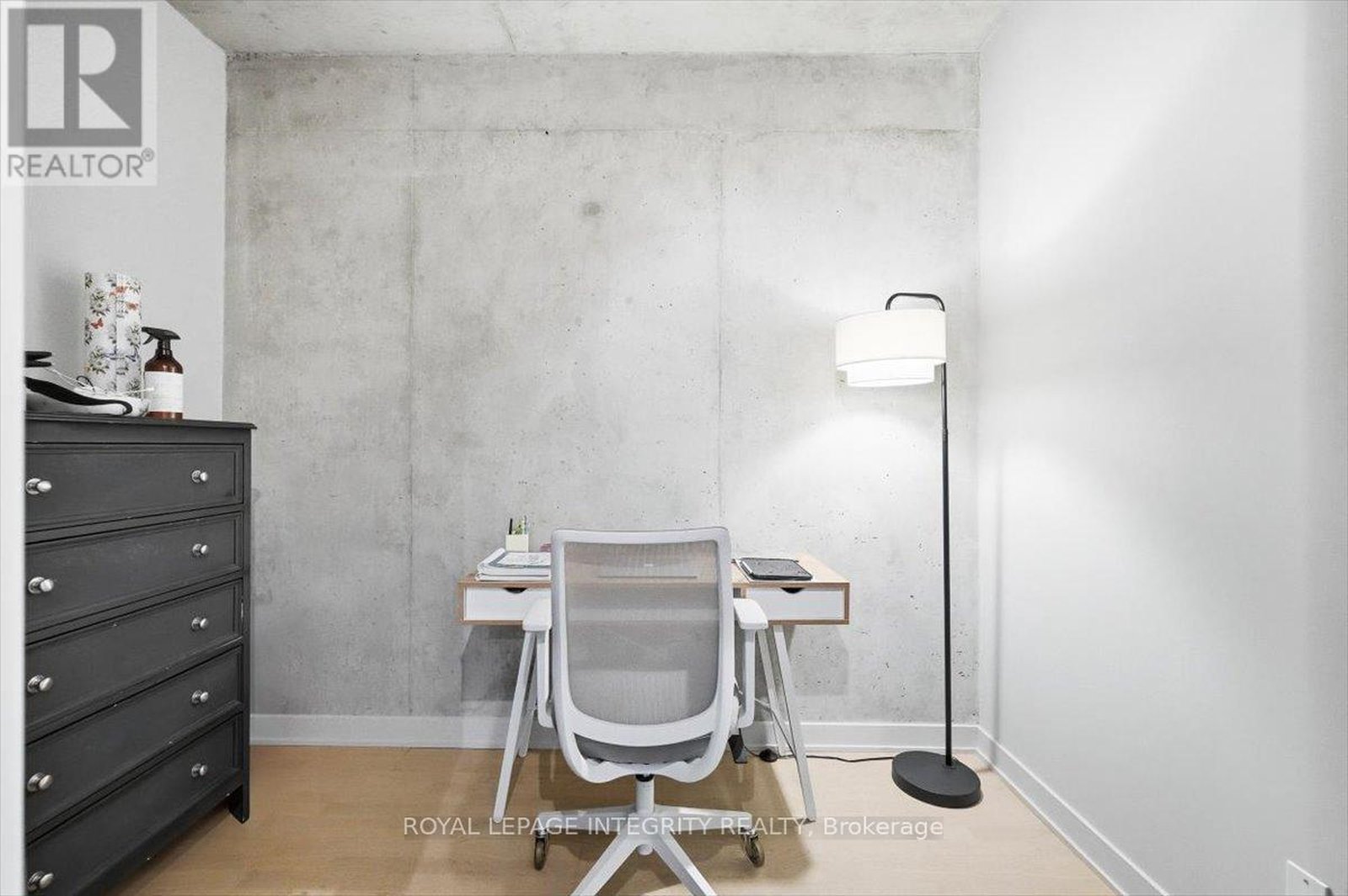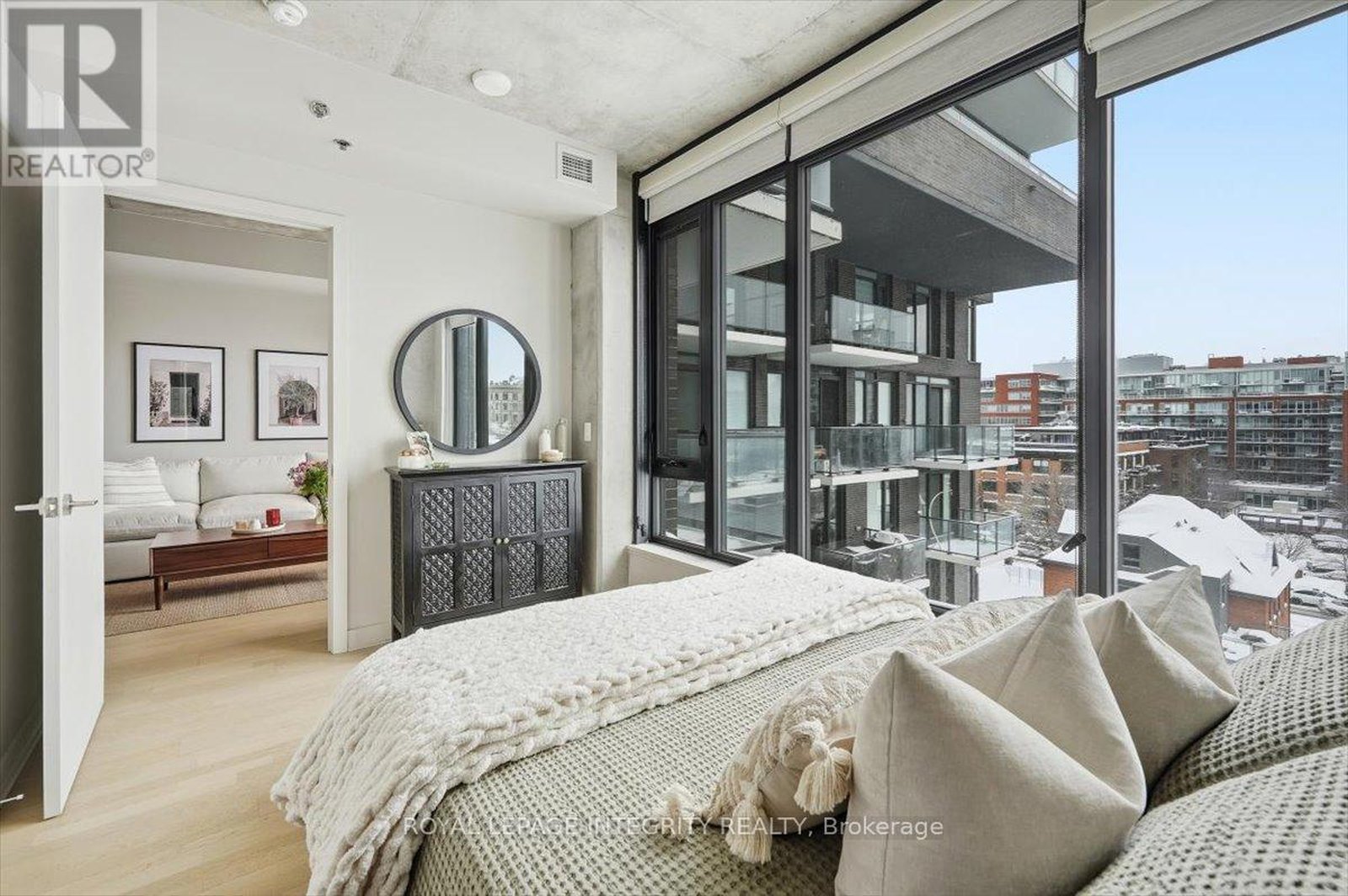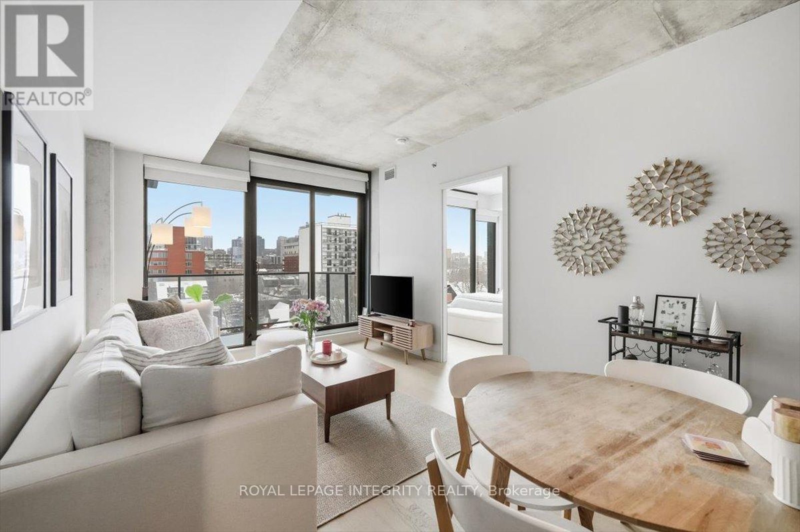 Welcome to this stunning 1 bedroom + den condo in sought-after SoBa. This modern space impresses with 9-foot exposed concrete ceilings, a striking feature wall, and warm hardwood floors throughout. The sleek European-style kitchen offers quartz countertops, a stylish backsplash, built-in stainless steel appliances including a gas stove, and a generous center island overlooking the bright open-concept living and dining area with floor-to-ceiling windows and patio doors leading to your private balcony. The spacious primary bedroom features a walk-in closet, while the versatile den is ideal for a home office or flex space. A contemporary bathroom showcases a deep soaker tub with shower and elegant 12" x 24" tile, complemented by the convenience of in-suite laundry. One underground parking space is included. Enjoy exceptional building amenities such as a modern Sky Garden party room, outdoor pool, concierge service, and security system. Ideally located just steps from the shops, cafés, restaurants, and cultural spots of The Glebe, with easy access to Bank Street and Elgin Street. A rare opportunity to own a stylish condo that perfectly blends luxury, lifestyle, and value.