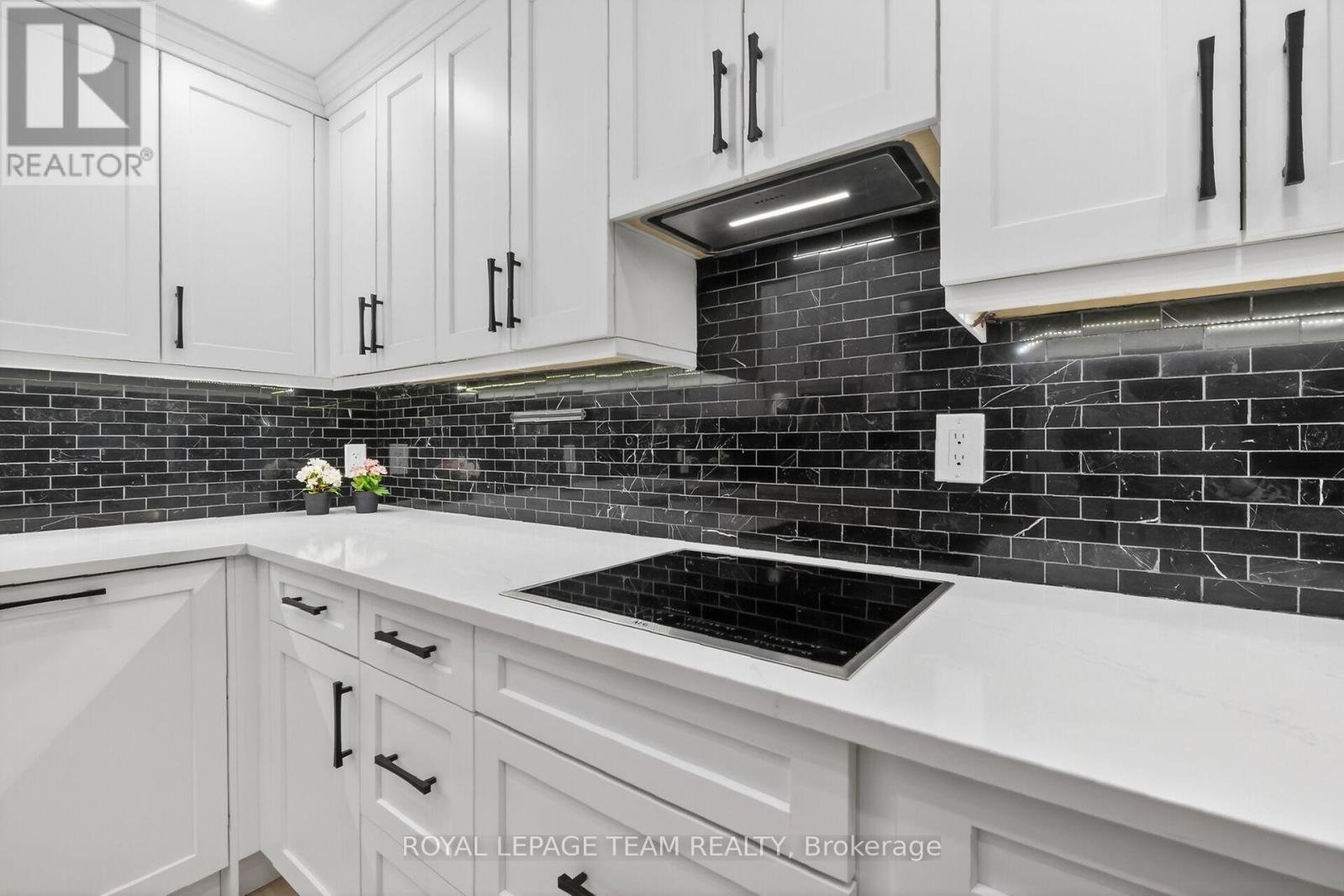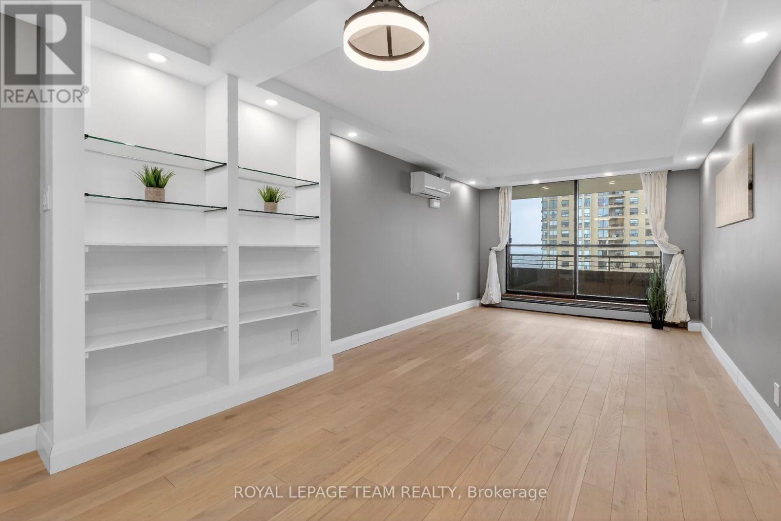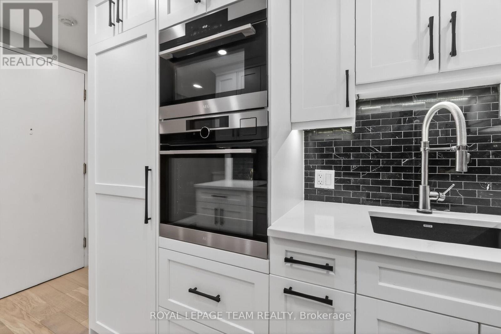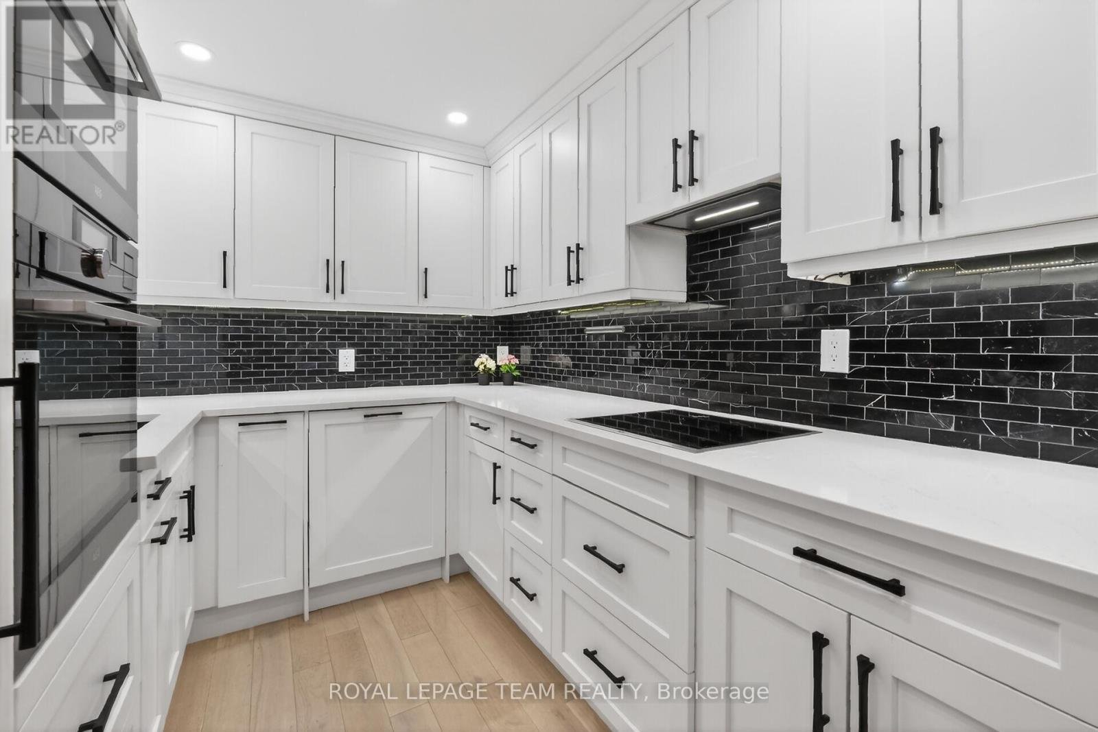 Stop the car! A gorgeous, beautifully updated two-bedroom apartment at The Highlands. This is arguably the finest two-bedroom unit in the building, featuring high-end renovations completed in 2022 and resort-style, all-inclusive living.Gourmet Kitchen with a classic black-and-white theme, quartz countertops and premium built-in appliances, including a hidden Liebherr refrigerator, a hidden Smeg dishwasher, a microwave/oven combo, a steam oven, and a cooktop with a remote-controlled hood fan. Light engineered hardwood floors throughout. The dining room offers built-in shelving plus more cabinetry and a two-zone wine/beverage cooler, plus a dedicated storage space with an upright freezer. The living area and bedrooms feature smart lighting and pot lights. A stylish four-piece bathroom and two 2022 air conditioning units for summer comfort. The generously sized 19' x 6.8' balcony has tile flooring. The all-inclusive condo fee covers heat, hydro, water, building insurance, and access to fantastic amenities, including an outdoor pool, gym, games room, party room and library.An underground parking space completes this picture. The location is unbeatable, with shopping at your doorstep and easy access to the Ottawa River and NCC trails.