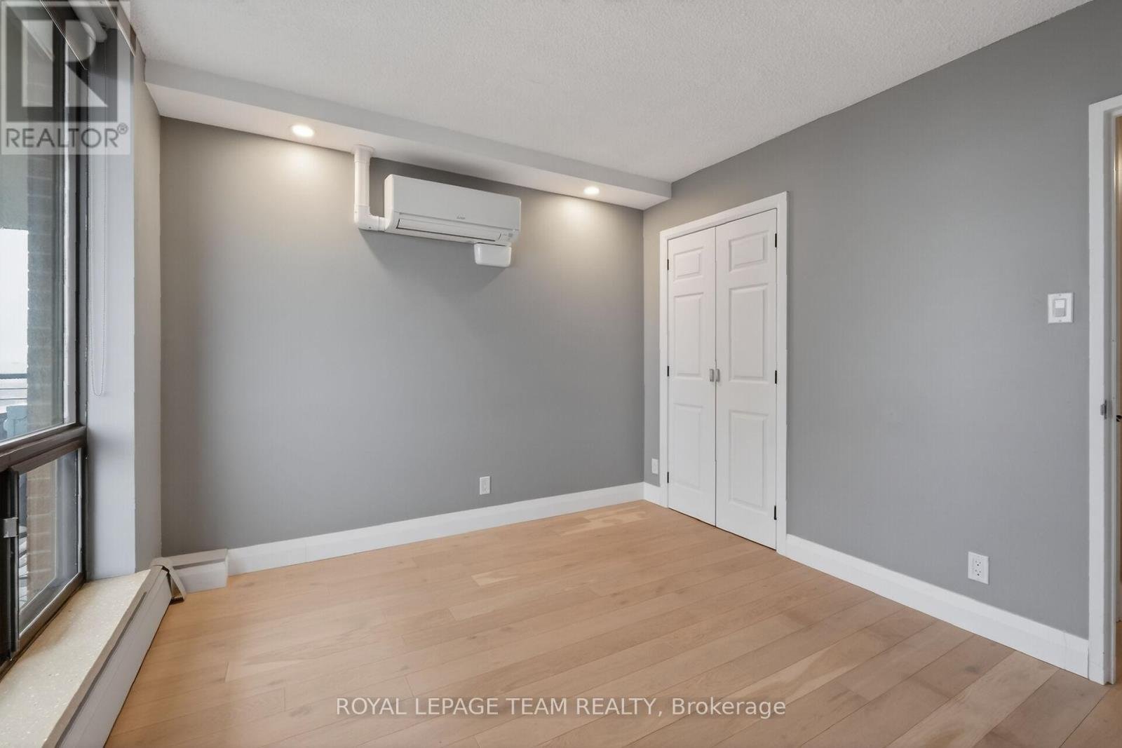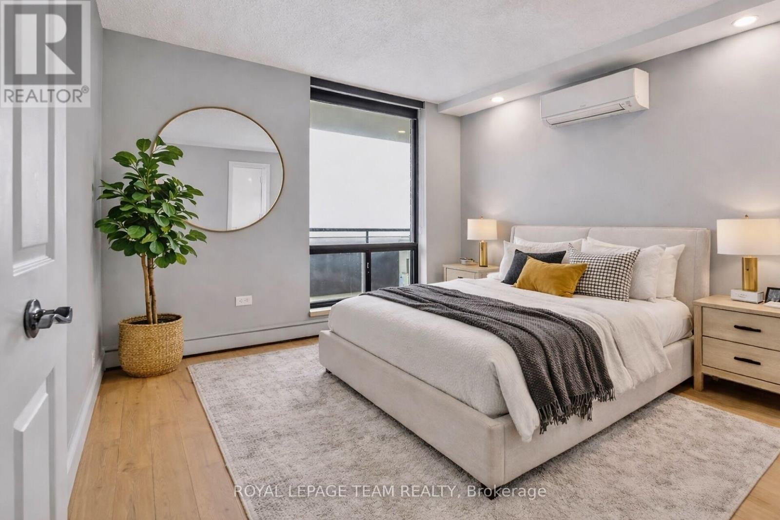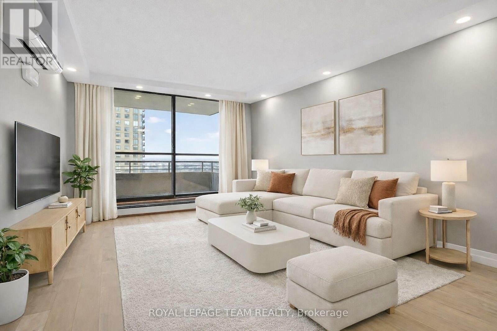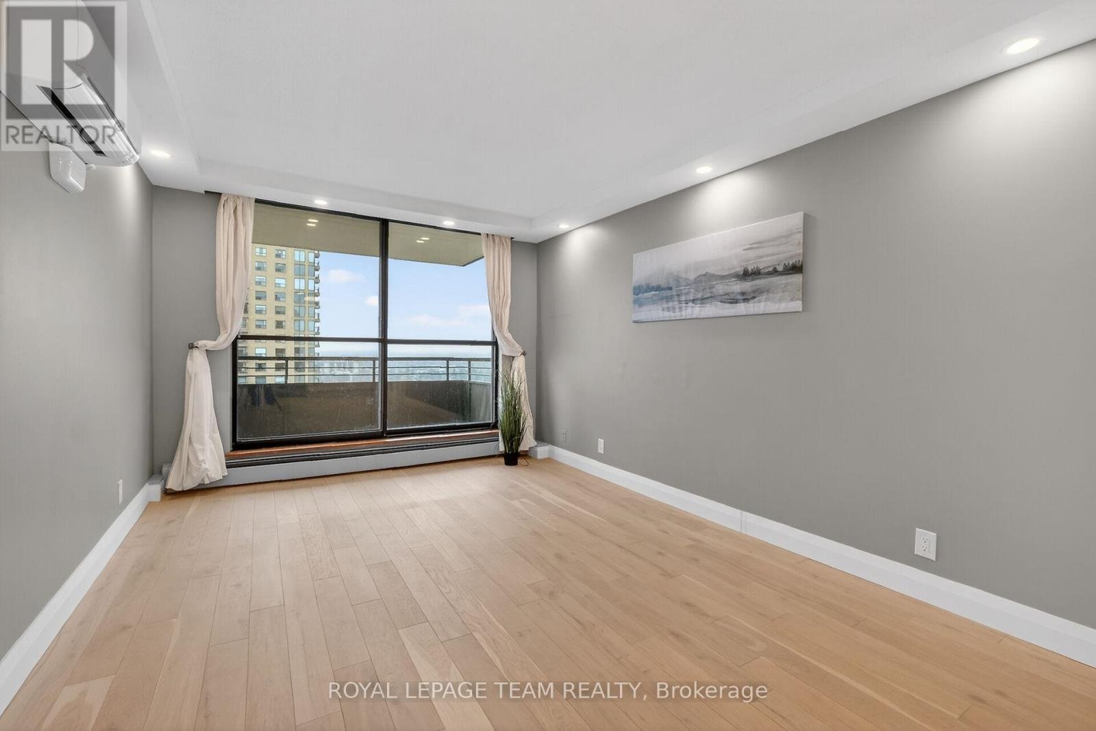 Stop the car! A gorgeous, beautifully updated two-bedroom apartment at The Highlands. This is arguably the finest two-bedroom unit in the building, featuring high-end renovations completed in 2022 and resort-style, all-inclusive living.Gourmet Kitchen with a classic black-and-white theme, quartz countertops and premium built-in appliances, including a hidden Liebherr refrigerator, a hidden Smeg dishwasher, a microwave/oven combo, a steam oven, and a cooktop with a remote-controlled hood fan. Light engineered hardwood floors throughout. The dining room offers built-in shelving plus more cabinetry and a two-zone wine/beverage cooler, plus a dedicated storage space with an upright freezer. The living area and bedrooms feature smart lighting and pot lights. A stylish four-piece bathroom and two 2022 air conditioning units for summer comfort. The generously sized 19' x 6.8' balcony has tile flooring. The all-inclusive condo fee covers heat, hydro, water, building insurance, and access to fantastic amenities, including an outdoor pool, gym, games room, party room and library.An underground parking space completes this picture. The location is unbeatable, with shopping at your doorstep and easy access to the Ottawa River and NCC trails.