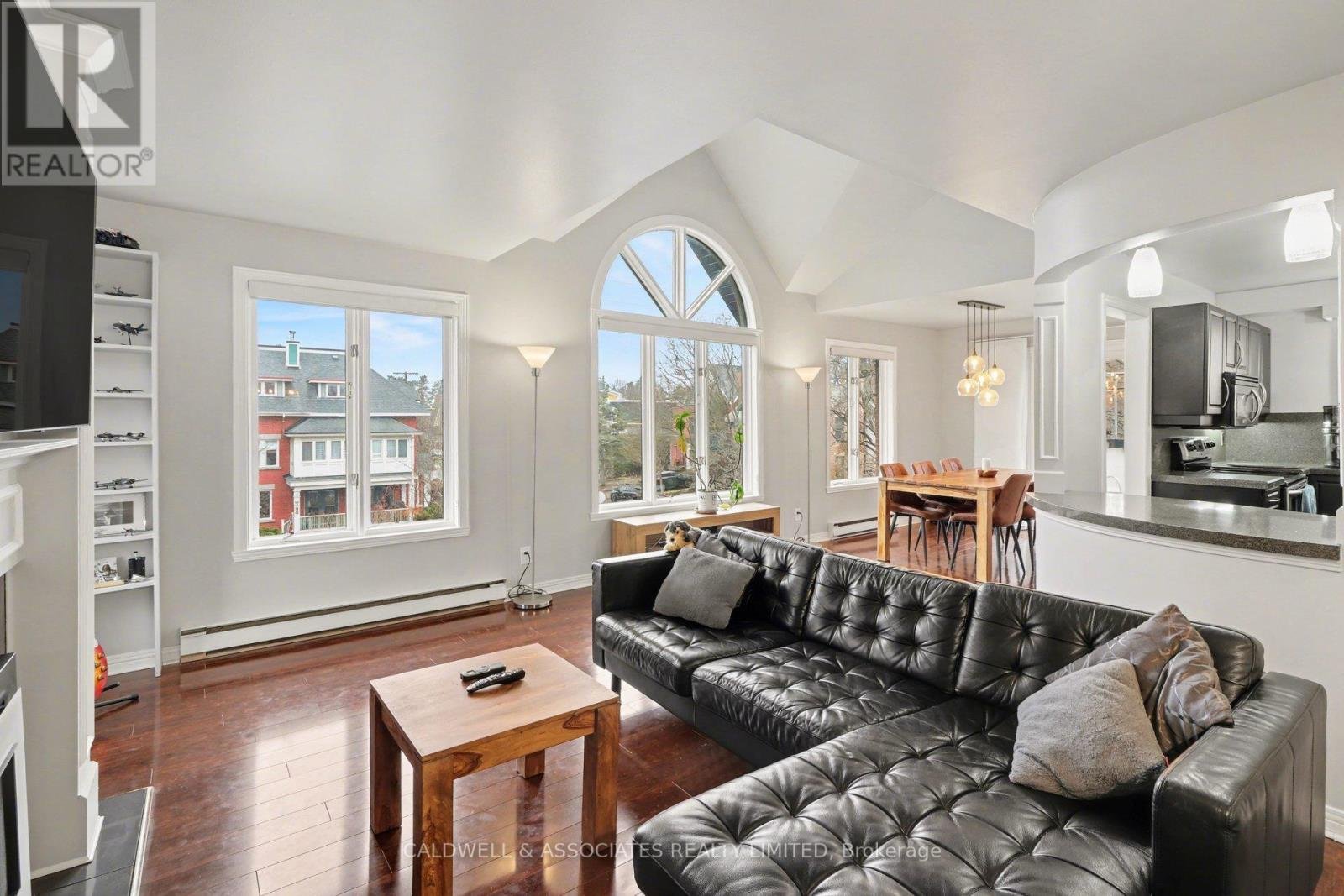 Exceptional property in the centre of New Edinburgh. This purpose-built tri-plex features one unit per floor. For sale is the top-floor unit, a walk-up with two bedrooms and a den. Its large windows provide stunning vistas and engulf your living space with sunshine. The high ceilings, gas fireplace that is flanked by built-in bookcases, and gorgeous hardwood floors are a terrific backdrop for a comfortable lifestyle. Two spacious bedrooms, a nice-sized den (could double as a bedroom), 2 bathrooms, and an efficient kitchen make this a bungalow-sized condo in the sky. To enjoy the good weather, there is a large private balcony with an awning. The property's beautifully maintained garden is a staple showpiece in the neighbourhood - an exceptional property at an exceptional location.