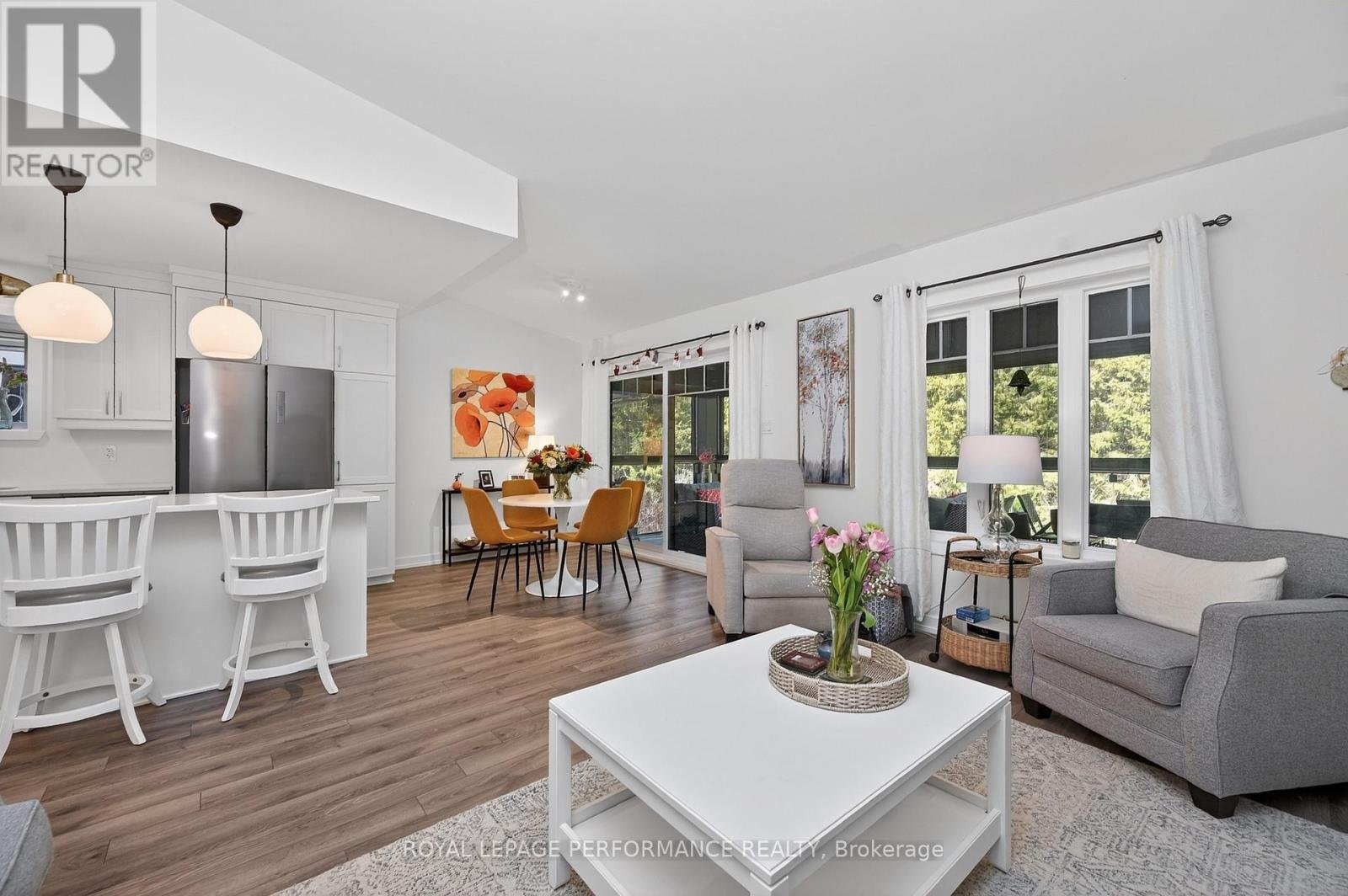 Welcome to 83 St. Moritz Trail, Unit 202 this showstopper is a 10! This well appointed upper end unit condo offers 2 bedrooms, 1 bathroom, and an enclosed terrace overlooking mature trees, an inviting and private setting. Step into a bright, open concept layout featuring a modern kitchen with stainless steel appliances, quartz countertops, pendant lighting, and a spacious island with ample storage. The kitchen flows seamlessly into the dining and living areas, creating an ideal space for both everyday living and entertaining. The dining area is perfectly positioned beside sliding doors leading to the terrace, allowing for effortless indoor outdoor living and al fresco dining.The living room is warm and welcoming, highlighted by a cozy fireplace, while radiant in floor heating adds year round comfort underfoot. The primary bedroom offers a walk in closet and a charming sitting nook, perfect for relaxing. A well-sized second bedroom and a versatile den or bonus space with a pocket door provide flexibility for guests, a home office, or additional living space.The spa inspired 5 piece bathroom features a freestanding soaking tub and separate shower, with conveniently located laundry tucked behind closet doors for a clean, functional design. Parking is right at your door. Located close to dining, shopping, and with easy highway access, and just moments from the East Castor River and Richelieu Park this tranquil area allows an appreciation of nature. This home offers a peaceful lifestyle with nature at your doorstep while remaining connected to everyday amenities.