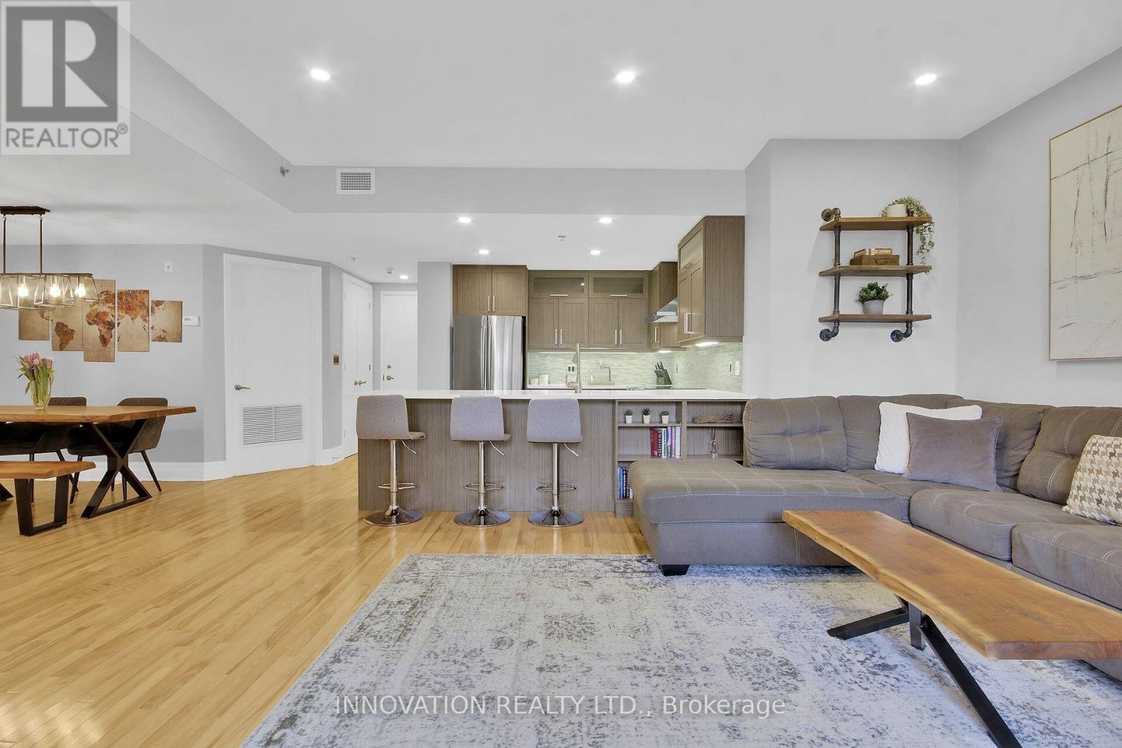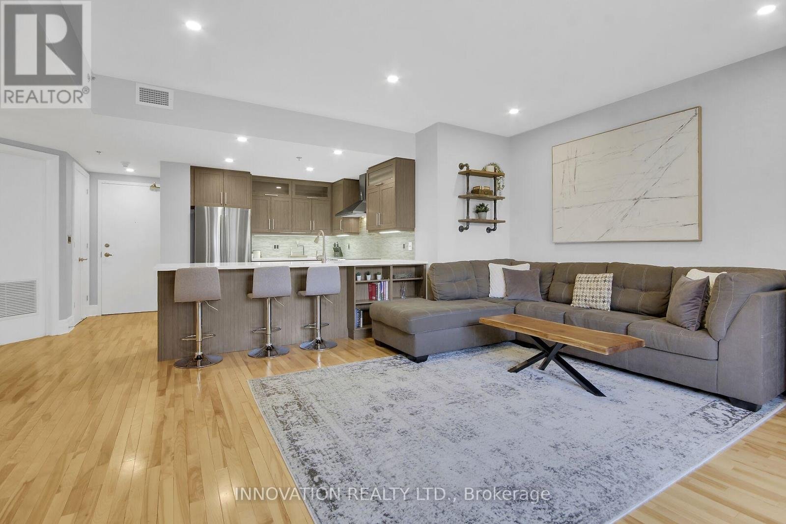 Welcome to 457 McLeod Street, Suite 104, located in the heart of Ottawa's vibrant Centretown. This bright and inviting, main-level 2 bedroom unit boasts almost 1,100 sqft with contemporary hardwood throughout. Open concept layout with cozy gas fireplace, large living area, and expansive, private and partially covered outdoor terrace, with natural gas BBQ hookup. Modern renovated kitchen features a large breakfast bar, quartz countertops, stainless steel appliances and recessed lighting. Primary bedroom offers a quiet retreat with a generous walk-in closet. Updated 4 piece bathroom. In-unit laundry. Located in one of Ottawa's most walkable areas just steps from shops, cafes, restaurants, and public transit.
