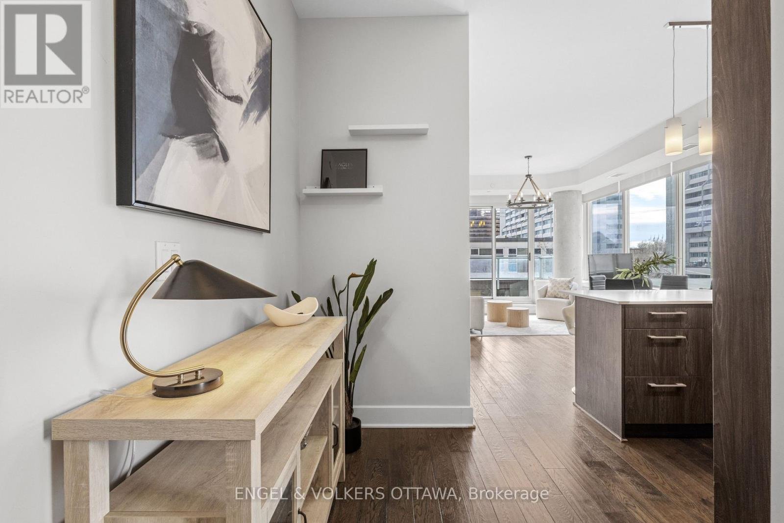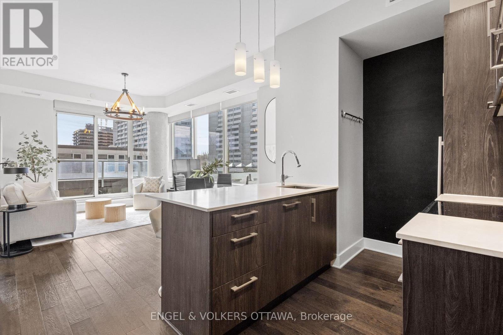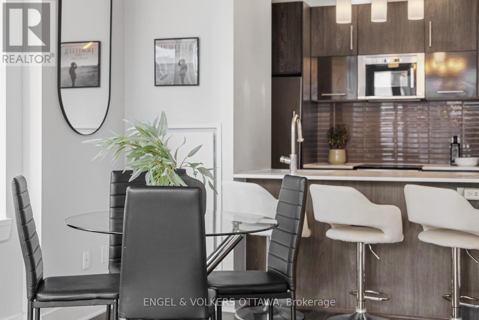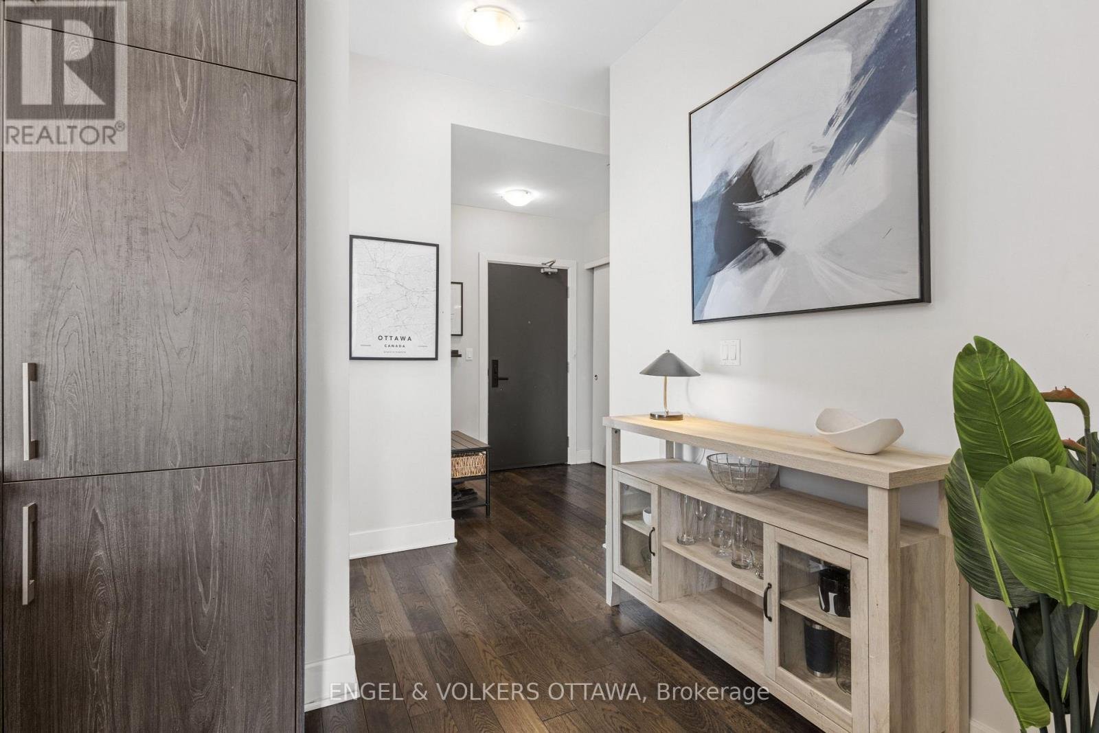 Experience refined urban living at The Bowery, a striking architecturally designed residence in the heart of Centretown, just steps to the Lyon LRT and Ottawa's best dining, shopping, and amenities. This thoughtfully designed 2-bedroom, 2-bathroom corner suite offers 846 sq.ft. of interior space complemented by a private 112 sq.ft. west-facing terrace, perfect for enjoying afternoon sun and evening sunsets. The bright, open-concept layout features 9-ft ceilings, expansive windows, and hardwood flooring throughout, creating a warm yet modern living space. The sleek kitchen is equipped with stainless steel appliances, stone countertops, and a peninsula with seating, seamlessly connecting to a flexible living and dining area suited for both everyday living and entertaining. The primary bedroom includes a well-appointed closet and a contemporary en-suite with a glass walk-in shower, while the second bedroom and full bath offer versatility for guests, a home office, or additional living space, with in-suite laundry adding everyday convenience. Residents of The Bowery enjoy an exceptional suite of amenities including an indoor rooftop saltwater pool, sauna, fully equipped fitness centre, party room with dining space, and a rooftop terrace with communal BBQs, along with visitor parking, guest suites, and bike storage, all within a bold, design-forward building known for its modern aesthetic and vibrant community atmosphere in one of Ottawa's most walkable neighbourhoods.