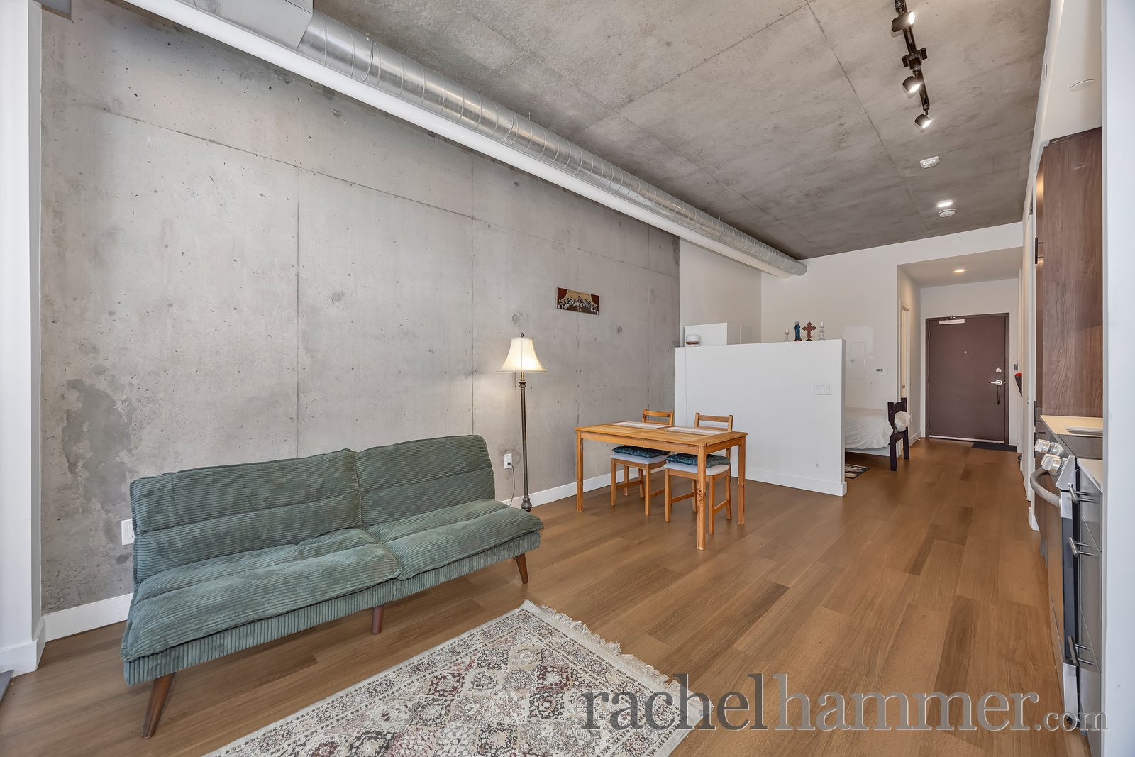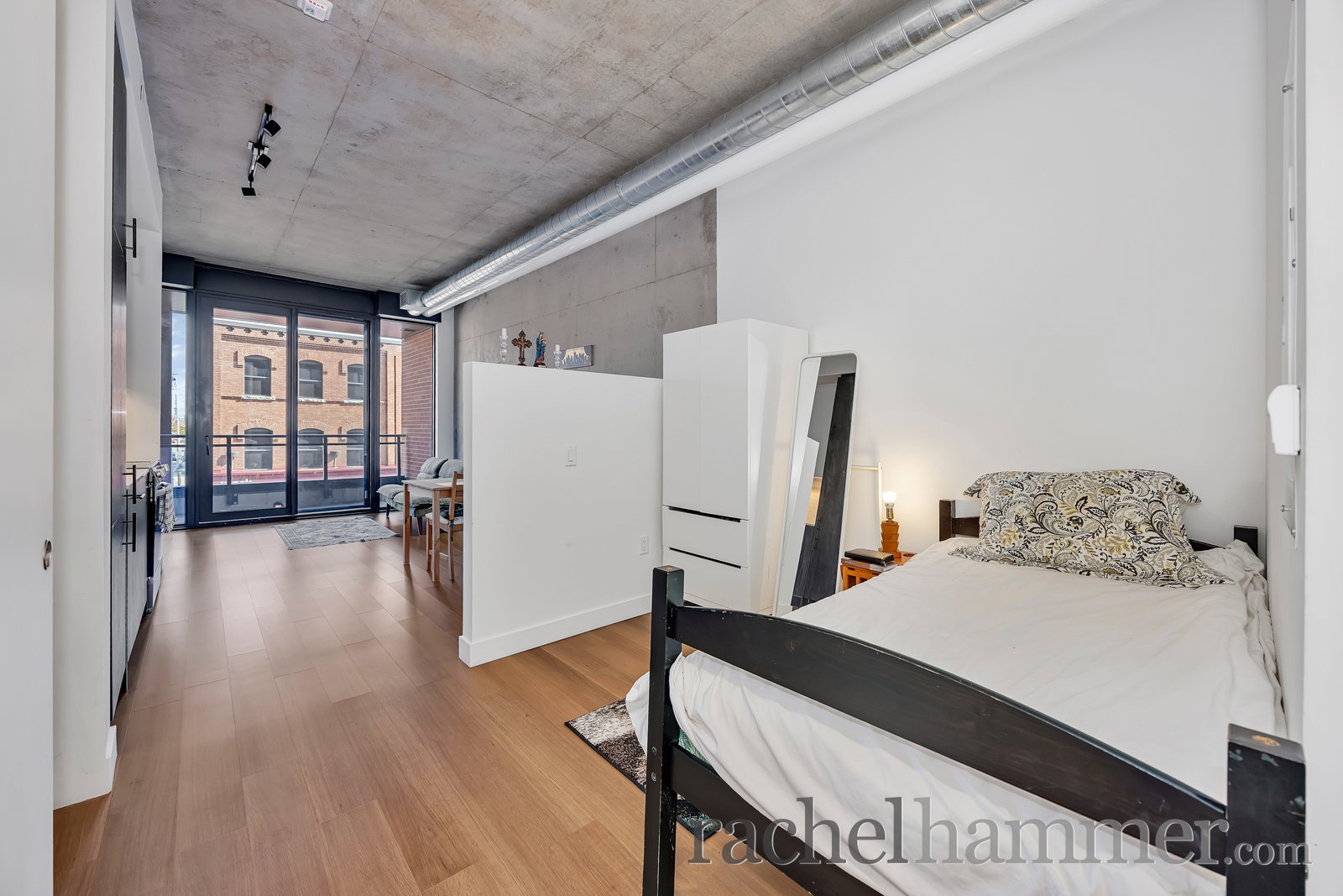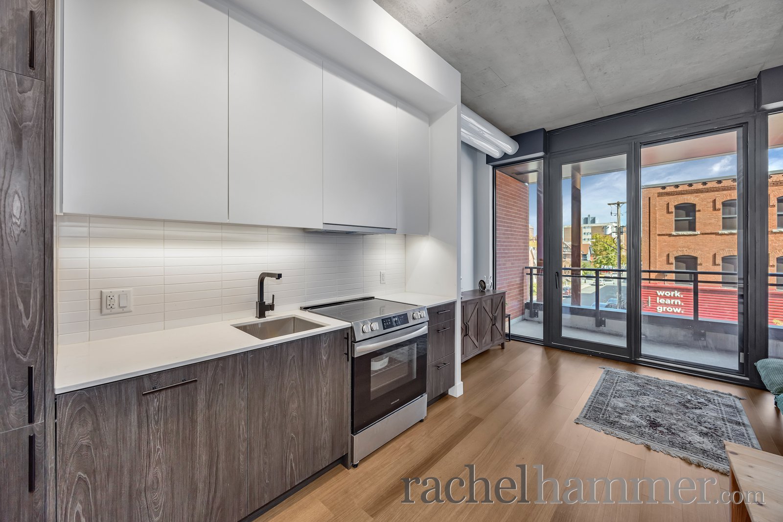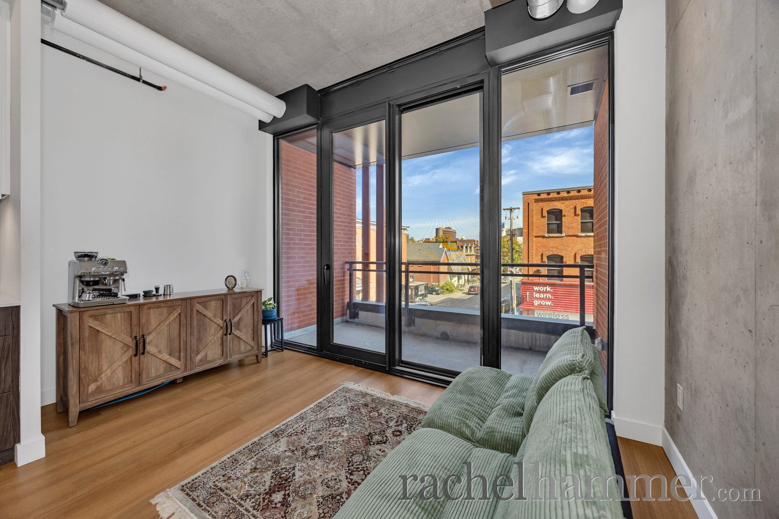 This 1 bedroom + study condo (Unit 210) offers the ultimate downtown lifestyle. The bright, open-concept layout features industrial-inspired exposed concrete and soaring 10’ ceilings, with floor-to-ceiling windows flooding the space with natural light. The modern kitchen is both sleek and functional, showcasing stainless steel appliances, quartz countertops, and custom cabinetry—perfect for cooking, entertaining, or enjoying your own space.