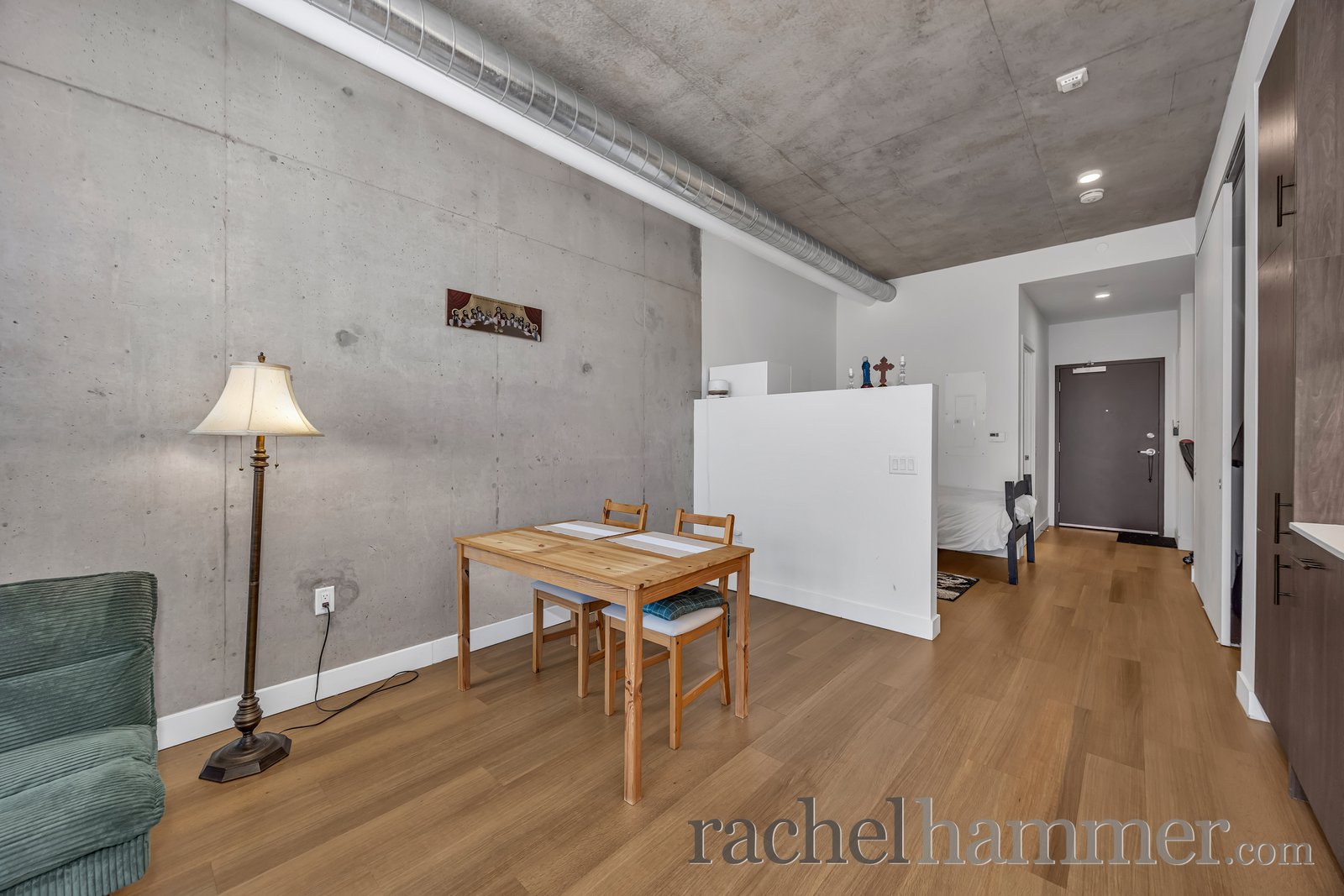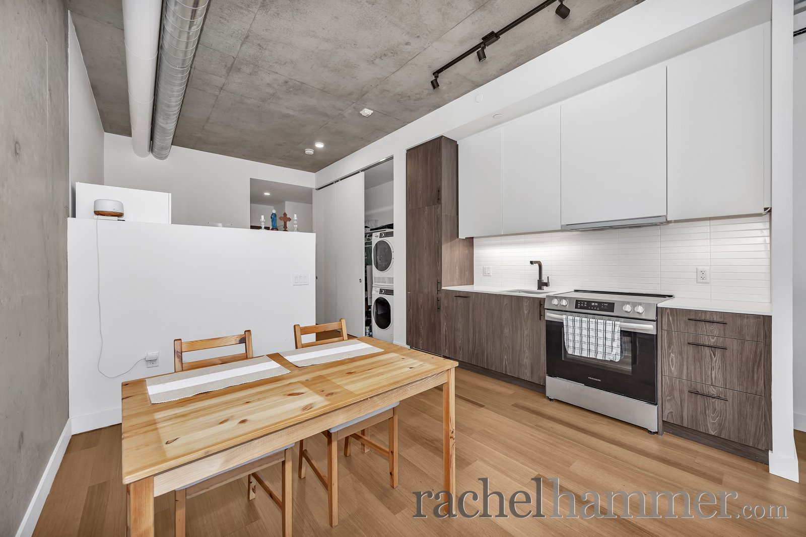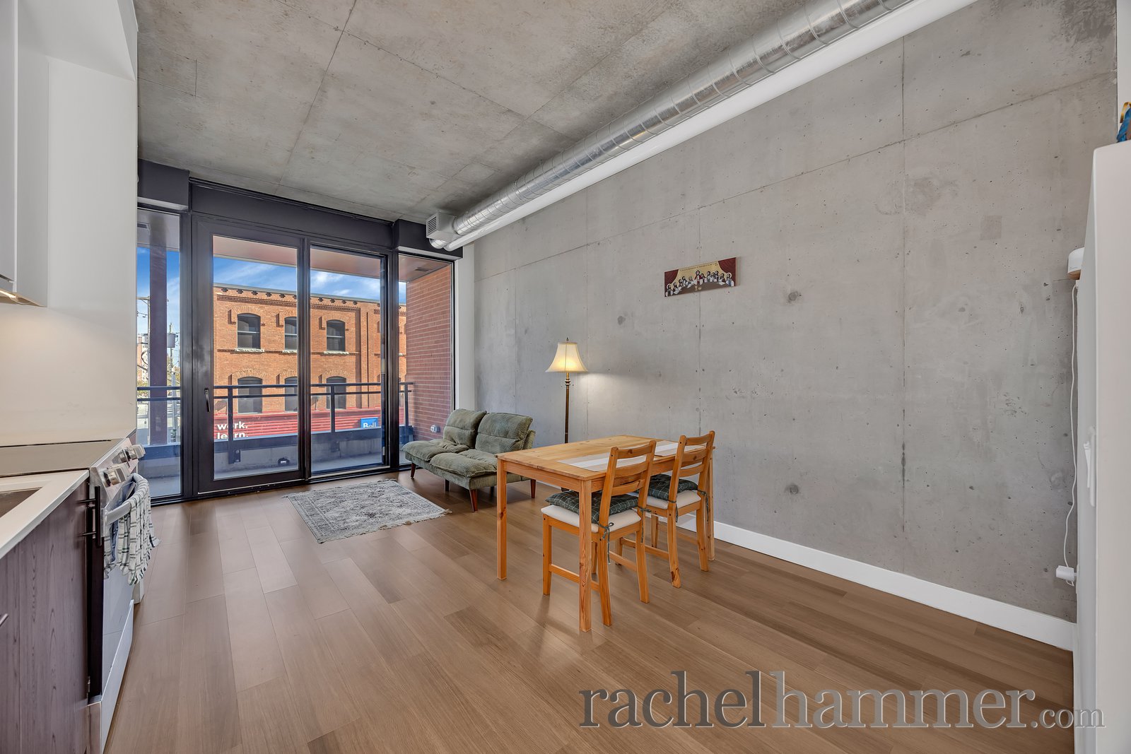 This 1 bedroom + study condo (Unit 210) offers the ultimate downtown lifestyle. The bright, open-concept layout features industrial-inspired exposed concrete and soaring 10’ ceilings, with floor-to-ceiling windows flooding the space with natural light. The modern kitchen is both sleek and functional, showcasing stainless steel appliances, quartz countertops, and custom cabinetry—perfect for cooking, entertaining, or enjoying your own space.