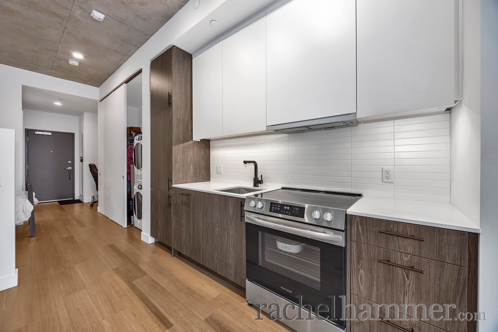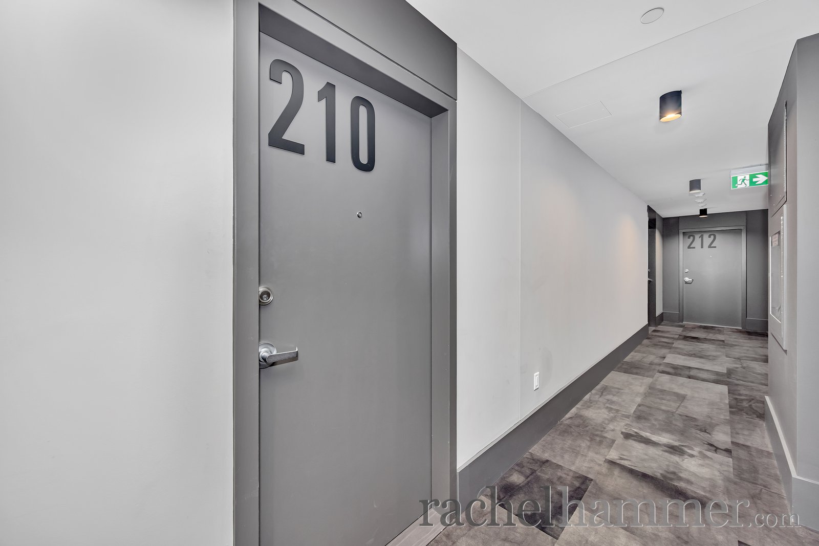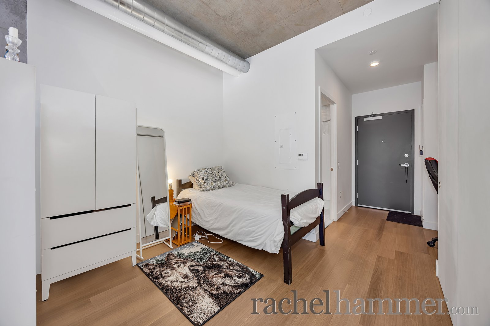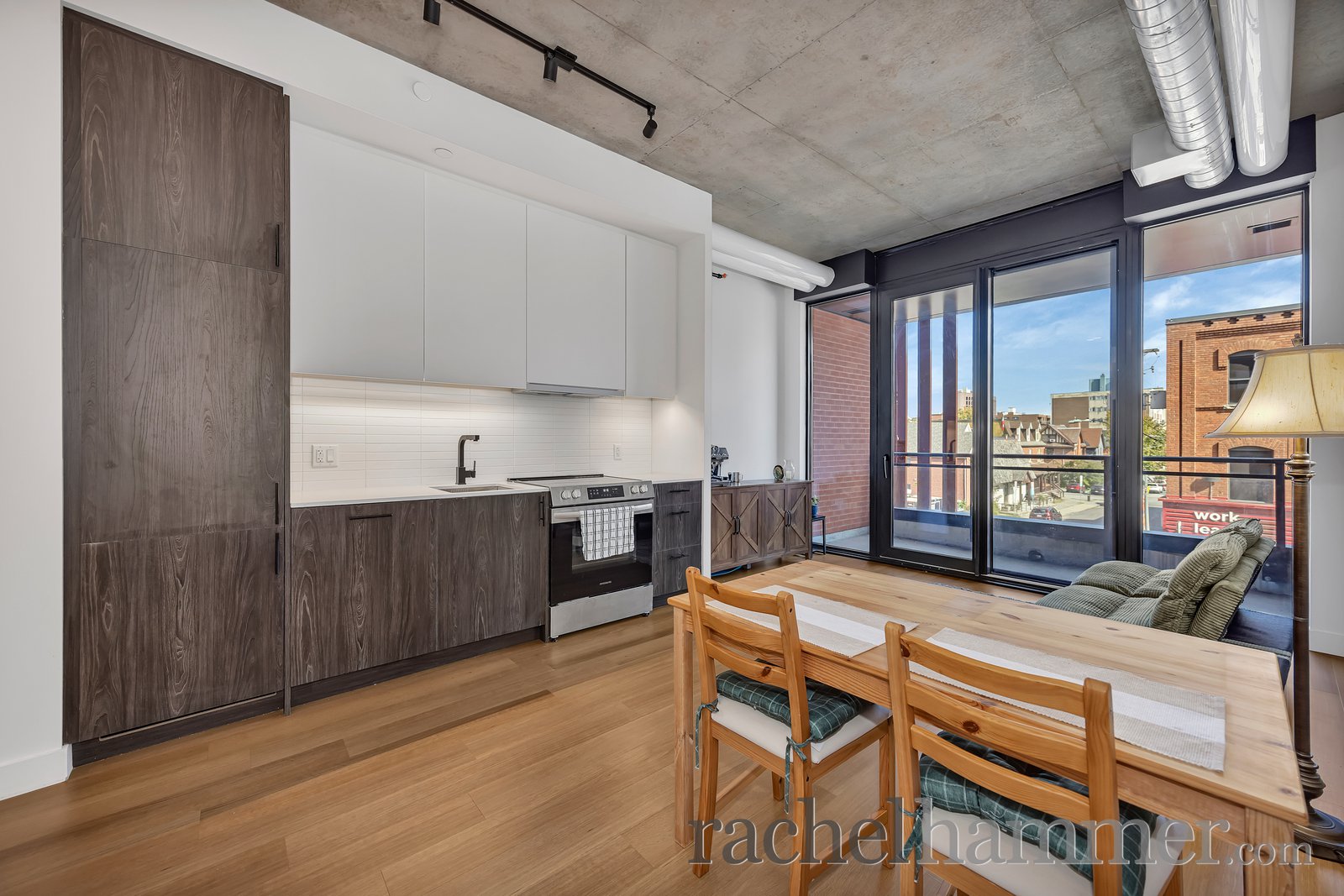 This 1 bedroom + study condo (Unit 210) offers the ultimate downtown lifestyle. The bright, open-concept layout features industrial-inspired exposed concrete and soaring 10’ ceilings, with floor-to-ceiling windows flooding the space with natural light. The modern kitchen is both sleek and functional, showcasing stainless steel appliances, quartz countertops, and custom cabinetry—perfect for cooking, entertaining, or enjoying your own space.