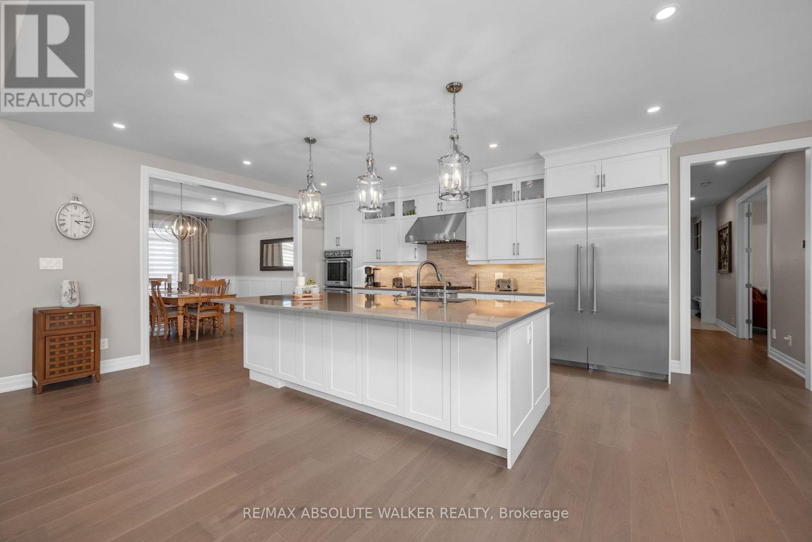 Step into this stunning custom John Gerard bungalow, featuring an expansive 3400 sqft of main-floor living space, enhanced by over 2000 sqft of beautifully finished basement. Exuding luxury and sophistication, this full brick residence is adorned with high-end finishes throughout. The main floor showcases, timeless trim work, elegant hardwood floors, tile, and soaring ceilings ranging from 9 to 12 feet, contributing to the home's grand ambiance. A fully functional main floor laundry room and pantry room offer convenience, while four spacious bedrooms (one currently used as an office) on the main level, along with a fifth bedroom and full washroom in the basement, accommodate families of all sizes.The gourmet kitchen is a culinary delight, equipped with top-tier Thermador appliances, soft-close drawers, and cupboards, and adorned with sleek quartz countertops in the kitchen and all washrooms. The basement is an entertainer's paradise, boasting a large recreation room, wet bar, billiards area, full gym (easily convertible to a sixth bedroom), and ample storage space with direct access to the triple-car garage. The property is situated on an oversized 1.1 acre lot, larger than neighboring properties, and includes a wooded area that ensures privacy and seclusion. This exceptional property perfectly combines style, comfort, and functionality, making it an ideal place to call home.