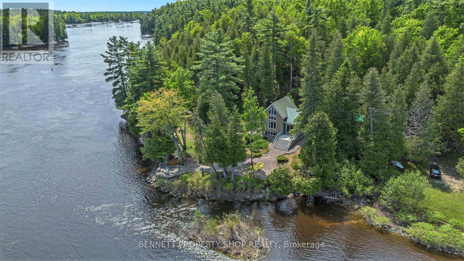 Idyllic Post and Beam Waterfront Cottage on the Ottawa River - a fairytale-like property nestled on 5.37 private, forested acres with an impressive 426 feet of pristine water frontage. Built in 1998 by renowned builder Normerica, this post and beam cottage-style home blends timeless craftsmanship with comfort and charm, offering an affordable opportunity to enjoy the waterfront lifestyle in a setting that feels worlds away. The cottage features up to five bedrooms and showcases hardwood flooring throughout completely carpet-free for easy maintenance and a clean, natural aesthetic. A spacious family room with an efficient propane stove/fireplace provides a cozy heart to the home, while a rear deck offers the perfect space to unwind or entertain amid the sights and sounds of surrounding nature. Outside, you'll find a gently flowing stream with a waterfall and covered bridge that adds to the serene, storybook atmosphere. The property is very well forested with mature trees, creating a private sanctuary rich with wildlife and natural beauty. A well-kept shed provides additional storage, and thoughtful upgrades such as a generator link, central vacuum, sump pump with battery backup, drilled well, and a reliable septic system ensure peace of mind. Pride of ownership is evident throughout this neat and tidy property. Could be turn-key as the furniture is negotiable, making it easy to move right in and begin enjoying all this special property has to offer. Property is accessible by Rex Lane and Burton Lane - both private roads not plowed in the Winter. For that reason, the property is Seasonal Access only. Whether you're looking for a quiet retreat, a family cottage, or a place to build lifelong memories, this riverfront haven is a rare and exceptional find.