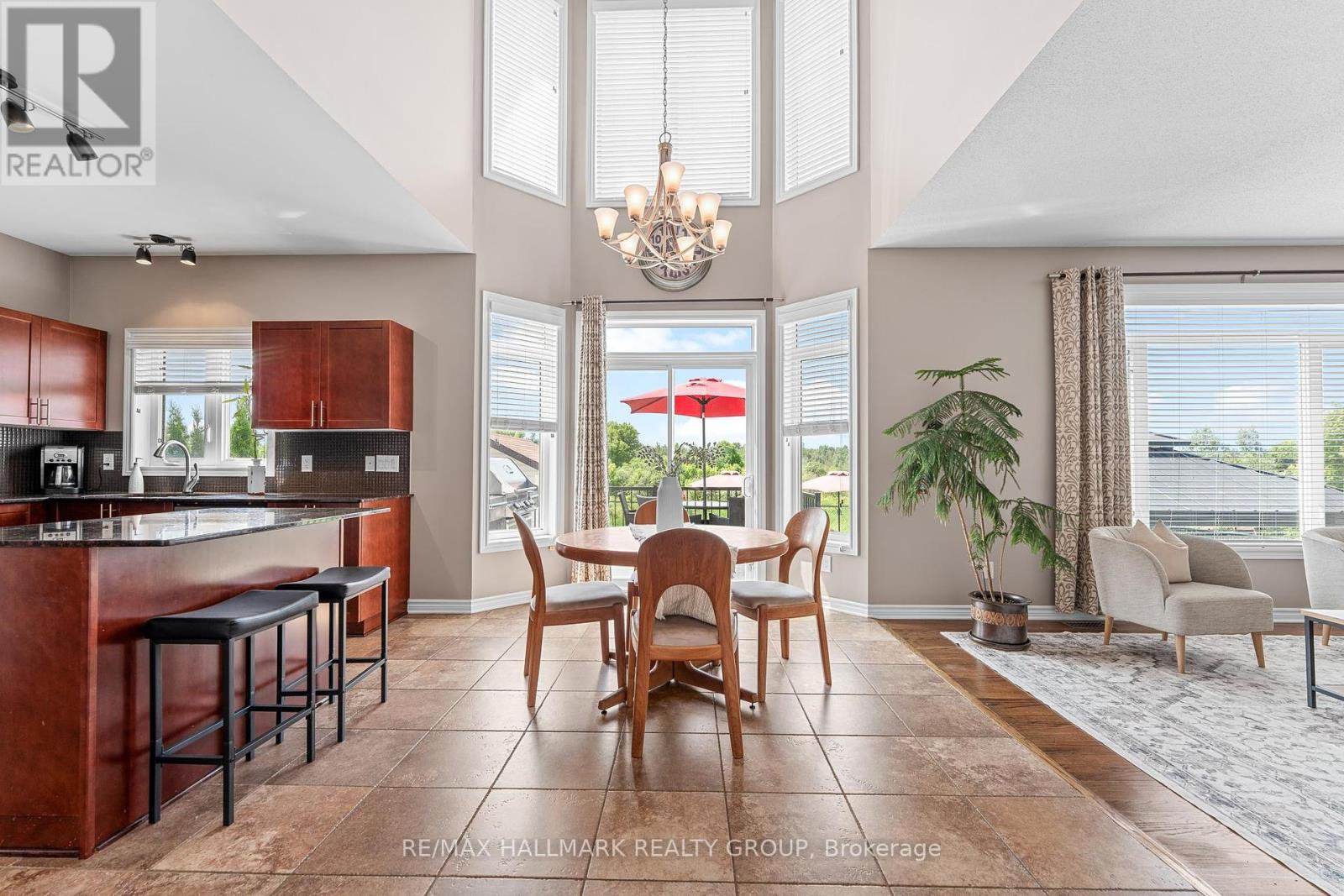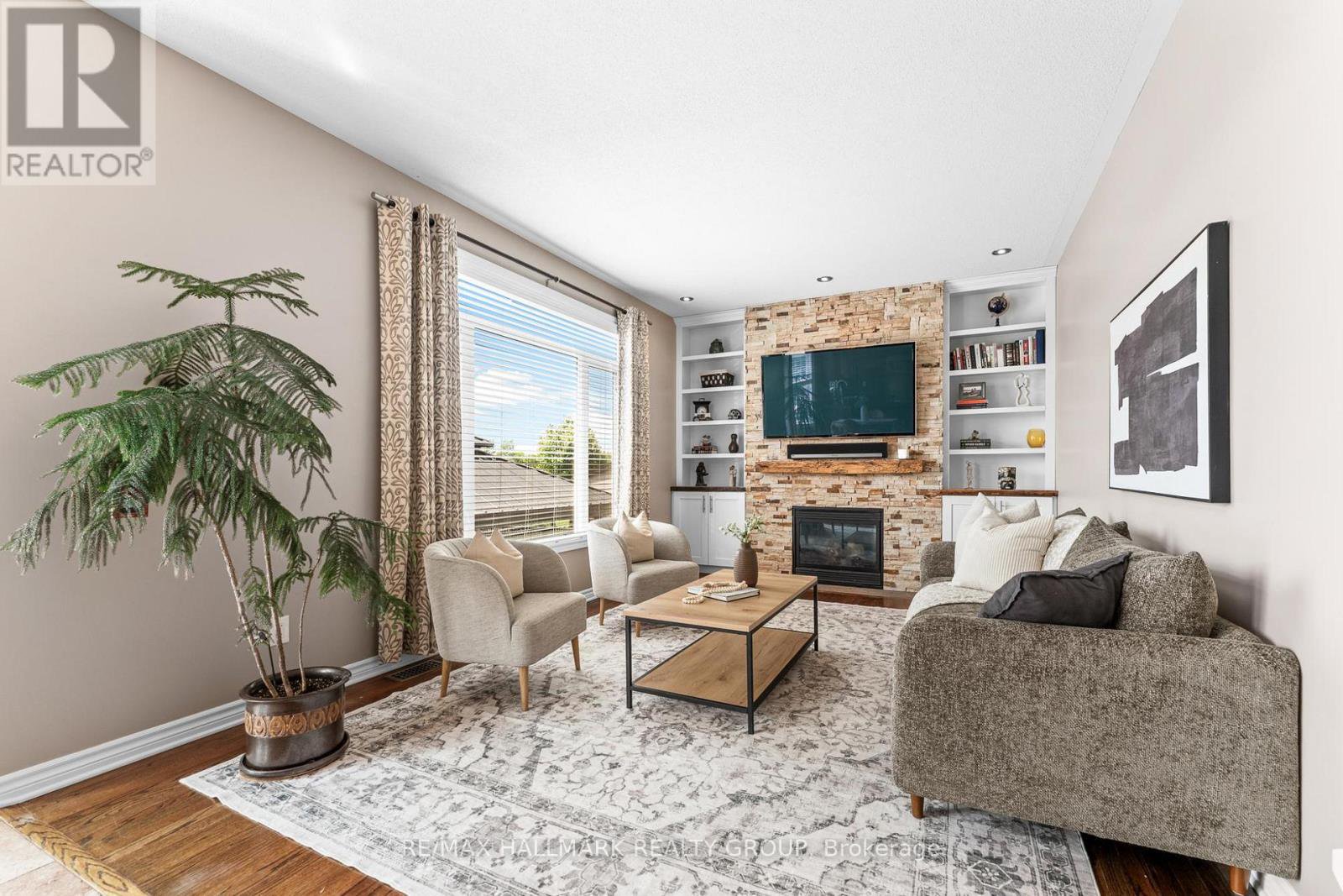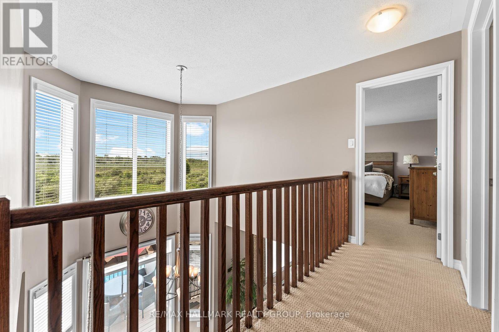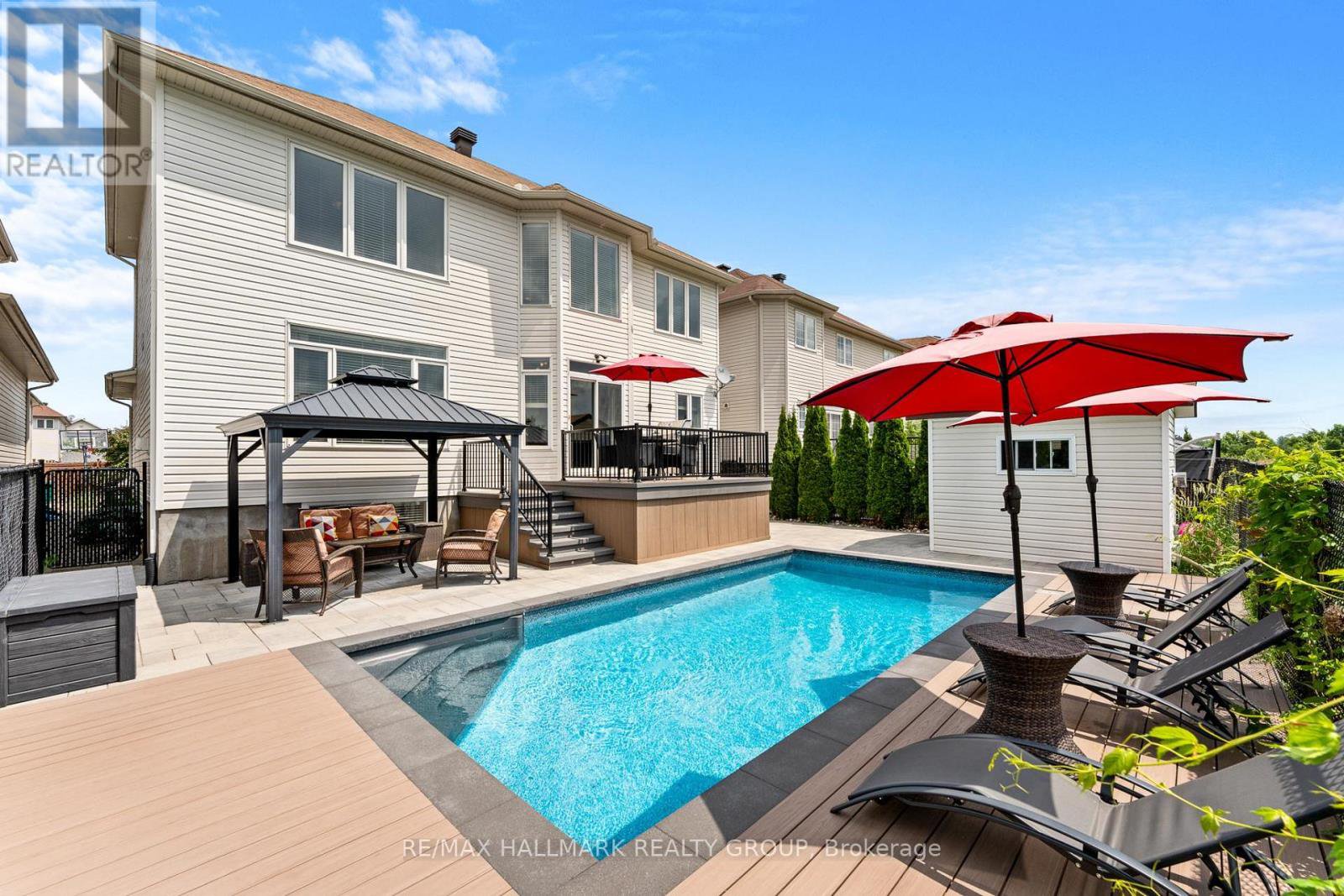 Discover this stunning 4+1 bedroom home with a spectacular backyard retreat, nestled on a quiet street in sought-after Bradley Estates. Backing onto tranquil NCC greenspace and the scenic Prescott-Russell Trail, this home offers unparalleled access to nature trails and is just steps away from several parks and a splashpad. A charming front verandah welcomes you into the open-concept living and dining room, boasting elegant wainscotting. Beautiful kitchen features granite counters, stainless steel appliances, a corner pantry, and an island with breakfast bar. The inviting eating area is framed by soaring ceilings and dramatic bay windows that extend to the second level, flooding the space with natural light. Desirable main floor family room anchored by a cozy gas fireplace and custom built-in shelving. Upstairs, the spacious hallway is open to below and leads to a generous primary suite with double closets and 5-piece ensuite including a soaker tub and separate shower. The second level is complete with three additional bedrooms, a full 4-piece main bathroom and laundry for your convenience. The carefully thought-out finished basement offers an abundance of well allocated storage spaces, a large recreation room with plenty of space for a home office or gym area, plus a fifth bedroom and additional full bath ideal for hosting guests. Step outside to the sun-filled, south-facing backyard oasis, beautifully landscaped with composite deck, interlock patio, and inground pool all set against the serene backdrop of protected greenspace. Embrace a lifestyle where nature, community, and modern comfort converge this exceptional Bradley Estates home offers more than just a residence; it invites you to live your best life.