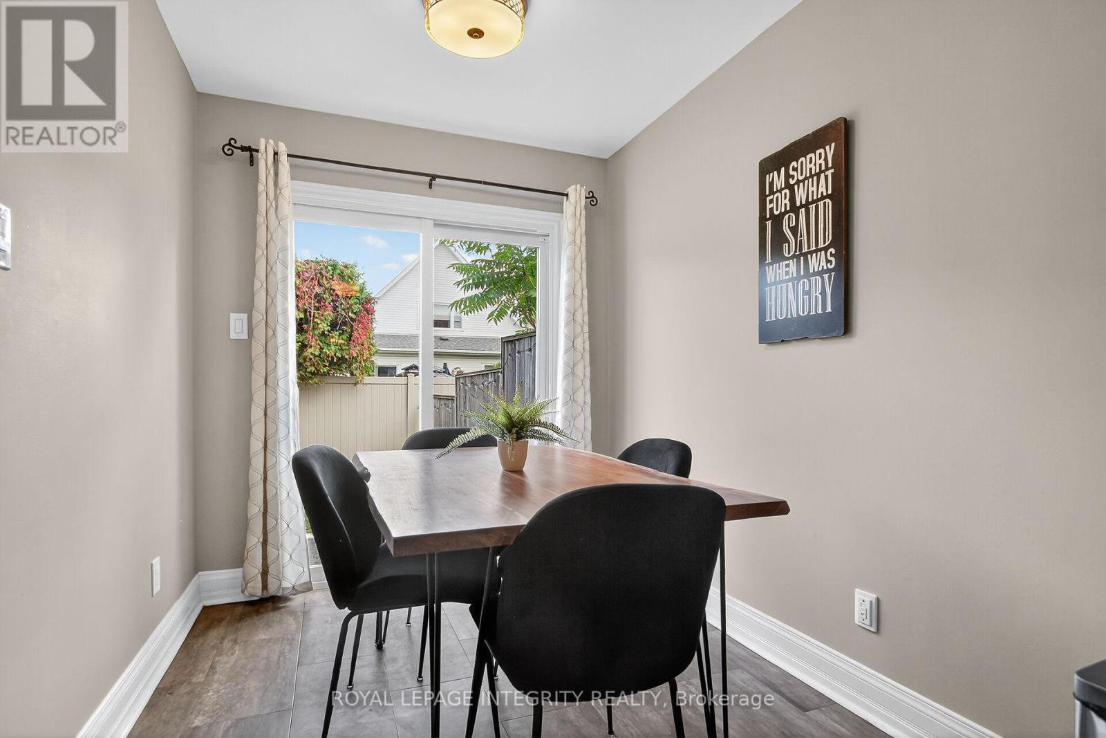 I would like to present this exceptional end-unit townhome, located on a mature, tree-lined, and family-friendly street. This meticulously maintained residence features hardwood flooring on the main level, which includes a formal dining room, a spacious and sunlit living room, an efficient kitchen with a separate eating area, a generous tiled foyer, and a large powder room. Upper floor offers a large master bedroom with a roomy walk-in closet, ensuite with standxalone tub. Two additional well-proportioned bedrooms, and a sizable four-piece bathroom. The basement has been fully finished and includes a private workout area and a media room, complete with barn doors for added privacy. Ample storage space and a dedicated laundry area are also available. Recent upgrades enhance the home's value and comfort, including three new bathrooms (2023), a new roof (2022), a new furnace (2021), new air conditioning (2021), new carpeting (2023), new tile in the front entrance (2023), most new windows (2024), and a new garage door (2024). Additionally, the finished basement features vinyl flooring, and both the front door and patio doors have been replaced within the last five years. The neighborhood is well-serviced by schools, shopping, public transportation, and parkland. Please note that all room sizes are approximate and are subject to verification.