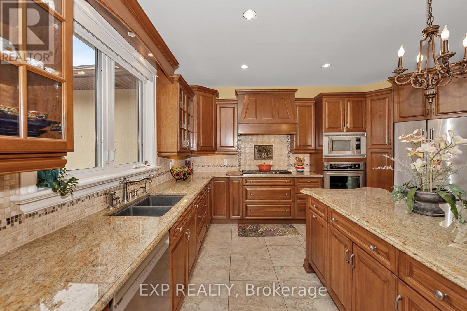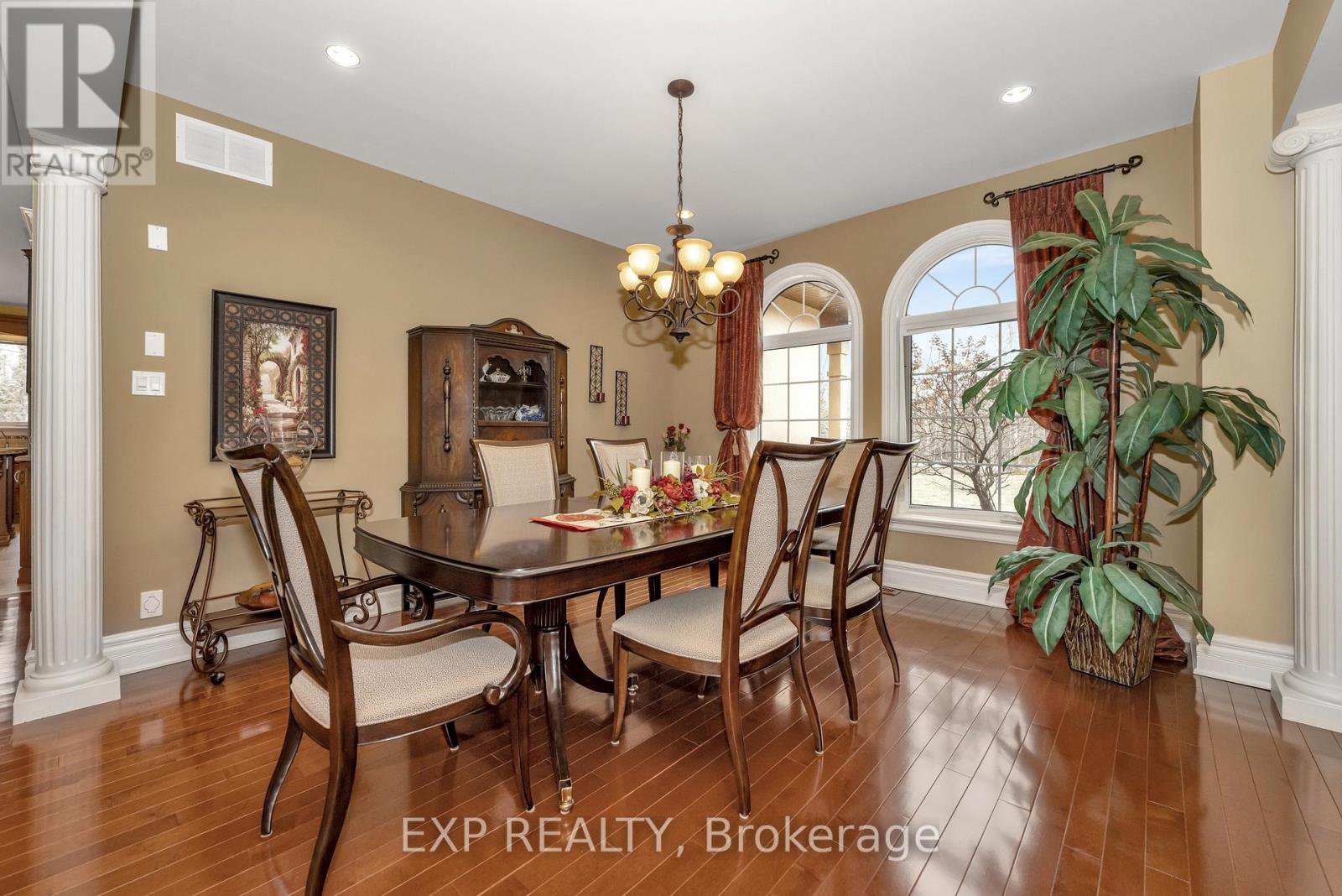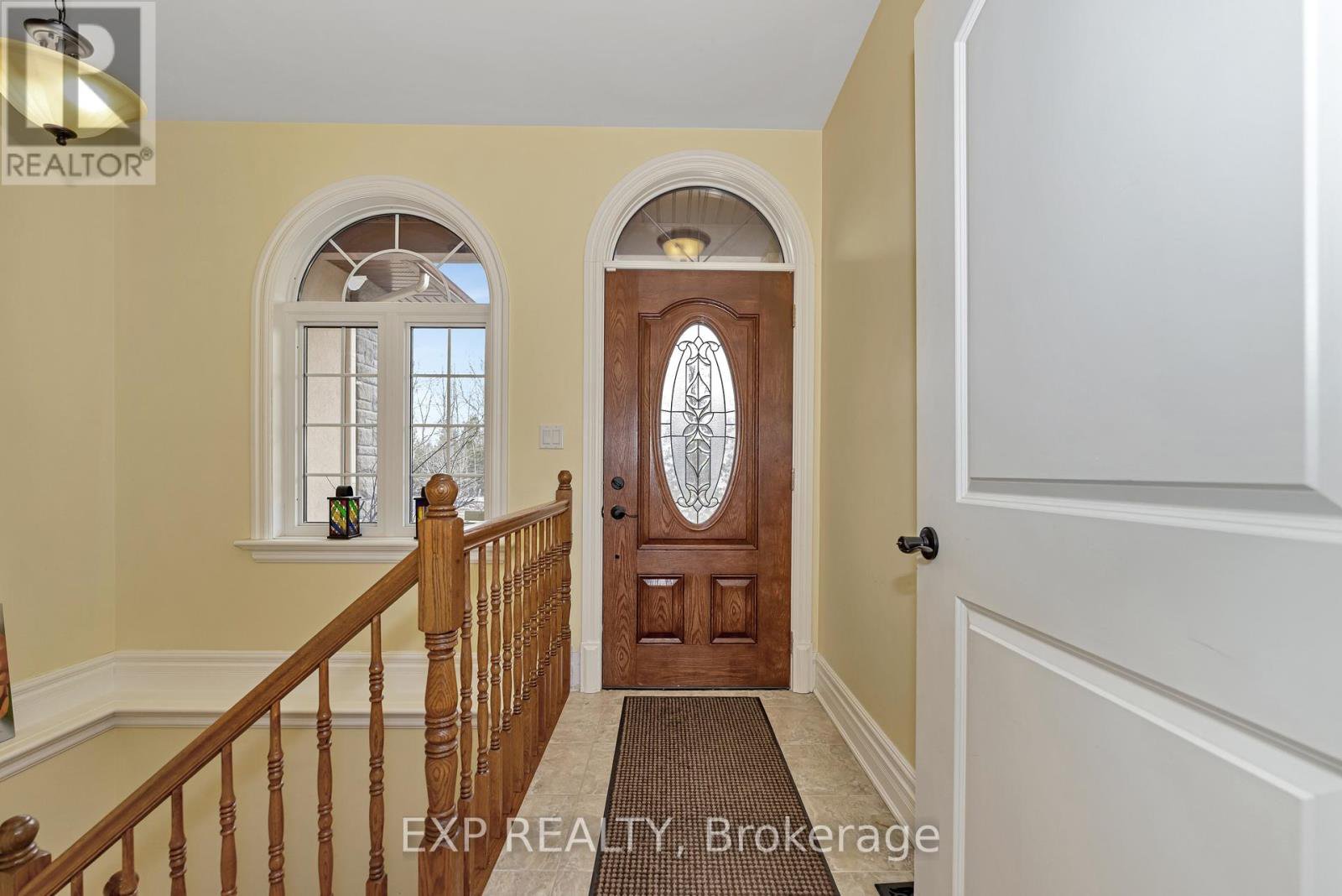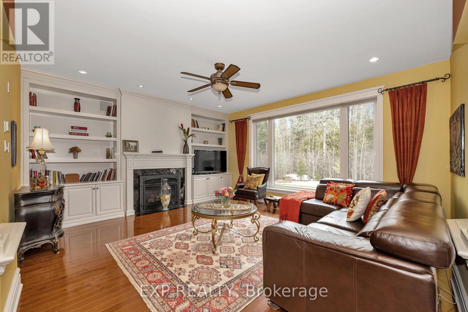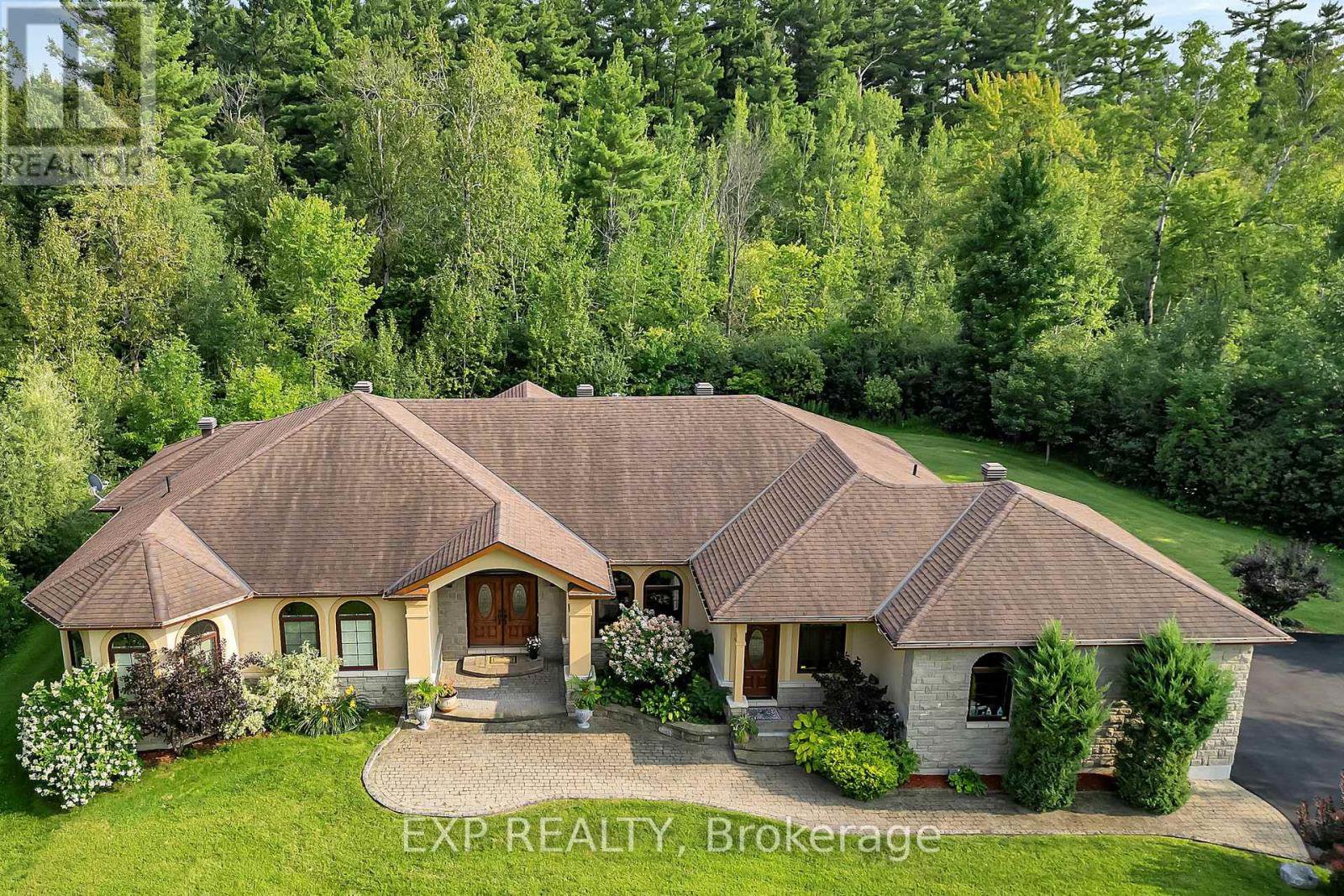 Located in the sought-after Arbourbrook Estates community in Carp, this custom-built bungalow with an oversized 2-car garage and the home offers over 5,000 sq. ft. of finished living space, including a full in-law suite with a separate entrance ideal for multigenerational living or rental potential. Set on a beautifully landscaped lot, the home features full interlock stonework from front to back, delivering exceptional curb appeal and low-maintenance durability. Inside, you'll find soaring 12-foot ceilings in the foyer and hallway, and a stunning 14-foot cathedral ceiling in the living room. Solid wood doors and premium finishes throughout the main level highlight the quality craftsmanship. The gourmet kitchen is equipped with rich cabinetry, granite countertops, and opens into a warm and inviting family room with custom-built-ins and a fireplace mantel perfect for everyday living and entertaining. The main floor offers 3 spacious bedrooms, while the fully finished lower level includes 2 additional bedrooms, large look-out windows, fully equipped in-law suite with its own private entrance. Additional highlights include: Roof has 40-year shingles, A/C, Furnace, and hot water tank recently replaced. This home is truly worry-free. Conveniently located just minutes from Carp, Stittsville, and easy highway access, this exceptional home is a rare find that blends luxury and versatility.
