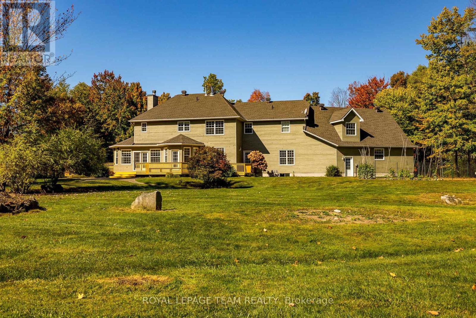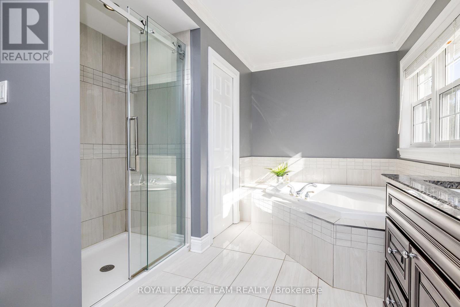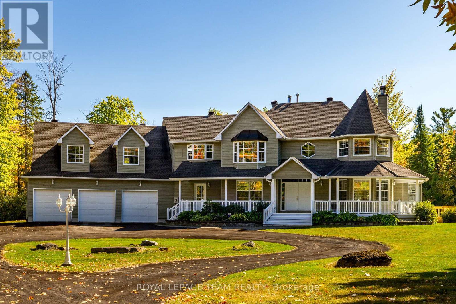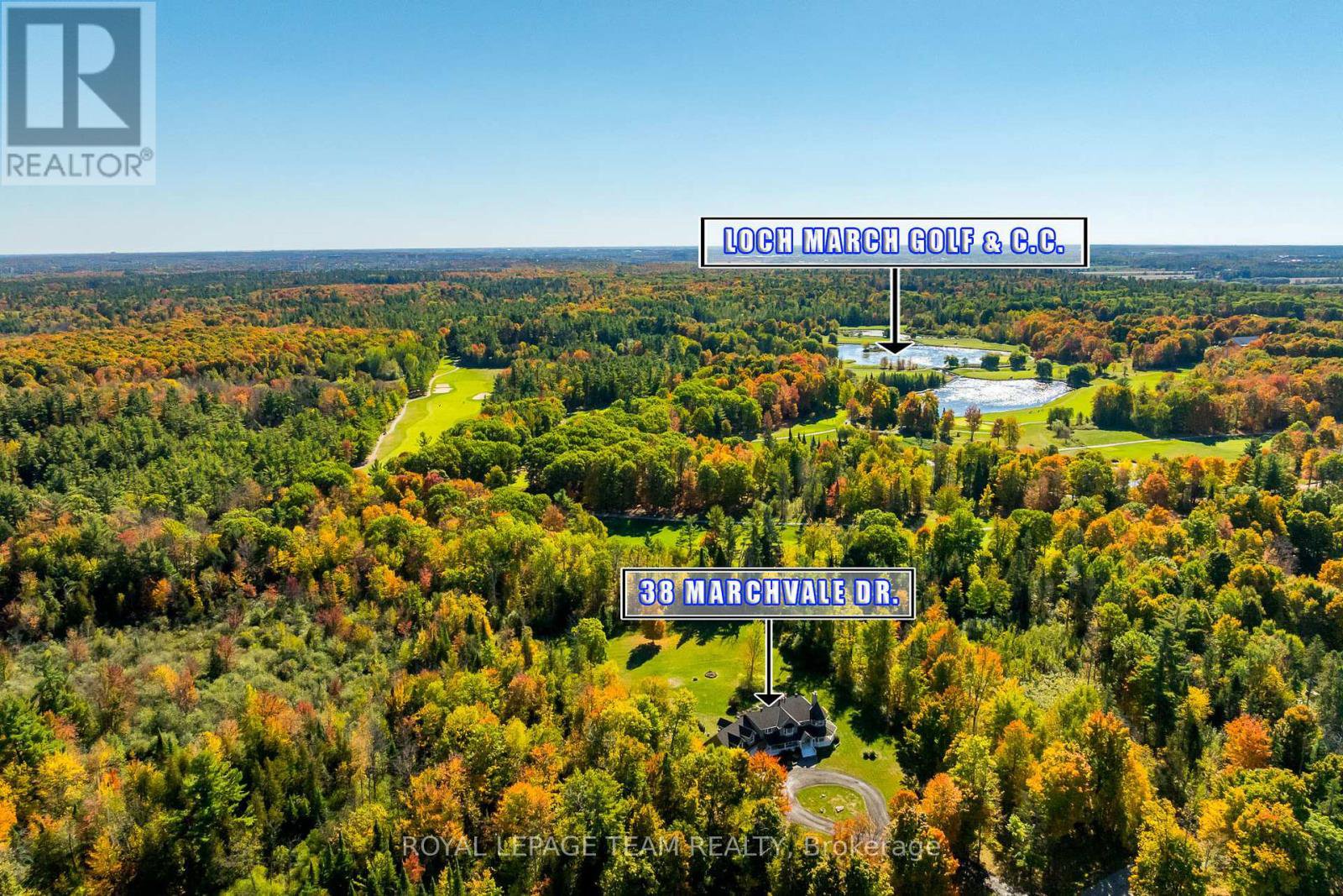 Welcome to an extraordinary retreat in prestigious Marchvale Estates, where over 4,100 sq. ft. of luxury living awaits on more than 3 acres of impeccably landscaped, private grounds. This custom-built residence combines timeless elegance with thoughtful family design, offering 5 bedrooms, 4 bathrooms, and a layout that perfectly balances everyday comfort with grand entertaining. Set back from the road along a picturesque tree-lined circular driveway, the home makes a striking first impression. A 3-car garage, dual front entrances, and dual staircases add both sophistication and multi generational living potential. Inside, natural light pours through abundant bay windows, showcasing sweeping views of the grounds. Three patio walkouts seamlessly connect indoor living spaces to the serene outdoors. The home boasts soaring 9ft ceilings, rich hardwood and ceramic floors, and a chefs kitchen. Formal and casual living areas offer flexibility for gatherings of any size, while a main-floor bedroom or office provides privacy and versatility. Upstairs, the lavish primary suite is a private sanctuary, complete with a spa-inspired 5-piece ensuite. A second private suite with its own ensuite and walk-in closet includes an adjoining bonus room; ideal for a playroom, media room, dressing roon, or teen retreat. Two additional bedrooms complete the family-friendly upper level. The fully finished lower level expands the living space beautifully with new flooring, direct access to the garage, ample storage, a bar and endless possibilities for a home gym, rec room, or guest accommodations. A geothermal system ensures year-round comfort with impressive energy efficiency. Outdoors, an irrigation system ensures lush, low-maintenance grounds, perfect for play and relaxation alike. Ideally located just 5 mins from Kanatas high-tech hub, top schools, golf & everyday amenities. With quick access to Highway 417, this estate offers the ultimate blend of privacy and convenience.