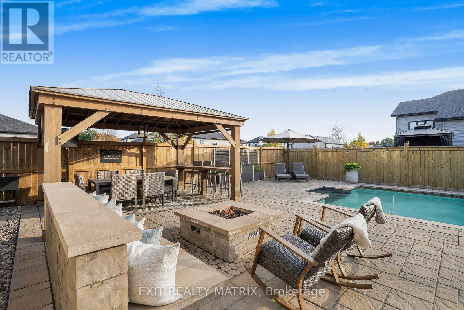 OPEN HOUSE, Sunday, October 5 2-4pm. Welcome to this beautifully updated two-storey home in the heart of Embrun. Offering 4+1 bedrooms and a host of modern upgrades, this property combines timeless charm with modern comfort. The main level is thoughtfully designed, featuring a bright and inviting living room with a cozy gas fireplace and a chef style kitchen with a center island, pantry, and abundant cabinetry. The seamless flow between spaces makes it perfect for family gatherings and hosting guests. Upstairs, the spacious primary suite includes a walk-in closet and ensuite. The finished basement expands the living space with oak stairs, a stylish wet bar, and a second fireplace an entertainers dream. Step outside to your private backyard retreat. This fully landscaped corner lot showcases a heated saltwater inground pool, hot tub, two gazebos, natural gas outdoor fireplace, gas BBQ hookup, and interlock with firepit and seating. The front yard was refreshed with new interlock and landscaping, adding striking curb appeal. Other updates include a modern laundry room and many thoughtful upgrades throughout, ensuring comfort and peace of mind. Every detail reflects pride of ownership and care. This is a great opportunity to own a gorgeous home in excellent condition, offering elegance, lifestyle, and exceptional entertaining spaces in a growing, sought-after community.